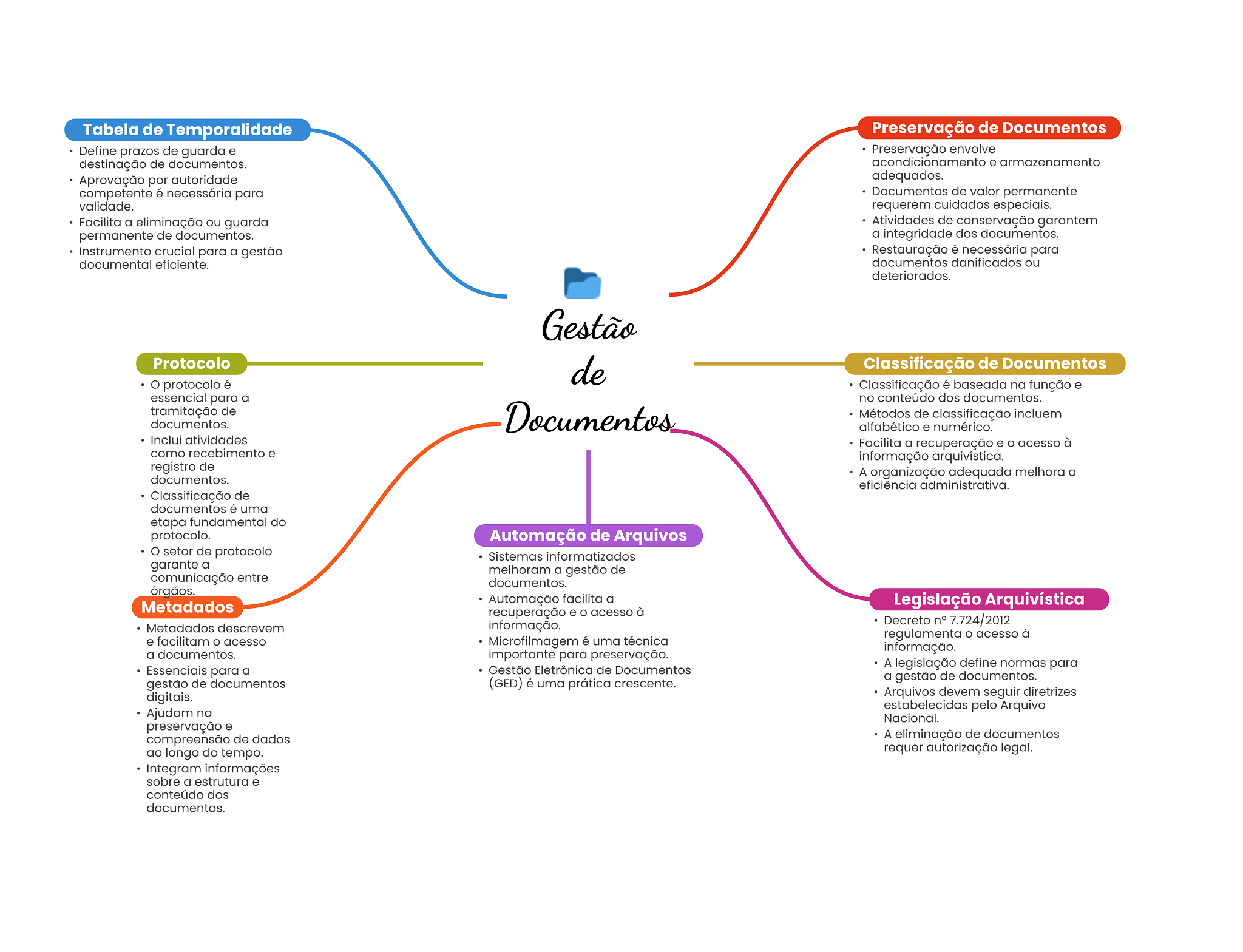 Tabela de Temporalidade Preservação de Documentos Define prazos de guarda e Preservação envolve destinação de documentos. acondicionamento e armazenamento Aprovação por autoridade adequados. competente é necessária para Documentos de valor permanente validade. requerem cuidados especiais. Facilita a eliminação ou guarda Atividades de conservação garantem permanente de documentos. a integridade dos documentos. Instrumento crucial para a gestão Restauração é necessária para documental eficiente. documentos danificados ou deteriorados. Gestão Protocolo de Classificação de Documentos protocolo é Classificação é baseada na função e essencial para a no conteúdo dos documentos. tramitação de documentos. Documentos Métodos de classificação incluem alfabético e numérico. Inclui atividades Facilita a recuperação e O acesso à como recebimento e informação arquivística. registro de A organização adequada melhora a documentos. eficiência administrativa. Classificação de documentos é uma etapa fundamental do protocolo. Automação de Arquivos setor de protocolo Sistemas informatizados garante a melhoram a gestão de comunicação entre documentos. órgãos. Automação facilita a Metadados Legislação Arquivística recuperação e O acesso à Metadados descrevem informação. Decreto n° 7.724/2012 regulamenta O acesso à e facilitam acesso Microfilmagem é uma técnica informação. a documentos. importante para preservação. Gestão Eletrônica de Documentos A legislação define normas para Essenciais para a (GED) é uma prática crescente. a gestão de documentos. gestão de documentos digitais. Arquivos devem seguir diretrizes estabelecidas pelo Arquivo Ajudam na Nacional. preservação e compreensão de dados A eliminação de documentos ao longo do tempo. requer autorização legal. Integram informações sobre a estrutura e conteúdo dos documentos.