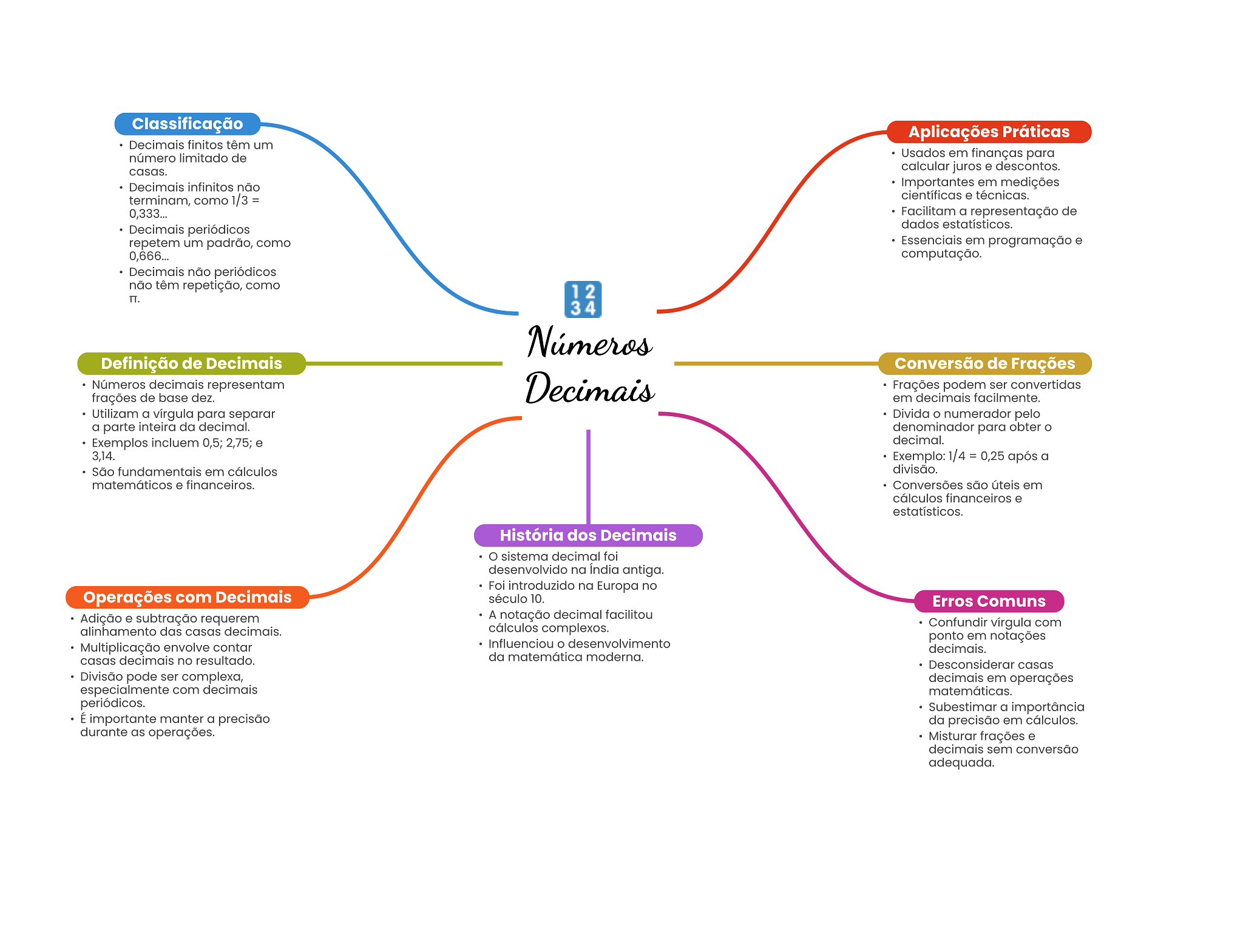 Classificação Aplicações Práticas Decimais finitos têm um número limitado de Usados em finanças para casas. calcular juros e descontos. Decimais infinitos não Importantes em medições terminam, como 1/3 = científicas e técnicas. 0,333... Facilitam a representação de Decimais periódicos dados estatísticos. repetem um padrão, como Essenciais em programação e 0,666... computação. Decimais não periódicos não têm repetição, como 12 п. Números Definição de Decimais Conversão de Frações Números decimais representam frações de base dez. Decimais Frações podem ser convertidas em decimais facilmente. Utilizam a vírgula para separar Divida O numerador pelo a parte inteira da decimal. denominador para obter O Exemplos incluem 0,5; 2,75; e decimal. 3,14. Exemplo: 1/4 = 0,25 após a São fundamentais em cálculos divisão. matemáticos e financeiros. Conversões são úteis em cálculos financeiros e estatísticos. História dos Decimais sistema decimal foi desenvolvido na India antiga. Foi introduzido na Europa no Operações com Decimais século 10. Erros Comuns Adição e subtração requerem A notação decimal facilitou alinhamento das casas decimais. cálculos complexos. Confundir vírgula com ponto em notações Multiplicação envolve contar Influenciou desenvolvimento decimais. casas decimais no resultado. da matemática moderna. Desconsiderar casas Divisão pode ser complexa, decimais em operações especialmente com decimais matemáticas. periódicos. Subestimar a importância É importante manter a precisão da precisão em cálculos. durante as operações. Misturar frações e decimais sem conversão adequada.