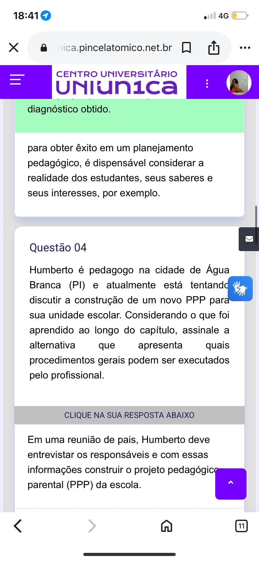 18:41 4G X CENTRO UNIVERSITÁRIO ... diagnóstico obtido. para obter êxito em um planejamento pedagógico, é dispensável considerar a realidade dos estudantes, seus saberes e seus interesses, por exemplo. Questão 04 Humberto é pedagogo na cidade de Água Branca (PI) e atualmente está tentando discutir a construção de um novo PPP para sua unidade escolar. Considerando o que foi aprendido ao longo do capítulo, assinale a alternativa que apresenta quais procedimentos gerais podem ser executados pelo profissional. CLIQUE NA SUA RESPOSTA ABAIXO Em uma reunião de pais, Humberto deve entrevistar os responsáveis e com essas informações construir o projeto pedagógico parental (PPP) da escola. 11