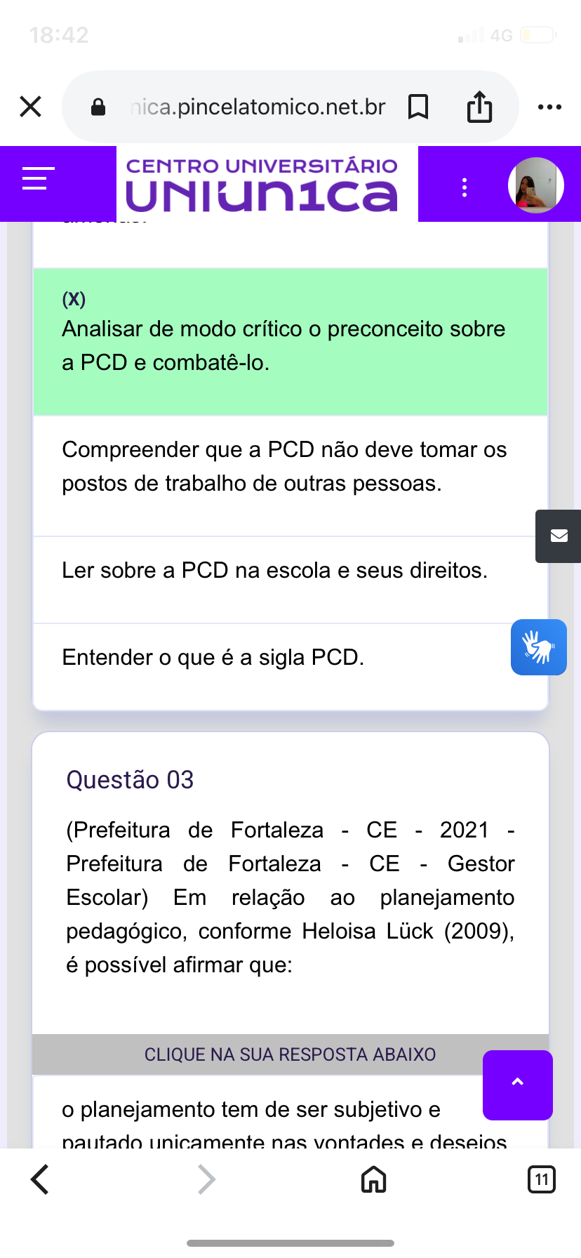 18:42 4G X CENTRO UNIVERSITÁRIO (X) Analisar de modo crítico preconceito sobre a PCD e combatê-lo. Compreender que a PCD não deve tomar os postos de trabalho de outras pessoas. Ler sobre a PCD na escola e seus direitos. Entender o que é a sigla PCD. Questão 03 (Prefeitura de Fortaleza - CE - 2021 - Prefeitura de Fortaleza - CE - Gestor Escolar) Em relação ao planejamento pedagógico, conforme Heloisa Lück (2009), é possível afirmar que: CLIQUE NA SUA RESPOSTA ABAIXO o planejamento tem de ser subjetivo e pautado unicamente nas vontades e deseios 11