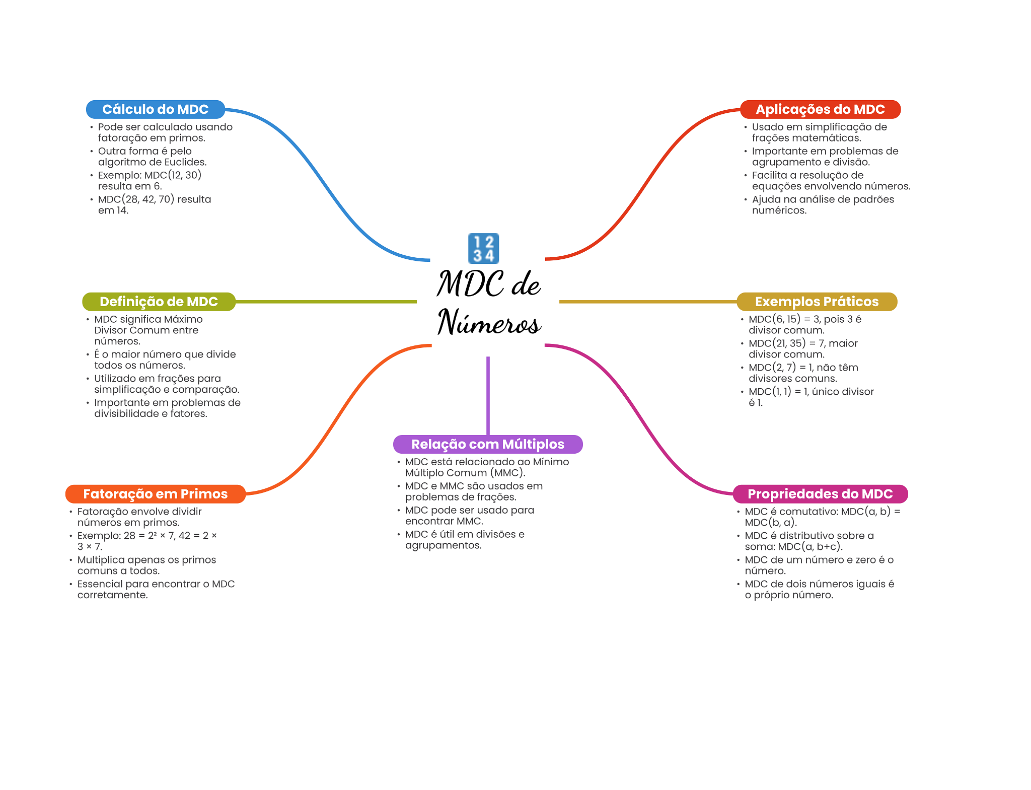 Cálculo do MDC Aplicações do MDC Pode ser calculado usando Usado em simplificação de fatoração em primos. frações matemáticas. Outra forma é pelo Importante em problemas de algoritmo de Euclides. agrupamento e divisão. Exemplo: MDC(12, 30) Facilita a resolução de resulta em 6. equações envolvendo MDC(28, 42, 70) resulta Ajuda na análise de padrões em 14. numéricos. 12 MDC de Definição de MDC Exemplos Práticos MDC significa Máximo Divisor Comum entre Números MDC(6, 15) = 3, pois 3 é divisor comum. números. MDC(21, 35) 7, maior É O maior número que divide divisor comum. todos OS números. = 1, não têm Utilizado em frações para divisores comuns. simplificação e comparação. MDC(1,1) 1, único divisor Importante em problemas de divisibilidade e fatores. Relação com Múltiplos MDC está relacionado ao Mínimo Múltiplo Comum (MMC). MDC e MMC são usados em Fatoração em Primos problemas de frações. Propriedades do MDC Fatoração envolve dividir MDC pode ser usado para MDC é comutativo: MDC(a, b) = números em primos. encontrar MMC. MDC(b, a). Exemplo: 28 = 7, 42 = 2 MDC é útil em divisões e MDC é distributivo sobre a agrupamentos. soma: MDC(a, b+c). Multiplica apenas primos MDC de um número e zero é O comuns a todos. número. Essencial para encontrar MDC MDC de dois números iguais é corretamente. próprio número.