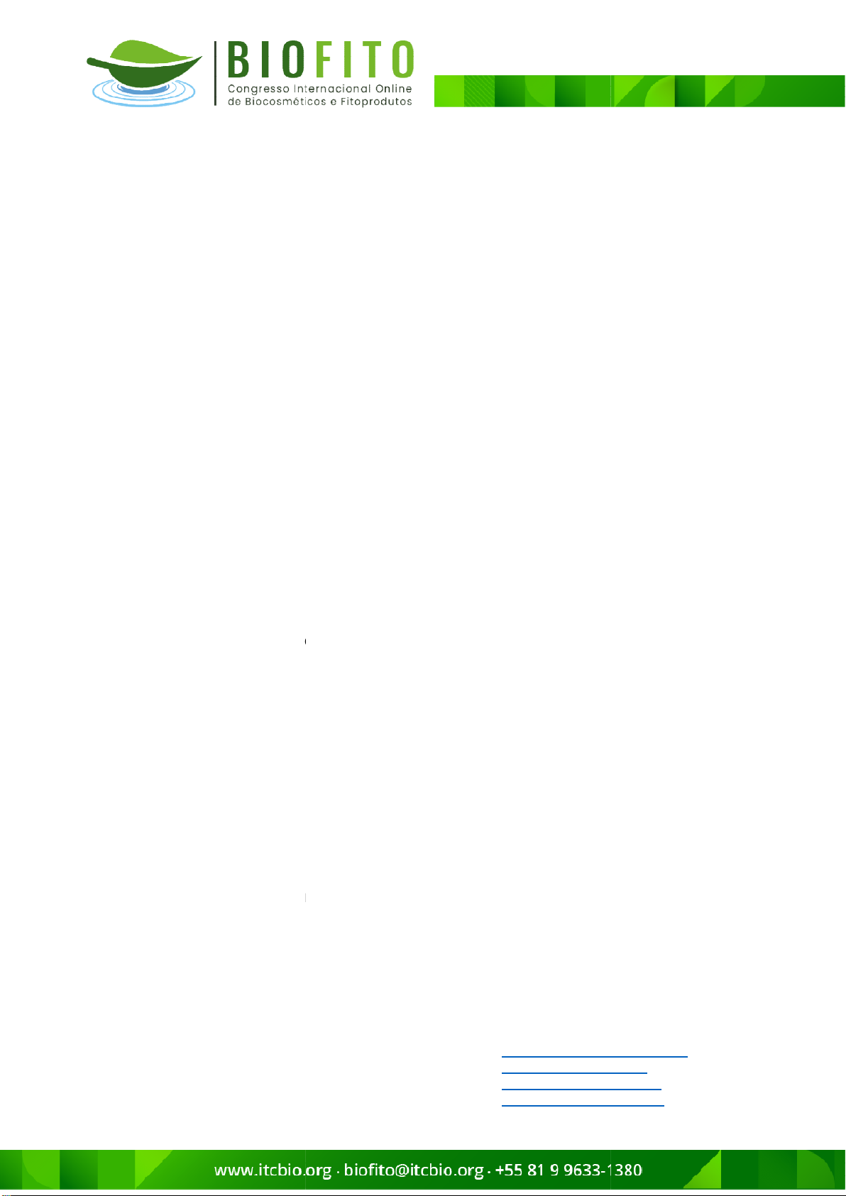 ANÁLISE MULTIFATORIAL PARA A EXTRAÇÃO DE COMPOSTOS FENÓLICOS DE FOLHAS SECAS DE japonica LINDL. RESUMO As plantas medicinais são usadas há muitos anos com intuito de se obter a cura, estabilização ou redução de Produzem diversas substâncias terapêutic necessário saber quais são os compostos fenólicos vêm sendo amplamente estudado devido ao seu amplo espectro de ação. Este trabalho te condição extrativa de compostos fenólicos de Eriobotrya japonica Lindl. Para sua execução foi realizado (DoE, 24, Minitab®) com diferentes tratamentos (etanol absoluto e 70% 10%, pH 3 e 12 e maceração estática por um e sete dias). citotoxicidade foi utilizado o modelo A análise de fenóis totais mostrou na concentração etanólica e maceração estática de 7 dias, processo: 23,58 mg/g de massa seca. observou que as condições extrativas são totais (acima especificadas) Estabelecido o melhor processo extrativo sua análise citotóxica e se tornando-o desta forma seguro. Os compostos secundários encontram locais no âmbito celular. Por esta razão é importante determinar quais são as melhores estratégias para extraí empregados favoreceram a retirada de compostos fenólicos, o que torna o material vegetal uma excelente fonte de fenóis totais. Associado a este fato, conclui-se que não apenas o método que não mostrou citotoxicidad Palavras-chave: Análise multifatorial compostos fenólicos; triagem fitoquímica 1 Centro Universitário Saúde ABC, Santo André, SP, e 2 Centro Universitário Saúde ABC, Santo André, SP, e 3 Centro Universitário Saúde ABC, Santo André, SP, e 4 Centro Universitário Saúde ABC, Santo André, SP, e ANÁLISE MULTIFATORIAL PARA A EXTRAÇÃO DE COMPOSTOS FENÓLICOS DE FOLHAS SECAS DE LINDL. E SUA ATIVIDADE CITOTÓXICA. LIMA, Larissa Machado Graduanda do Curso de Biomédico e GAMA, Robson Miranda da Farmacêutico e ARMANDO Farmacêutico As plantas medicinais são usadas há muitos anos com intuito de se obter a cura, estabilização ou redução de sintomas de inúmeras enfermidades substâncias terapêuticas e para obtê-las de forma eficaz é necessário saber quais são suas melhores condições extrativas. Dentre essas, vêm sendo amplamente estudado devido ao seu amplo Este trabalho teve como objetivo determinar a de compostos fenólicos de extratos vegetais de folhas secas Eriobotrya japonica Lindl. (família Rosaceae) e avaliar sua citotoxicidade. Para sua execução foi realizado um delineamento estatístico de experimentos (DoE, 24, Minitab®) com seleção de 4 fatores e 2 níveis resultando em 16 diferentes tratamentos (etanol absoluto e 70%, razão da droga/solvente em 10%, pH 3 e 12 e maceração estática por um e sete dias). Para os ensaios de citotoxicidade foi utilizado o modelo de Artemia salina. A análise de fenóis totais mostrou que o tratamento em que o líquido extrator, na concentração etanólica de 70°, pH básico, proporção da droga vegetal 5:100 e maceração estática de 7 dias, resultou na melhor combinação para este de massa seca. Na análise quantitativa de flavonoides as condições extrativas são as mesmas utilizadas pelos fenóis (acima especificadas) resultando em 278,58 g/g de massa seca. o melhor processo extrativo de fenóis totais procedeu e se constatou que o extrato não demonstr desta forma seguro. Os compostos secundários encontram-se compartimentalizados em diferentes locais no âmbito celular. Por esta razão é importante determinar quais são as ara extraí-los e neste trabalho os diferentes fatores favoreceram a retirada de compostos fenólicos, o que torna o material vegetal uma excelente fonte de fenóis totais. Associado a este fato, se que não apenas o método extrativo é eficaz, mas também seguro, já que não mostrou citotoxicidade. Análise multifatorial; Eriobotrya japonica Lindl.; triagem fitoquímica. Universitário Saúde ABC, Santo André, SP, e-mail: larissa.lima@aluno.fmabc.net Universitário Saúde ABC, Santo André, SP, e-mail: salygerson@fmabc.net Universitário Saúde ABC, Santo André, SP, e-mail: robson.gama@fmabc.net Universitário Saúde ABC, Santo André, SP, e-mail: jose.armando@fmabc.net ANÁLISE MULTIFATORIAL PARA A EXTRAÇÃO DE COMPOSTOS FENÓLICOS DE FOLHAS SECAS DE Eriobotrya E SUA ATIVIDADE CITOTÓXICA. LIMA, Larissa Machado1 Graduanda do Curso de Farmácia SALAY, Gerson2 Biomédico e Pós-Doutor GAMA, Robson Miranda da3 Farmacêutico e Mestre ARMANDO-JR, José4 Farmacêutico e Doutor As plantas medicinais são usadas há muitos anos com intuito de se obter a de inúmeras enfermidades. las de forma eficaz é as melhores condições extrativas. Dentre essas, vêm sendo amplamente estudado devido ao seu amplo determinar a melhor de extratos vegetais de folhas secas citotoxicidade. um delineamento estatístico de experimentos resultando em 16 razão da droga/solvente em 5 e Para os ensaios de que o tratamento em que o líquido extrator, proporção da droga vegetal 5:100 resultou na melhor combinação para este análise quantitativa de flavonoides zadas pelos fenóis de massa seca. procedeu-se então não demonstrou toxicidade, se compartimentalizados em diferentes locais no âmbito celular. Por esta razão é importante determinar quais são as s diferentes fatores favoreceram a retirada de compostos fenólicos, o que torna o material vegetal uma excelente fonte de fenóis totais. Associado a este fato, é eficaz, mas também seguro, já .; citotoxicidade; larissa.lima@aluno.fmabc.net salygerson@fmabc.net robson.gama@fmabc.net jose.armando@fmabc.net