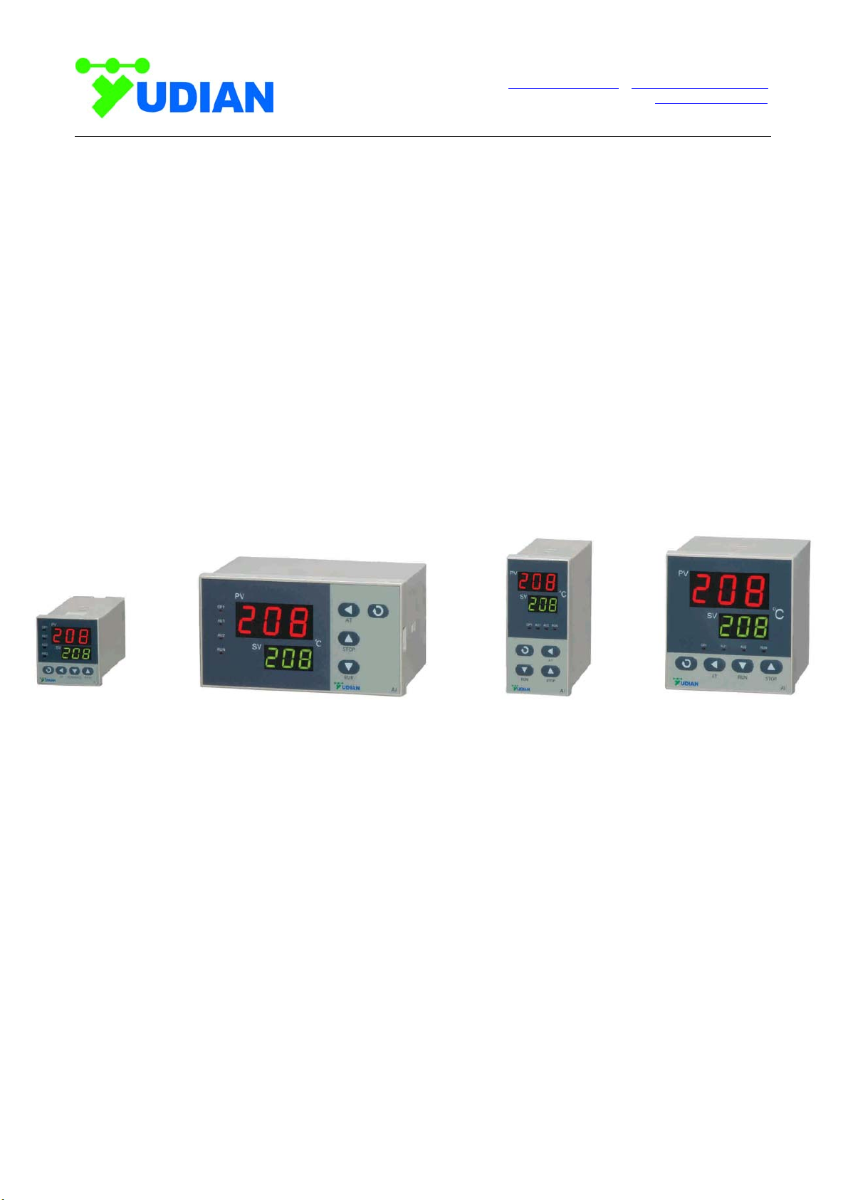Yudian (H.K.) Automation Technology Co. Ltd. Website: http://www.yudian.us http://www.yudian.com.hk Email: sales@yudian.com.hk Tel: +852-2770 8785 Fax: +852-2770 8796 ARTIFICIAL INTELLIGENCE TEMPERATURE CONTROLLER AI-208 (V7.6) User Manual Yudian (H.K.) Automation Technology Co. Ltd. Website: http://www.yudian.us http://www.yudian.com.hk Email: sales@yudian.com.hk Tel: +852-2770 8785 Fax: +852-2770 8796 I. Model Code Symbol The type of AI-208 is made up of 4 parts: AI-208 A G L2 Part 1 (Series) Part 2 (Size) Part 3 (Oupt) Part 4 (AUX) 1. (Part 1) Model Series AI-208, standard temperature controller , 0.3%FS±1℃ accuracy. Multiple thermocouples and RTDs are selectable Suitable for 0~999℃ application. Maximum support two alarms contact output Universal voltage input (100~240VAC) 2. (Part 2) Front panel dimension Size Front Panel width×height Cut Out width×height Depth Behind Mounting Surface A 96×96mm 92×92mm 100mm B 160×80mm 152×76mm 100mm D 72×72mm 68×68mm 95mm D2 48×48mm 45×45mm 95mm E 48×96mm 45×92mm 100mm F 96×48mm 92×45mm 100mm Yudian (H.K.) Automation Technology Co. Ltd. Website: http://www.yudian.us http://www.yudian.com.hk Email: sales@yudian.com.hk Tel: +852-2770 8785 Fax: +852-2770 8796 3. (Part 3 and 4) indicate the module installed in OUTP and AUX sockets. Allowed modules in each socket are as below: Allowed Type Module Socket N L L1 L5 G 3. OUTP (main output) √ √ 4. AUX (Auxiliary output) √ √ √ N (or none) no module installed L Relay contact output module (Capacity: 5A/250VAC, normal open) L1 Relay contact output module (Capacity: 2A/250VAC, normal open/ normal close) L5 Dual relay output module Output module (Capacity: 2A/250VAC, normal open, support AU1 and AU2 alarm output) G SSR voltage output module (30mA/5VDC) II. TECHNICAL SPECIFICATION 1. Input type : Thermocouple: K, E, J, N Resistance temperature detector: Pt100 2. Instrument Input range : K, E, J, N : (0~+999)℃ ; Pt100: (0~+800)℃ 3. Measurement accuracy : 0.3%FS±1℃ 4. Temperature display resolution : 0 or 0.0 (0.0 just for 0~99.9 display) 5. Control mode: On-off control mode, or PID control with the function of parameter auto tuning. 6. Alarm function: High limit alarm, Lower limit alarm, Deviation High Alarm; providing the function of alarm blocking at the beginning of power on. 7. Power supply voltage rating: 100-240VAC, -15%, +10% / 50-60Hz. 8. Power consumption: ≤2W 9. Ambient temperature: -10~+60℃, Humidity: 0~90RH% Yudian (H.K.) Automation Technology Co. Ltd. Website: http://www.yudian.us http://www.yudian.com.hk Email: sales@yudian.com.hk Tel: +852-2770 8785 Fax: +852-2770 8796 III. FRONT PANEL AND OPERATION ① Process Value(PV), or parameter code ② Set Value(SV), alarming code, or value of a parameter ③ Setup key, for accessing parameter table, and confirming change. ④ Data shift key, also for activating auto turning ⑤ Data decrease key ⑥ Data increase key ⑦ Status display LED, OP1, AU1, AU2, and RUN indicate I/O operation of the corresponding module. Basal display status: When power on, will shows the process value (PV) and the set point (SV). lf the input signal is out of the measurable range (for example, the thermocouple or RTD circuit is break, or input specification sets wrong). Instrument will alternately display “orA”, and limit alarm of PV, moreover, instrument will automatically stop the output. IV. OPERATION DESCRIPTION ● Set Value Setting: In basal display status, if the parameter lock “Loc” isn't locked, we can set setpoint (SV) by pressing 、 or . Press key to decrease the value, key to increase the value, and key to move to the digit expected to modify. Keep pressing or , the speed of decreasing or inscreasing value get quick. The range of setpoint is between the parameter SPH. The default range is 0 to 400. ● Parameter Setting: In basal display status, press and hold for about 2 seconds can access Field Parameter Table. Pressing can go to the next parameter; if parameter have not locked, pressing 、 or can modify a parameter. Press and hold can return to the preceding parameter. Press (don't release) and then press key simultaneously can escape from the parameter table. The instrument will escape auomatically from the parameter table if no key is pressed within 30 seconds. Setting Loc=808 and then press can access System Parameter Table. ● AI artificial intelligence control and auto tuning When AI artificial intelligence control method is chosen (CrL=AI), the PID parameters can be obtained by running auto-tuning. In basal display status, press for 2 seconds, the “At” parameter will appear. Press to change the value of “At” from “oFF” to “on”, then press to active the auto-tuning process. During auto tuning, the instrument executes on-off control. After 2-3 times of on-off action, the instrument will obtain the optimal control parameter value. If you want to escape from auto tuning status, press and hold the key for about 2 seconds until the "At" parameter appear again. Change “At” from “on” to “oFF”, press to confirm, then the auto tuning process will be cancelled. Note 1: If the setpoint is different, the parameters obtained from auto-tuning are possible different. So you’d better set setpoint to an often-used value or middle value first, and then start auto-tuning. For the ovens with good heat preservation, the setpoint can be set at the highest applicable temperature. Depending on the system, the auto-tuning time can be from several seconds to several hours. Note 2: Parameter Ctl (on-off differential, control hysteresis) has influence on the accuracy of auto-tuning. Generally, the smaller the value of Ctl, the higher the precision of auto tuning. But Ctl parameter value should be large enough to prevent the instrument from error action around setpoint due to the oscillation of input. Ctl is recommended to be 2.0. Note 3: AI series instrument has the function of self-learning. It is able to le