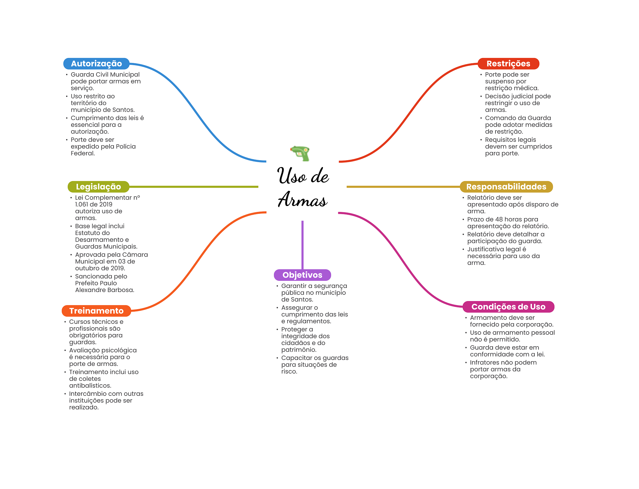 Autorização Restrições Guarda Civil Municipal Porte pode ser pode portar armas em suspenso por serviço. restrição médica. Uso restrito ao Decisão judicial pode território do restringir uso de município de Santos. armas. Cumprimento das leis é Comando da Guarda essencial para a pode adotar medidas autorização. de restrição. Porte deve ser Requisitos legais expedido pela Polícia devem ser cumpridos Federal. para porte. Uso de Legislação Responsabilidades Lei Complementar n° Armas Relatório ser 1.061 de 2019 apresentado após disparo de autoriza uso de arma. armas. Prazo de 48 horas para Base legal inclui apresentação do relatório. Estatuto do Relatório deve detalhar a Desarmamento e participação do guarda. Guardas Municipais. Justificativa legal é Aprovada pela Câmara necessária para uso da Municipal em 03 de arma. outubro de 2019. Sancionada pelo Objetivos Prefeito Paulo Garantir a segurança Alexandre Barbosa. pública no município de Santos. Treinamento Assegurar O Condições de Uso cumprimento das leis Armamento deve ser Cursos técnicos e e regulamentos. fornecido pela corporação. profissionais são Proteger a obrigatórios para integridade dos Uso de armamento pessoal guardas. cidadãos e do não é permitido. Avaliação psicológica patrimônio. Guarda deve estar em é necessária para conformidade com a lei. Capacitar guardas porte de armas. para situações de Infratores não podem Treinamento inclui uso risco. portar armas da de coletes corporação. antibalísticos. Intercâmbio com outras instituições pode ser realizado.