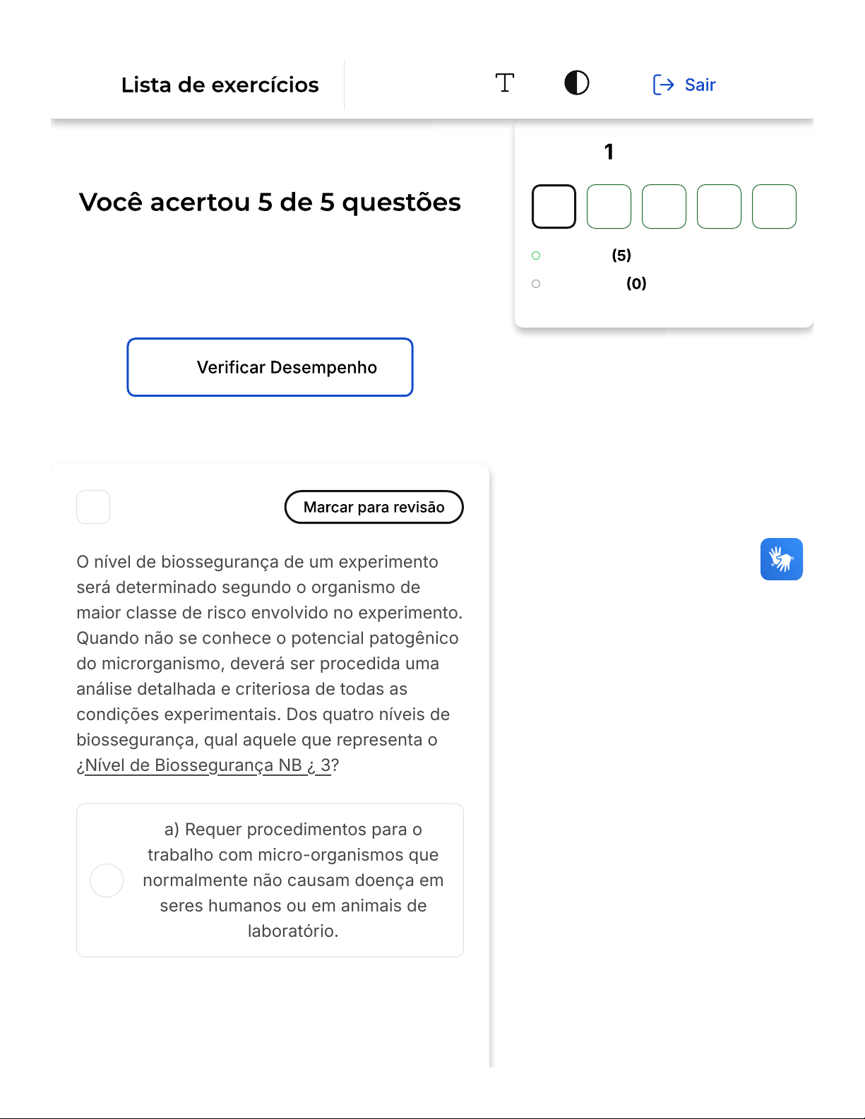 Verifique o seu desempenho e continue treinando! Você pode refazer o exercício quantas vezes quiser. A 1 O nível de biossegurança de um experimento será determinado segundo o organismo de maior classe de risco envolvido no experimento. Quando não se conhece o potencial patogênico do microrganismo, deverá ser procedida uma análise detalhada e criteriosa de todas as condições experimentais. Dos quatro níveis de biossegurança, qual aquele que representa o ¿Nível de Biossegurança NB ¿ 3? a) Requer procedimentos para o trabalho com micro-organismos que normalmente não causam doença em seres humanos ou em animais de laboratório. Questão de 5 Corretas Em branco 1 2 3 4 5 Conteúdo Firefox https://estacio.saladeavaliacoes.com.br/exercicio/6984de3b9adba66e2f... 1 of 8 05/02/2026, 15:33 B C D E b) Requer procedimentos para o trabalho com micro-organismos capazes de causar doenças em seres humanos ou em animais de laboratório sem apresentar risco grave aos trabalhadores, comunidade ou ambiente. Agentes não transmissíveis pelo ar. c) Requer tratamento efetivo e medidas preventivas disponíveis quando o risco de contaminação for pequeno. d) Requer procedimentos para o trabalho com micro-organismos que geralmente causam doenças em seres humanos ou em animais e podem representar um risco se disseminado na comunidade, mas usualmente existem medidas de tratamento e prevenção. Exige contenção para impedir a transmissão pelo ar. e) Requer procedimentos para o trabalho com micro-organismos que causam doenças graves ou letais para seres humanos e animais, com fácil transmissão por contato individual casual. Não existem medidas preventivas e de tratamento para estes agentes. Parabéns, você selecionou a alternativa correta. Confira o Firefox https://estacio.saladeavaliacoes.com.br/exercicio/6984de3b9adba66e2f... 2 of 8 05/02/2026, 15:33 A B C D gabarito comentado! O Nível de Biossegurança 3 �NB�3) requer procedimentos para o trabalho com micro- organismos (classe de risco 3) que geralmente causam doenças em seres humanos ou em animais e podem representar um risco se disseminado na comunidade, mas usualmente existem medidas de tratamento e prevenção. Exige contenção para impedir a transmissão pelo ar. 2 . a) Sempre fechar as caixas dos perfurocortantes manualmente. b) Transportar os sacos brancos próximos ao corpo. c) Nunca segurar os sacos de resíduos pelas bordas. d) Reincapar as agulhas utilizadas para posterior reaproveitamento. Firefox https://estacio.saladeavaliacoes.com.br/exercicio/6984de3b9adba66e2f... 3 of 8 05/02/2026, 15:33 E e) Comunicar qualquer acidente com perfuro cortante aos eu supervisor imediato. Parabéns, você selecionou a alternativa correta. Confira o gabarito comentado! Em qualquer situação de acidente com perfurocortante, o trabalhador deverá, imediatamente, comunicar a sua supervisão, independentemente das características do evento. A investigação do acidente, poderá garantir que o mesmo não ocorra novamente. 3 Quando ocorre um acidente laboral, uma série de critérios devem ser adotados, dentre eles, a avaliação do acidente, onde é realizada de maneira meticulosa e deve levar em consideração os seguintes parâmetros: I. Material envolvido - Materiais biológicos envolvendo sangue, líquidos de serosas, amniótico, líquor, sêmen e secreções vaginais são considerados de alto risco para a transmissão do vírus. II. Sorologia do paciente- fonte - Os testes completos e demorados devem ser realizados para a detecção da quantificação da carga viral. Os medicamentos Firefox https://estacio.saladeavaliacoes.com.br/exercicio/6984de3b9adba66e2f... 4 of 8 05/02/2026, 15:33 A B C D E devem ser usados até o momento de seu resultado final, que pode variar de 2 a 4 meses. III. O tipo de acidente relacionado ao contato com mucosa ou pele com solução de continuidade: Envolvem contato do material perfurocortante com áreas como nariz, boca, genitálias, pele íntegra e feridas abertas e/ou cicatrizadas. Com base nas afirmações acima, assinale a opção correta. Apenas a afirmativa I está correta. Apenas a afirmativa II está correta. Apenas a afirmativa III está correta. Apenas as afirmativas I e II estão corretas. Todas as afirmativas estão corretas. Parabéns, você selecionou a alternativa correta. Confira o gabarito comentado! A avaliação do acidente deve levar em consideração o material envolvido, o tipo de acidente e a sorologia do paciente- fonte. Firefox https://estacio.saladeavaliacoes.com.br/exercicio/6984de3b9adba66e2f... 5 of 8 05/02/2026, 15:33 A B C D E 4 a) Despreparo das lideranças que, por desconhecerem as boas práticas, colocam em risco todo o processo. b) Falta capacitação e treinamento de toda a equipe, muito comum e que coloca em risco as boas práticas de biossegurança. c) Limpeza visual com baixo padrão de qualidade. d) Uso incorreto dos saneantes, caracterizado também pela ausência de supervisões nos diversos postos de trabalho. e) Utilização correta dos equipamentos de proteção individual por parte da equipe de enfermagem. Parabéns, você selecionou a alternativa correta. Confira o gabarito comentado! Firefox https://estacio.saladeavaliacoes.com.br/exercicio/6984de3b9adba66e2f... 6 of 8 05/02/2026, 15:33 A B C D E O uso incorreto dos equipamentos de proteção individual, ao contrário da afirmativa na opção errada, é o resultado da falta de supervisão, de treinamentos adequados, entre outros fatores, que geram muitos acidentes de trabalho, especialmente em relação aos perfuro cortantes. 5 Quando objetiva-se à redução da possibilidade de contaminação tanto para a equipe de trabalho quanto para a sociedade em geral, visando o melhor uso dos materiais utilizados, bem como seu descarte estamos aplicando o conceito de: contenção retenção prevenção redução segurança do trabalho Firefox https://estacio.saladeavaliacoes.com.br/exercicio/6984de3b9adba66e2f... 7 