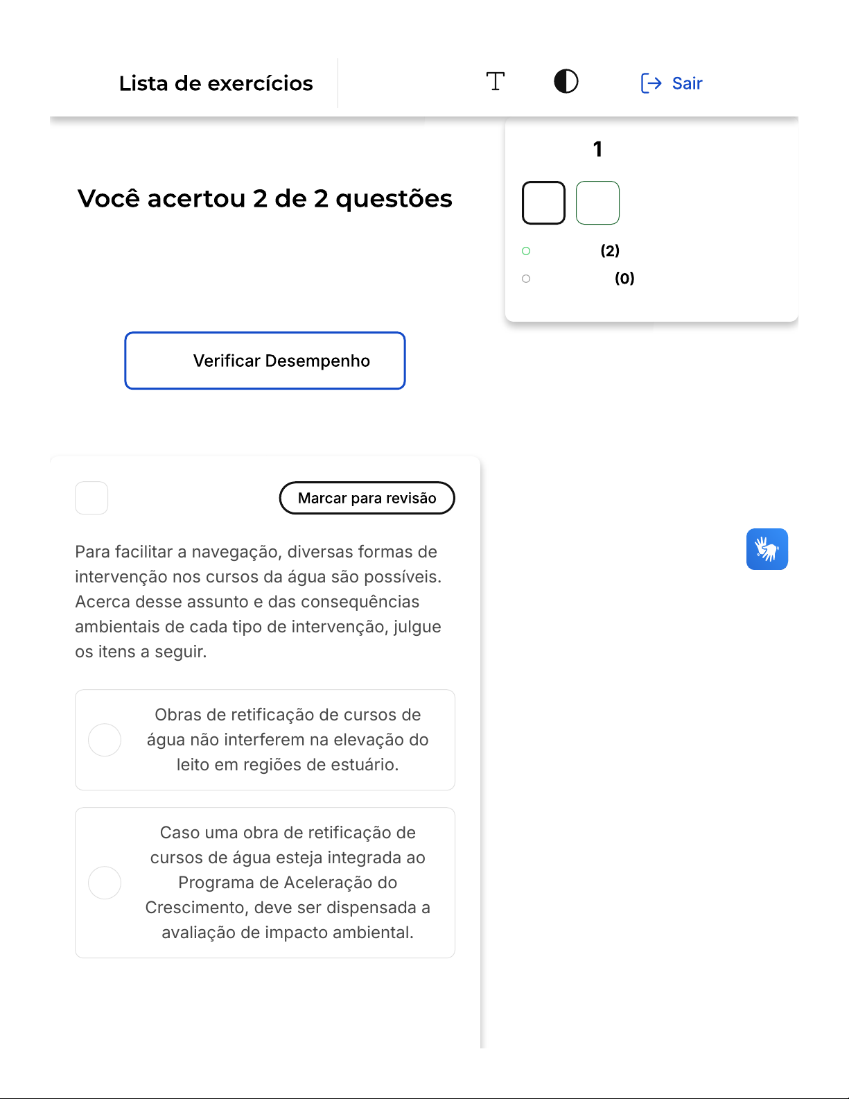 Verifique o seu desempenho e continue treinando! Você pode refazer o exercício quantas vezes quiser. A B 1 Para facilitar a navegação, diversas formas de intervenção nos cursos da água são possíveis. Acerca desse assunto e das consequências ambientais de cada tipo de intervenção, julgue os itens a seguir. Obras de retificação de cursos de água não interferem na elevação do leito em regiões de estuário. Caso uma obra de retificação de cursos de água esteja integrada ao Programa de Aceleração do Crescimento, deve ser dispensada a avaliação de impacto ambiental. Questão de 2 Corretas Em branco 1 2 Conteúdo Firefox https://estacio.saladeavaliacoes.com.br/exercicio/6984112d9adba66e2f... 1 of 3 05/02/2026, 00:42 C D E Em áreas contaminadas por metais pesados, a dragagem do leito do rio para aumento da profundidade do canal pode causar profundos impactos na saúde pública. A retificação de rios traz benefícios econômicos e sociais para a população e, portanto, não há possibilidade de resistência a essa intervenção. Com a retificação do rio, prevê-se, a médio prazo, um aumento na concentração de hidrocarbonetos aromáticos em suas águas. Parabéns, você selecionou a alternativa correta. Confira o gabarito comentado! A dragagem do leito do rio para aumento da profundidade do canal pode causar profundos impactos na saúde pública, pois pode liberar metais pesados que estão depositados no fundo do rio. ----- 2 Firefox https://estacio.saladeavaliacoes.com.br/exercicio/6984112d9adba66e2f... 2 of 3 05/02/2026, 00:42 A B C D E Quanto a estrutura do PPRA, a mesma deve estar escrita em um documento-base, contendo exceto: Planejamento Estratégia Forma de Registro Periodicidade Número máximo de trabalhadores Parabéns, você selecionou a alternativa correta. Confira o gabarito comentado! Número máximo de trabalhadores Firefox https://estacio.saladeavaliacoes.com.br/exercicio/6984112d9adba66e2f... 3 of 3 05/02/2026, 00:42