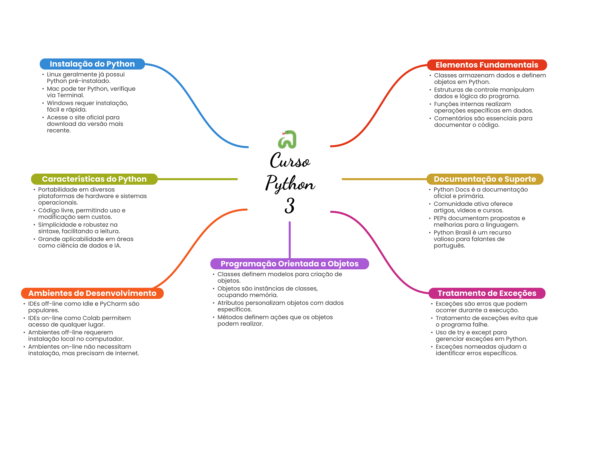 Instalação do Python Elementos Fundamentais Linux geralmente já possui Classes armazenam dados e definem Python pré-instalado. objetos em Python. Mac pode ter Python, verifique Estruturas de controle manipulam via Terminal. dados e lógica do programa. Windows requer instalação, Funções internas realizam fácil e rápida. operações específicas em dados. Acesse site oficial para Comentários são essenciais para download da versão mais documentar código. recente. Curso Características do Python Portabilidade em diversas Python Documentação e Suporte Python Docs é a documentação plataformas de hardware e sistemas oficial e primária. operacionais. 3 Comunidade ativa oferece Código livre, permitindo uso e artigos, vídeos e cursos. modificação sem custos. PEPs documentam propostas e Simplicidade e robustez na melhorias para a linguagem. sintaxe, facilitando a leitura. Python Brasil é um recurso Grande aplicabilidade em áreas valioso para falantes de como ciência de dados e IA. português. Programação Orientada a Objetos Classes definem modelos para criação de objetos. Objetos são instâncias de classes, Ambientes de Desenvolvimento ocupando memória. Tratamento de Exceções IDEs off-line como Idle e PyCharm são Atributos personalizam objetos com dados Exceções são erros que podem populares. específicos. ocorrer durante a execução. IDEs on-line como Colab permitem Métodos definem ações que OS objetos Tratamento de exceções evita que acesso de qualquer lugar. podem realizar. O programa falhe. Ambientes off-line requerem Uso de try e except para instalação local no computador. gerenciar exceções em Python. Ambientes on-line não necessitam Exceções nomeadas ajudam a instalação, mas precisam de internet. identificar erros específicos.