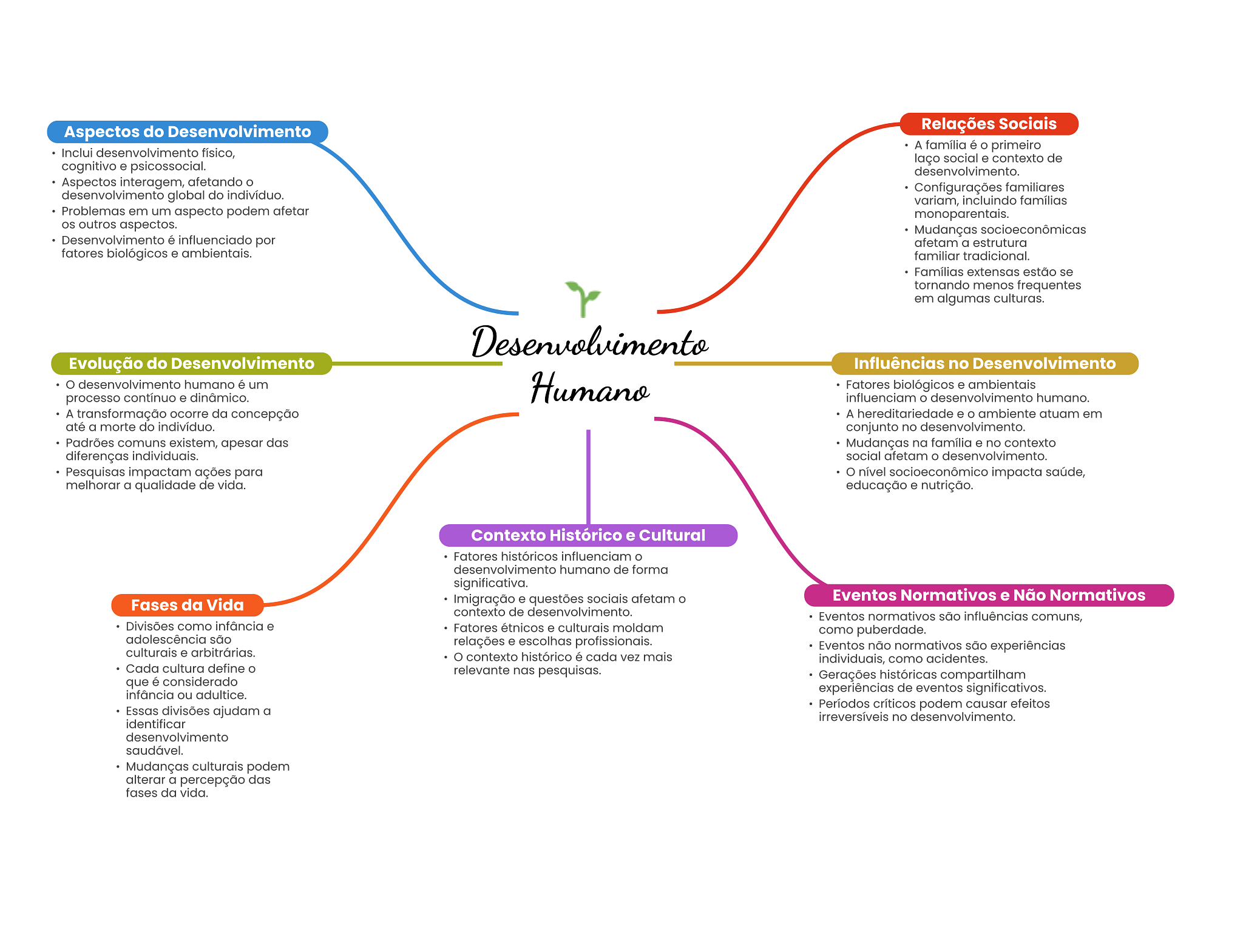 Aspectos do Desenvolvimento Relações Sociais A família é primeiro Inclui desenvolvimento físico, laço social e contexto de cognitivo e psicossocial. desenvolvimento. Aspectos interagem, afetando Configurações familiares desenvolvimento global do indivíduo. variam, incluindo famílias Problemas em um aspecto podem afetar monoparentais. outros aspectos. Mudanças socioeconômicas Desenvolvimento é influenciado por afetam a estrutura fatores biológicos e ambientais. familiar tradicional. Famílias extensas estão se tornando menos frequentes em algumas culturas. Desenvolvimento Evolução do Desenvolvimento Influências no Desenvolvimento desenvolvimento humano é um Humano Fatores biológicos e ambientais processo contínuo e dinâmico. influenciam desenvolvimento humano. A transformação ocorre da concepção A hereditariedade e ambiente atuam em até a morte do indivíduo. conjunto no desenvolvimento. Padrões comuns existem, apesar das Mudanças na família e no contexto diferenças individuais. social afetam O desenvolvimento. Pesquisas impactam ações para O nível socioeconômico impacta saúde, melhorar a qualidade de vida. educação e nutrição. Contexto Histórico e Cultural Fatores históricos influenciam desenvolvimento humano de forma significativa. Fases da Vida Imigração e questões sociais afetam Eventos Normativos e Não Normativos contexto de desenvolvimento. Eventos normativos são influências comuns, Divisões como infância e Fatores étnicos e culturais moldam como puberdade. adolescência são relações e escolhas profissionais. culturais e arbitrárias. Eventos não normativos são experiências contexto histórico é cada vez mais individuais, como acidentes. Cada cultura define relevante nas pesquisas. Gerações históricas compartilham que é considerado infância ou adultice. experiências de eventos significativos. Períodos críticos podem causar efeitos Essas divisões ajudam a irreversíveis no desenvolvimento. identificar desenvolvimento saudável. Mudanças culturais podem alterar a percepção das fases da vida.
