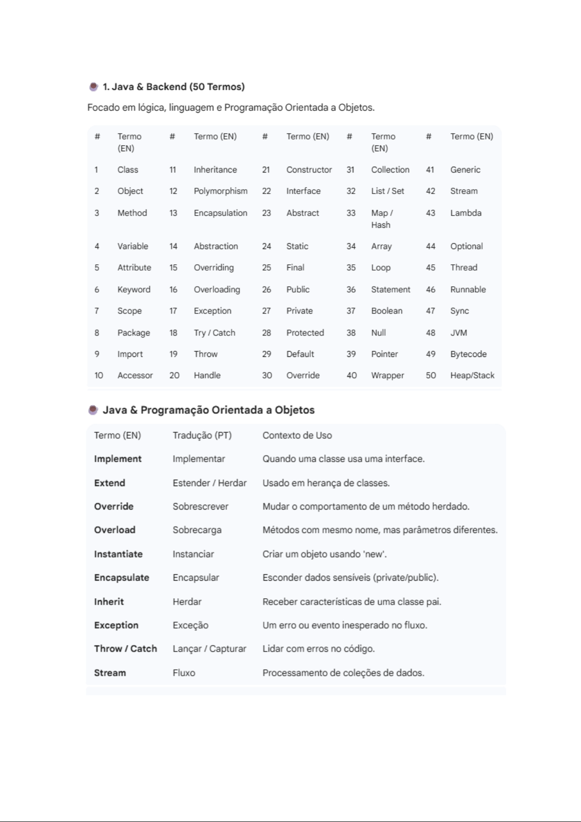 Java & Programação Orientada a Objetos Termo (EN) Tradução (PT) Contexto de Uso Implement Implementar Quando uma classe usa uma interface. Extend Estender / Herdar Usado em herança de classes. Override Sobrescrever Mudar o comportamento de um método herdado. Overload Sobrecarga Métodos com mesmo nome, mas parâmetros diferentes. Instantiate Instanciar Criar um objeto usando 'new'. Encapsulate Encapsular Esconder dados sensíveis (private/public). Inherit Herdar Receber características de uma classe pai. Exception Exceção Um erro ou evento inesperado no fluxo. Throw /Catch Lançar/Capturar Lidar com erros no código. Stream Fluxo Processamento de coleções de dados. 1. Java & Backend (50 Termos) Focado em lógica, linguagem e Programação Orientada a Objetos. # Termo # Termo (EN) # Termo (EN) # (EN) Termo (EN) # Termo (EN) 1 Class 11 Inheritance 21 Constructor 31 Collection 41 Generic 2 Object 12 Polymorphism 22 Interface 32 List/Set 42 Stream 3 Method 13 Encapsulation 23 Abstract 33 Map/ Hash 43 Lambda 4 Variable 14 Abstraction 24 Static 34 Array 44 Optional 5 Attribute 15 Overriding 25 Final 35 Loop 45 Thread 6 Keyword 16 Overloading 26 Public 36 Statement 46 Runnable 7 Scope 17 Exception 27 Private 37 Boolean 47 Sync 8 Package 18 Try/Catch 28 Protected 38 Null 48 JVM 9 Import 19 Throw 29 Default 39 Pointer 49 Bytecode 10 Accessor 20 Handle 30 Override 40 Wrapper 50 Heap/Stack