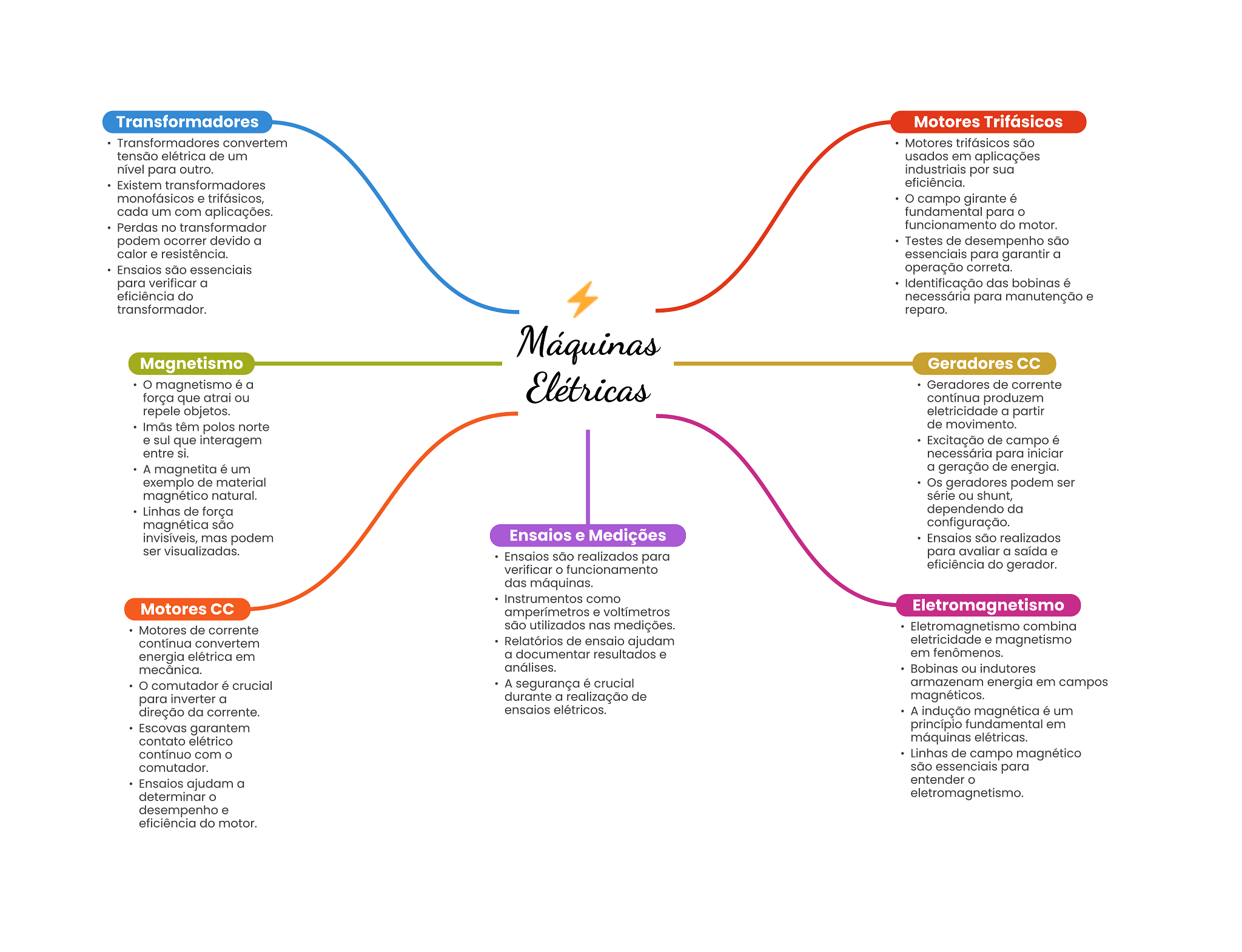 Transformadores Motores Trifásicos Transformadores convertem Motores trifásicos são tensão elétrica de um usados em aplicações nível para outro. industriais por sua Existem transformadores eficiência. monofásicos e trifásicos, campo girante é cada um com aplicações. fundamental para Perdas no transformador funcionamento do motor. podem ocorrer devido a Testes de desempenho são calor e resistência. essenciais para garantir a Ensaios são essenciais operação correta. para verificar a Identificação das bobinas é eficiência do necessária para manutenção e transformador. reparo. Máquinas Magnetismo Geradores magnetismo é a Elétricas Geradores de corrente força que atrai ou contínua produzem repele objetos. eletricidade a partir Imãs têm polos norte de movimento. e sul que interagem Excitação de campo é entre si. necessária para iniciar A magnetita é um a geração de energia. exemplo de material Os geradores podem ser magnético natural. série ou shunt, Linhas de força dependendo da magnética são configuração. invisíveis, mas podem Ensaios e Medições Ensaios são realizados ser visualizadas. Ensaios são realizados para para avaliar a saída e verificar funcionamento eficiência do gerador. das máquinas. Instrumentos como Motores amperímetros e voltímetros Eletromagnetismo Motores de corrente são utilizados nas medições. Eletromagnetismo combina contínua convertem Relatórios de ensaio ajudam eletricidade e magnetismo energia elétrica em a documentar resultados e em fenômenos. mecânica. análises. Bobinas ou indutores comutador é crucial A segurança é crucial armazenam energia em campos para inverter a durante a realização de magnéticos. direção da corrente. ensaios elétricos. A indução magnética é um Escovas garantem princípio fundamental em contato elétrico máquinas elétricas. contínuo com Linhas de campo magnético comutador. são essenciais para Ensaios ajudam a entender determinar eletromagnetismo. desempenho e eficiência do motor.