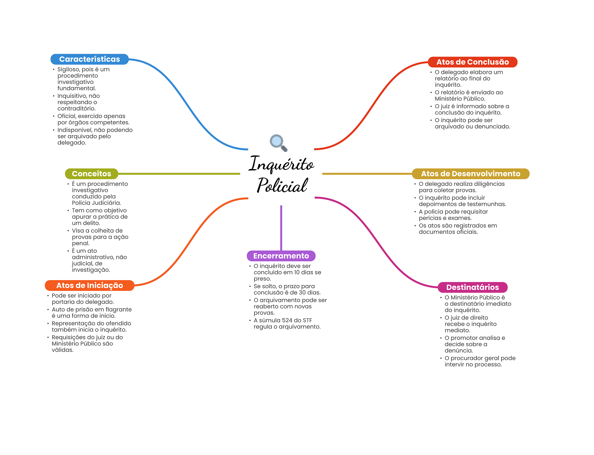 Características Atos de Conclusão Sigiloso, pois é um delegado elabora um procedimento relatório ao final do investigativo fundamental. inquérito. relatório é enviado ao Inquisitivo, não Ministério Público. respeitando contraditório. juiz é informado sobre a Oficial, exercido apenas conclusão do inquérito. por órgãos competentes. inquérito pode ser arquivado ou denunciado. Indisponível, não podendo ser arquivado pelo delegado. Inquérito Conceitos Atos de Desenvolvimento É um procedimento Policial delegado realiza diligências investigativo para coletar provas. conduzido pela inquérito pode incluir Polícia Judiciária. depoimentos de testemunhas. Tem como objetivo A polícia pode requisitar apurar a prática de perícias e exames. um delito. Os atos são registrados em Visa a colheita de documentos oficiais. provas para a ação penal. É um ato administrativo, não Encerramento judicial, de inquérito deve ser investigação. concluído em 10 dias se preso. Atos de Iniciação Se solto, O prazo para Destinatários conclusão é de 30 dias. Pode ser iniciado por Ministério Público é portaria do delegado. arquivamento pode ser reaberto com novas O destinatário imediato Auto de prisão em flagrante provas. do inquérito. é uma forma de início. A súmula 524 do STF O juiz de direito Representação do ofendido também inicia inquérito. regula arquivamento. recebe O inquérito mediato. Requisições do juiz ou do promotor analisa e Ministério Público são decide sobre a válidas. denúncia. procurador geral pode intervir no processo.