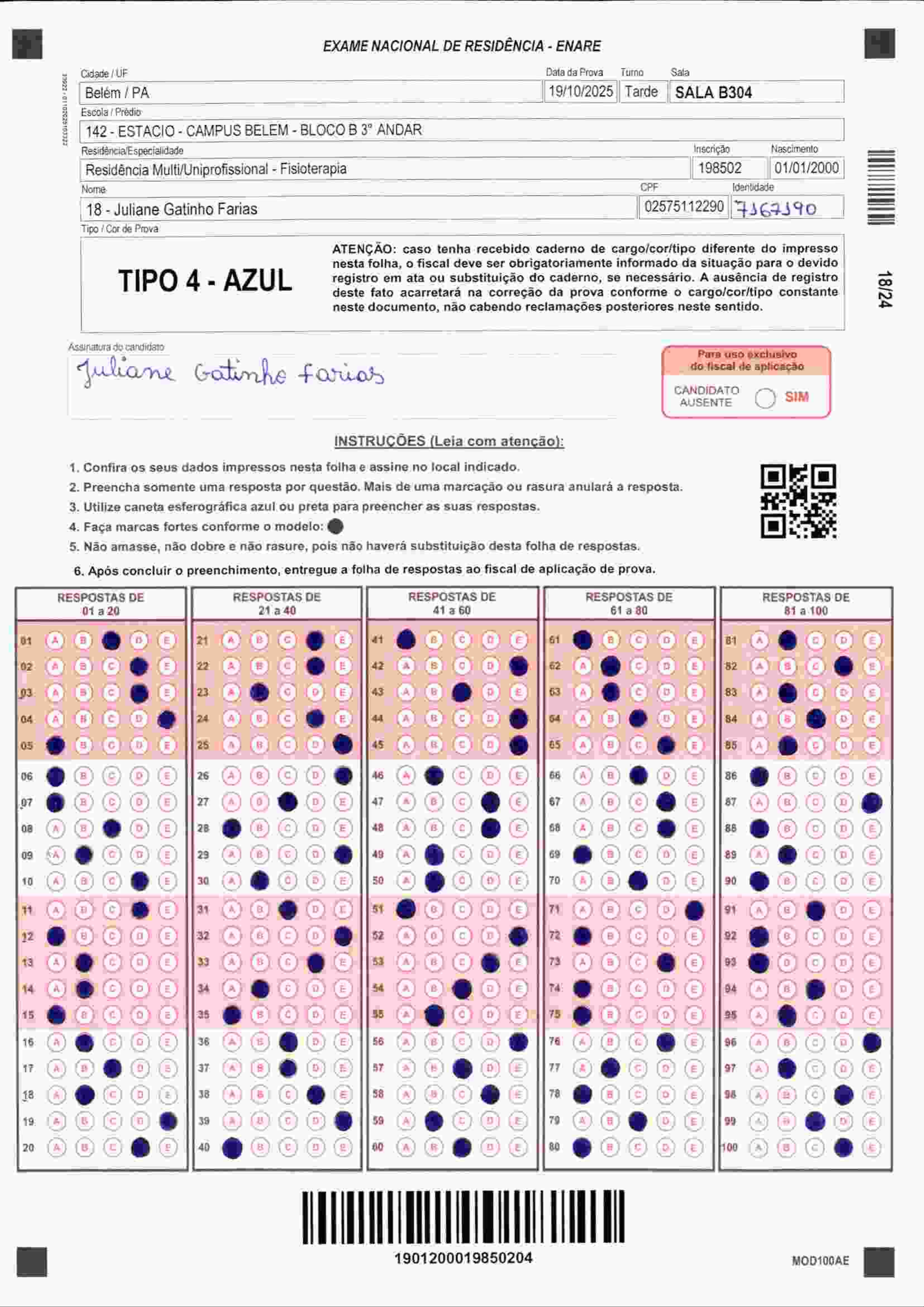 EXAME NACIONAL DE RESIDÊNCIA ENARE Cidade UF Data da Prova Turno Belém / PA 19/10/2025 Tarde SALA B304 Escola Prédio 142 ESTACIO - CAMPUS BELEM BLOCO B 3° ANDAR Inscrição Nascimento Residência Multi/Uniprofissional Fisioterapia 198502 01/01/2000 Nome CPF Identidade 18 Juliane Gatinho Farias 02575112290 7167190 Tipo Cor de Prova ATENÇÃO: caso tenha recebido caderno de cargo/cor/tipo diferente do impresso nesta folha, o fiscal deve ser obrigatoriamente informado da situação para devido TIPO 4 - AZUL registro em ata ou substituição do caderno, se necessário. A ausência de registro deste fato acarretará na correção da prova conforme cargo/cor/tipo constante 18/24 neste documento, não cabendo reclamações posteriores neste sentido. Assinatura candidato Para exclusivo Juliane Gatinho do fiscal de aplicação CANDIDATO SIM AUSENTE INSTRUÇÕES (Leia com atenção): 1. Confira os seus dados impressos nesta folha e assine no local indicado. 2. Preencha somente uma resposta por questão. Mais de uma marcação ou rasura anulará a resposta. 3. Utilize caneta esferográfica azul ou preta para preencher as suas respostas. 4. Faça marcas fortes conforme modelo: 5. Não amasse, não dobre e não rasure, pois não haverá substituição desta folha de respostas. 6. Após concluir preenchimento, entregue a folha de respostas ao fiscal de aplicação de prova. RESPOSTAS DE RESPOSTAS DE RESPOSTAS DE RESPOSTAS DE RESPOSTAS DE 01 20 21 40 41 60 61 80 81 100 01 A E 21 C E 41 B E 61 E A D E 02 A E 22 A 42 A D 62 A D E 82 A E 03 A 23 E 43 A D E 63 D 83 A E 04 A D 24 A 44 A D 54 A D E 84 A D 05 D 25 A D 45 A D 65 A B 85 A D E 06 B D 26 A B D 46 D E 66 A B D E 86 B D D E 07 B E 27 A 0 D E 47 A B E 67 A B E 87 D 08 D E 28 E 48 A E 68 A B E D D E 09 D E 29 49 A E 69 D E 89 A D E 10 A 30 A E 50 A E 70 A E 90 D E 11 E 31 B D 51 D E 71 A B C D 91 A E 12 E 32 D 52 a 0 D 72 B 0 E 92 B D E 13 33 A C E 53 A E 73 A E 93 0 E 14 A D 34 A C D E 54 B E 74 E 94 B D E 15 8 D 35 D E 55 A D 75 D E 95 A E 16 A A E D E 56 76 A E 96 B D 17 D 37 D 57 D 77 A D E 97 A E 18 A D 38 À E 58 A 78 D 98 A E 19 39 A D 59 A E 79 A D E 99 E 20 A 40 g A R 80 E 100 E 1901200019850204 MOD100AE