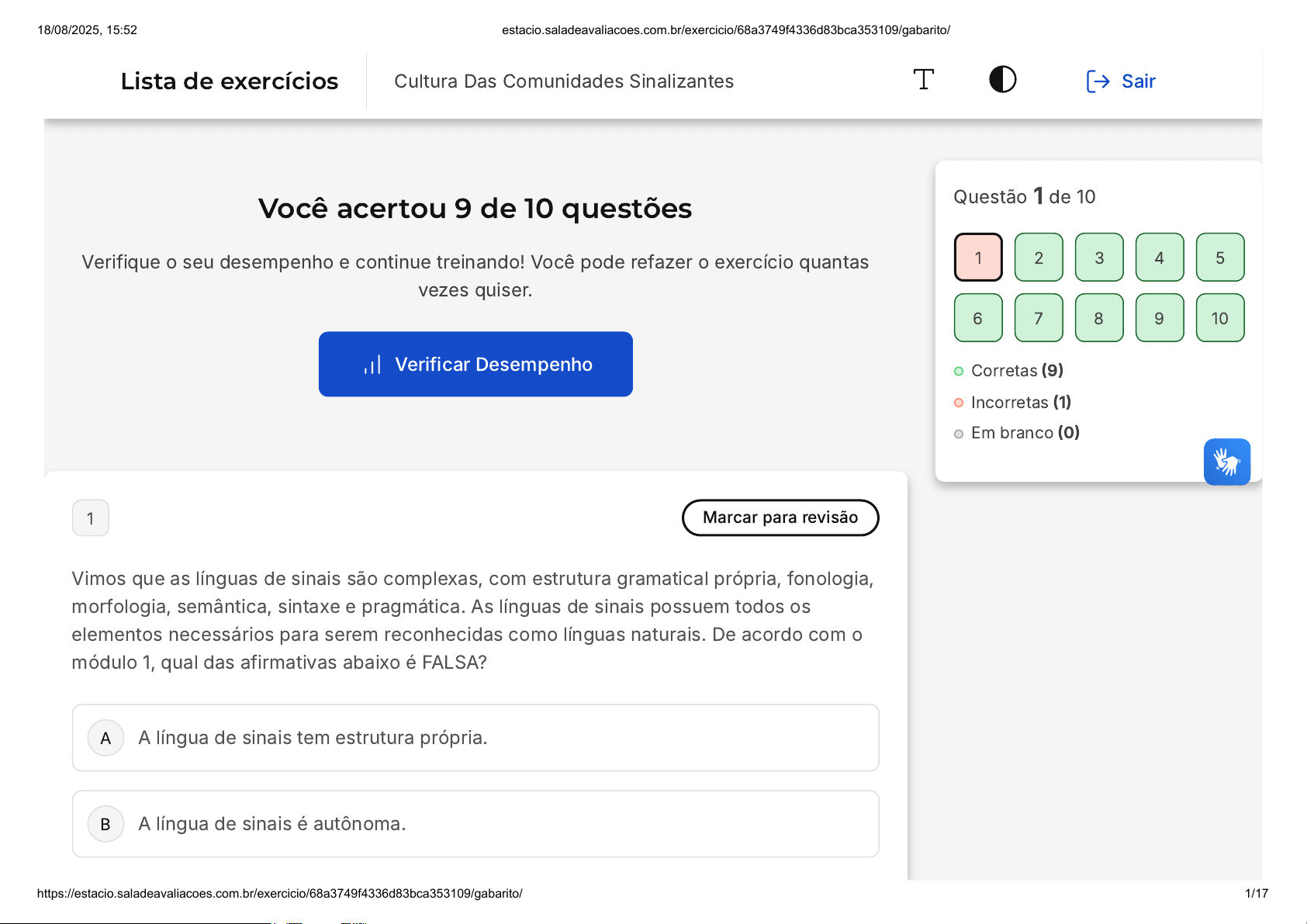 Você acertou 9 de 10 questões Verifique o seu desempenho e continue treinando! Você pode refazer o exercício quantas vezes quiser. Verificar Desempenho A B 1 Marcar para revisão Vimos que as línguas de sinais são complexas, com estrutura gramatical própria, fonologia, morfologia, semântica, sintaxe e pragmática. As línguas de sinais possuem todos os elementos necessários para serem reconhecidas como línguas naturais. De acordo com o módulo 1, qual das afirmativas abaixo é FALSA? A língua de sinais tem estrutura própria. A língua de sinais é autônoma. Questão 1 de 10 Corretas (9) Incorretas (1) Em branco (0) 1 2 3 4 5 6 7 8 9 10 Lista de exercícios Cultura Das Comunidades Sinalizantes Sair 18/08/2025, 15:52 estacio.saladeavaliacoes.com.br/exercicio/68a3749f4336d83bca353109/gabarito/ https://estacio.saladeavaliacoes.com.br/exercicio/68a3749f4336d83bca353109/gabarito/ 1/17 C D E A língua de sinais independe da língua oral. A língua de sinais está em contato direto com a língua oral. A língua de sinais é empréstimo linguístico. Resposta incorreta Opa! A alternativa correta é a letra E. Confira o gabarito comentado! Gabarito Comentado A alternativa E é a falsa. A língua de sinais não é um empréstimo linguístico. Empréstimo linguístico é um termo usado para descrever uma palavra ou expressão tomada de outra língua. No entanto, a língua de sinais é uma língua completa e autônoma, com sua própria gramática e vocabulário, que não depende de uma língua oral. Portanto, não é correto dizer que a língua de sinais é um empréstimo linguístico. 2 Marcar para revisão A língua tem estreitas relações com a sociedade. Estas relações são estudadas pela sociolinguística, ramo da linguística que estuda a língua como um fenômeno social. Vimos que a língua varia no espaço geográfico, no decorrer do tempo, e nos diferentes espaços 18/08/2025, 15:52 estacio.saladeavaliacoes.com.br/exercicio/68a3749f4336d83bca353109/gabarito/ https://estacio.saladeavaliacoes.com.br/exercicio/68a3749f4336d83bca353109/gabarito/ 2/17 A B C D E sociais, bem como nas diferentes situações comunicativas. Sobre variações linguísticas é correto afirmar que: Não são recomendadas, é sugerido utilizar a norma culta. Atrapalham a comunicação entre as pessoas. O regionalismo, uma forma de variação linguística, é muito comum no Brasil Não acontecem nas línguas de sinais. Variações devem ser controladas. Resposta correta Parabéns, você selecionou a alternativa correta. Confira o gabarito comentado! Gabarito Comentado A alternativa correta é a letra C, que afirma que o regionalismo, uma forma de variação linguística, é muito comum no Brasil. Isso é verdadeiro, pois o Brasil, devido à sua extensão territorial e diversidade cultural, apresenta uma rica variedade de expressões e sotaques regionais. Essas variações linguísticas são uma característica natural das línguas e refletem a diversidade cultural de uma nação. Portanto, não são algo que 18/08/2025, 15:52 estacio.saladeavaliacoes.com.br/exercicio/68a3749f4336d83bca353109/gabarito/ https://estacio.saladeavaliacoes.com.br/exercicio/68a3749f4336d83bca353109/gabarito/ 3/17 atrapalha a comunicação ou que deva ser controlado, como sugerem as alternativas B e E. Da mesma forma, a alternativa A está incorreta ao sugerir que apenas a norma culta deve ser utilizada, pois todas as variações linguísticas são válidas e importantes. Por fim, a alternativa D também está equivocada, pois as línguas de sinais também apresentam variações, assim como as línguas orais. 3 Marcar para revisão A respeito da comunidade surda, biliguismo, erros e concepções, analise as afirmativas. I) O termo surdo-mudo é correto do ponto de vista metodológico, uma vez que descreve a comunidade como um todo II) No caso dos surdos brasileiros a língua da comunidade ouvinte, o português, é considerdada como segunda língua, uma vez que a língua de sinais é aprendida de forma natural com o contato com seus pares III) O aprendizado da língua de sinais antes da língua da comunidade ouvinte, pode prejudicar a apreensão da segunda, uma vez as necessidades de comunicação já estão supridas pela lingua de sinais. IV) A linguagem de sinais não se limita ao alfabeto manual. É correto o que se afirma em: 18/08/2025, 15:52 estacio.saladeavaliacoes.com.br/exercicio/68a3749f4336d83bca353109/gabarito/ https://estacio.saladeavaliacoes.com.br/exercicio/68a3749f4336d83bca353109/gabarito/ 4/17 A B C D E I e IV, apenas II e IV, apenas I e III, apenas II e III, apenas I, II, III e IV Resposta correta Parabéns, você selecionou a alternativa correta. Confira o gabarito comentado! Gabarito Comentado I. O termo correto é apenas “Surdo”, e com frequência escrito com a primeira letra maiúscula, demarcando uma concepção cultural das pessoas surdas em oposição a uma abordagem clínica e normatizadora que tem o objetivo de consertar os corpos surdos. III. É um equívoco cometido por alguns profissionais da área da saúde afirmar que a aquisição de uma língua de sinais prejudica a fala. Esse argumento já foi refutado 18/08/2025, 15:52 estacio.saladeavaliacoes.com.br/exercicio/68a3749f4336d83bca353109/gabarito/ https://estacio.saladeavaliacoes.com.br/exercicio/68a3749f4336d83bca353109/gabarito/ 5/17 A B diversas vezes, já que a aquisição de uma língua não atrapalha, de modo algum, a aprendizagem de outra 4 Marcar para revisão A respeito da cultura surda no Brasil, avalie as asserções abaixo e a relação entre elas. I) A cultura surda é homogênea, uma vez que existe uma maneira única para se definir a pessoa surda PORQUE II) A identidade surda no Brasil é unitária e todos se reconhecem como tal Assinale a alternativa correta: As asserções I e II são proposições falsas As asserções I e II são proposições verdadeiras, mas a II não é uma justificativa da I 18/08/2025, 15:52 estacio.sala