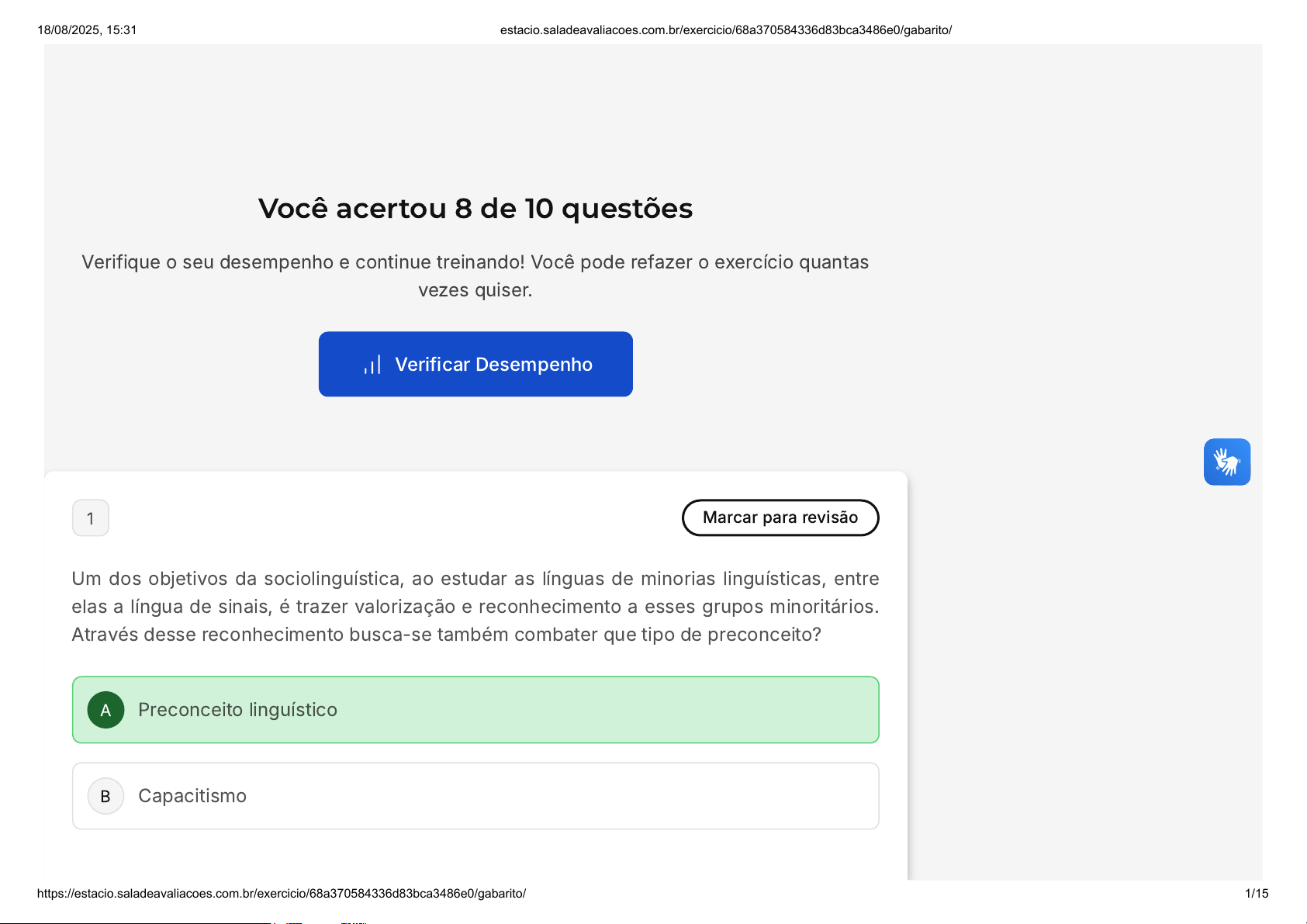 Você acertou 8 de 10 questões Verifique o seu desempenho e continue treinando! Você pode refazer o exercício quantas vezes quiser. Verificar Desempenho A B 1 Marcar para revisão Um dos objetivos da sociolinguística, ao estudar as línguas de minorias linguísticas, entre elas a língua de sinais, é trazer valorização e reconhecimento a esses grupos minoritários. Através desse reconhecimento busca-se também combater que tipo de preconceito? Preconceito linguístico Capacitismo 18/08/2025, 15:31 estacio.saladeavaliacoes.com.br/exercicio/68a370584336d83bca3486e0/gabarito/ https://estacio.saladeavaliacoes.com.br/exercicio/68a370584336d83bca3486e0/gabarito/ 1/15 C D E Preconceito contra surdos e mudos Preconceito regional Xenofobia linguística Resposta correta Parabéns, você selecionou a alternativa correta. Confira o gabarito comentado! Gabarito Comentado A sociolinguística estuda as línguas de minorias linguísticas, entre elas a língua de sinais, com o objetivo de trazer valorização e reconhecimento a esses grupos minoritários. Através desse reconhecimento busca-se também combater o preconceito linguístico, que é o preconceito contra as línguas de minorias linguísticas. 2 Marcar para revisão Os estudiosos da área interacional da sociolinguística buscam a compreensão de como os usuários da língua replicam, em nível micro, crenças sociais do nível macro. A base da construção dialógica é formada pela conjunção de quais fatores? 18/08/2025, 15:31 estacio.saladeavaliacoes.com.br/exercicio/68a370584336d83bca3486e0/gabarito/ https://estacio.saladeavaliacoes.com.br/exercicio/68a370584336d83bca3486e0/gabarito/ 2/15 A B C D E Comportamentais, linguísticos e ideológicos Comportamentais, filosóficos e ideológicos Comportamentais, linguísticos e filosóficos Filosóficos, linguísticos e ideológicos Comportamentais, neurolinguísticos e sociais Resposta correta Parabéns, você selecionou a alternativa correta. Confira o gabarito comentado! Gabarito Comentado A base da construção dialógica, um conceito central na sociolinguística interacional, é formada pela conjunção de fatores comportamentais, linguísticos e ideológicos. Esses três elementos são fundamentais para entender como os usuários da língua replicam, em um nível mais individual e micro, as crenças sociais presentes em um nível mais amplo e macro. Os estudiosos dessa área se dedicam a explorar como esses fatores 18/08/2025, 15:31 estacio.saladeavaliacoes.com.br/exercicio/68a370584336d83bca3486e0/gabarito/ https://estacio.saladeavaliacoes.com.br/exercicio/68a370584336d83bca3486e0/gabarito/ 3/15 A B C D E interagem e influenciam a maneira como a linguagem é usada e interpretada, contribuindo para a criação, reforço e replicação de significados e crenças sociais. 3 Marcar para revisão A partir dos estudos da sociolinguística interacional é correto afirmar que: Os aspectos sociais estão presentes apenas na oralidade, seja na L1 ou na L2. A Libras não deve ser considerada linguagem verbal. O termo "sinalidade" é incompatível com as práticas de oralidade em Libras. Ensino da Libras como L1 deve privilegiar a escrita e do PBL2 de surdos a oralidade. A sinalização é também uma forma de oralidade. 18/08/2025, 15:31 estacio.saladeavaliacoes.com.br/exercicio/68a370584336d83bca3486e0/gabarito/ https://estacio.saladeavaliacoes.com.br/exercicio/68a370584336d83bca3486e0/gabarito/ 4/15 A B C Resposta correta Parabéns, você selecionou a alternativa correta. Confira o gabarito comentado! Gabarito Comentado A sinalização é uma forma de oralidade, pois é uma forma de comunicação que utiliza gestos e sinais para transmitir mensagens. A sinalização é utilizada por pessoas surdas e ouvintes, e é uma forma de comunicação que pode ser utilizada em qualquer lugar, independentemente de haver ou não um intérprete de Libras presente. 4 Marcar para revisão A sociolinguística internacional entende que o uso da língua não pode ser visto de maneira desconexa das pressões sociais dialogicamente construídas. Quais são as duas abordagens com as quais essa vertente dialoga? Análise do discurso e pragmática Discursiva e antagonista Análise pragmática e sociológica 18/08/2025, 15:31 estacio.saladeavaliacoes.com.br/exercicio/68a370584336d83bca3486e0/gabarito/ https://estacio.saladeavaliacoes.com.br/exercicio/68a370584336d83bca3486e0/gabarito/ 5/15 D E Análise do discurso e análise do significado Análise da forma e análise estrutural Resposta correta Parabéns, você selecionou a alternativa correta. Confira o gabarito comentado! Gabarito Comentado A sociolinguística internacional, ao analisar o uso da língua, considera as pressões sociais que são construídas dialogicamente. Isso significa que o uso da língua não é um fenômeno isolado, mas está intrinsecamente ligado ao contexto social em que ocorre. Nesse sentido, a sociolinguística internacional dialoga com duas abordagens principais: a análise do discurso e a pragmática. A análise do discurso se preocupa com a maneira como a linguagem é usada em contextos sociais para expressar e construir identidades e relações, enquanto a pragmática estuda como o contexto influencia a interpretação do significado. Portanto, a alternativa correta é a "Análise do discurso e pragmática". 5 Marcar para revisão O conceito de homogeneidade linguística advém de uma concepção estruturalista que consiste na ideia de que a língua, por um lado, é um sistema fechado de combinações e 18/08/2025, 15:31 estacio.saladeavaliacoes.com.br/exercicio/68a370584336d83bca3486e0/gabarito/ https://estacio.saladeavaliacoes.com.br/exercicio/68a370584336d83bca3486e0/gabarito/ 6/15 A B C D E associações e, por outro lado, é vista como o lugar da não regularidade, onde surgem múltiplas formas, inclusive as menos legitimadas de uso da língua. Já a Sociolinguística se dedica ao estudo da língua como objeto: homogêneo, form