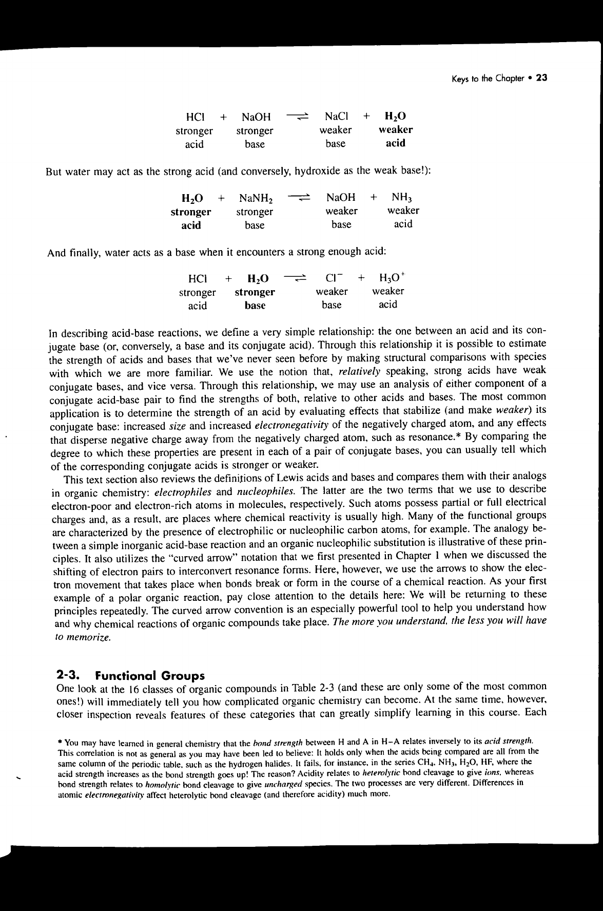 Keys to the Chapter 23 HCI + NaOH NaCl + H2O stronger stronger weaker weaker acid base base acid But water may act as the strong acid (and conversely, hydroxide as the weak base!): + NaNH₂ NaOH + NH₃ stronger stronger weaker weaker acid base base acid And finally, water acts as a base when it encounters a strong enough acid: HCI + + stronger stronger weaker weaker acid base base acid In describing acid-base reactions, we define a very simple relationship: the one between an acid and its con- jugate base (or, conversely, a base and its conjugate acid). Through this relationship it is possible to estimate the strength of acids and bases that we've never seen before by making structural comparisons with species with which we are more familiar. We use the notion that, relatively speaking, strong acids have weak conjugate bases, and vice versa. Through this relationship, we may use an analysis of either component of a conjugate acid-base pair to find the strengths of both, relative to other acids and bases. The most common application is to determine the strength of an acid by evaluating effects that stabilize (and make weaker) its conjugate base: increased size and increased electronegativity of the negatively charged atom, and any effects that disperse negative charge away from the negatively charged atom, such as resonance.* By comparing the degree to which these properties are present in each of a pair of conjugate bases, you can usually tell which of the corresponding conjugate acids is stronger or weaker. This text section also reviews the definitions of Lewis acids and bases and compares them with their analogs in organic chemistry: electrophiles and nucleophiles. The latter are the two terms that we use to describe electron-poor and electron-rich atoms in molecules, respectively. Such atoms possess partial or full electrical charges and, as a result, are places where chemical reactivity is usually high. Many of the functional groups are characterized by the presence of electrophilic or nucleophilic carbon atoms, for example. The analogy be- tween a simple inorganic acid-base reaction and an organic nucleophilic substitution is illustrative of these prin- ciples. It also utilizes the "curved arrow" notation that we first presented in Chapter 1 when we discussed the shifting of electron pairs to interconvert resonance forms. Here, however, we use the arrows to show the elec- tron movement that takes place when bonds break or form in the course of a chemical reaction. As your first example of a polar organic reaction, pay close attention to the details here: We will be returning to these principles repeatedly. The curved arrow convention is an especially powerful tool to help you understand how and why chemical reactions of organic compounds take place. The more you understand, the less you will have to memorize. 2-3. Functional Groups One look at the 16 classes of organic compounds in Table 2-3 (and these are only some of the most common ones!) will immediately tell you how complicated organic chemistry can become. At the same time, however, closer inspection reveals features of these categories that can greatly simplify learning in this course. Each You may have learned in general chemistry that the bond strength between H and A in H-A relates inversely to its acid strength. This correlation is not as general as you may have been led to believe: It holds only when the acids being compared are all from the same column of the periodic such as the hydrogen halides. It fails, for in the series NH3, HF, where the acid strength increases as the bond strength goes up! The reason? Acidity relates to heterolytic bond cleavage to give ions. whereas bond strength relates to homolytic bond cleavage to give uncharged species. The two processes are very different. Differences in atomic electronegativity affect heterolytic bond cleavage (and therefore acidity) much more.