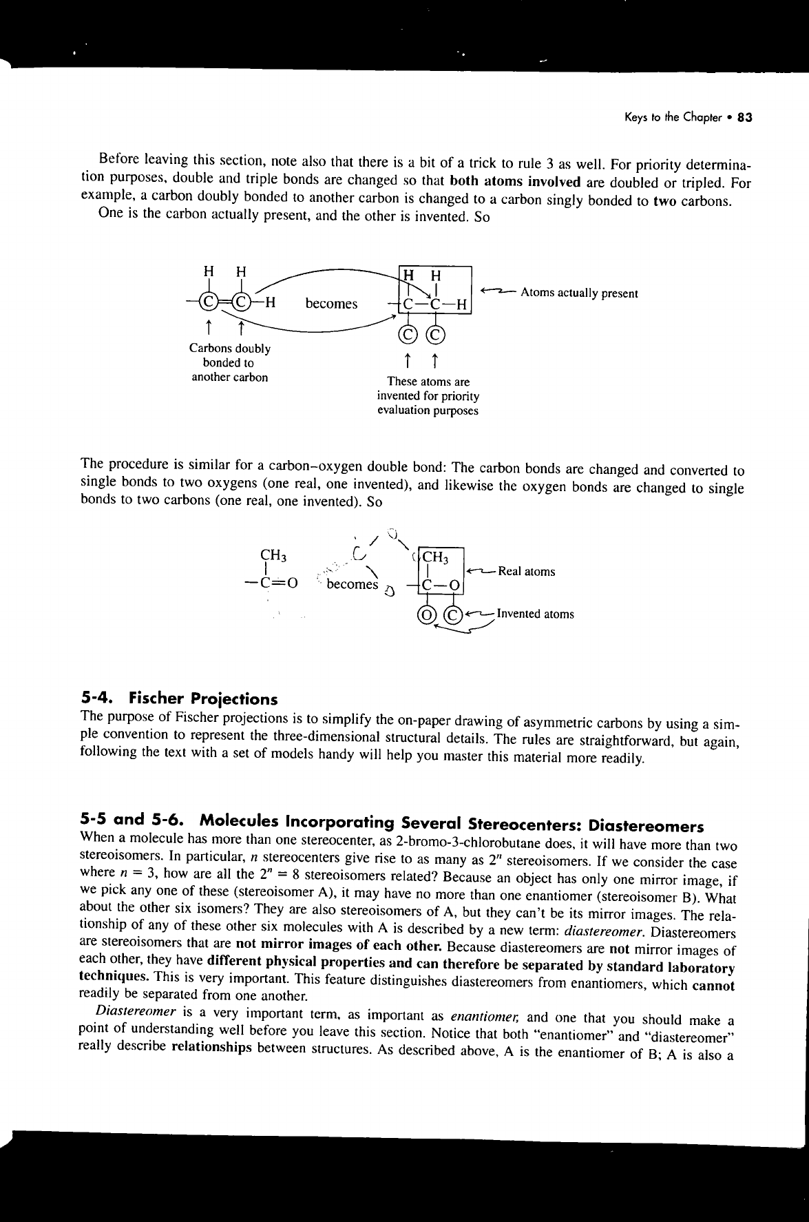 Keys to the Chapter 83 Before leaving this section, note also that there is a bit of a trick to rule 3 as well. For priority determina- tion purposes, double and triple bonds are changed that both atoms involved are doubled or tripled. For example, a carbon doubly bonded to another carbon is changed to a carbon singly bonded to two carbons. One is the carbon actually present, and the other is invented. So H H H H Atoms actually present C C H becomes C C H C C Carbons doubly bonded to another carbon These atoms are invented for priority evaluation purposes The procedure is similar for a carbon-oxygen double bond: The carbon bonds are changed and converted to single bonds to two oxygens (one real, one invented), and likewise the oxygen bonds are changed to single bonds to two carbons (one real, one invented). So CH₃ CH₃ Real atoms C becomes C C Invented atoms 5-4. Fischer Projections The purpose of Fischer projections is to simplify the on-paper drawing of asymmetric carbons by using a sim- ple convention to represent the three-dimensional structural details. The rules are straightforward, but again, following the text with a set of models handy will help you master this material more readily. 5-5 and 5-6. Molecules Incorporating Several Stereocenters: Diastereomers When a molecule has more than one stereocenter, as 2-bromo-3-chlorobutane does, it will have more than two stereoisomers. In particular, n stereocenters give rise to as many as 2" stereoisomers. If we consider the case where n = 3, how are all the = 8 stereoisomers related? Because an object has only one mirror image, if we pick any one of these (stereoisomer A), it may have no more than one enantiomer (stereoisomer B). What about the other six isomers? They are also stereoisomers of A, but they can't be its mirror images. The rela- tionship of any of these other six molecules with A is described by a new term: diastereomer. Diastereomers are stereoisomers that are not mirror images of each other. Because diastereomers are not mirror images of each other, they have different physical properties and can therefore be separated by standard laboratory techniques. This is very important. This feature distinguishes diastereomers from enantiomers, which cannot readily be separated from one another. Diastereomer is a very important as important as enantiomer, and one that you should make a point of understanding well before you leave this section. Notice that both "enantiomer" and "diastereomer" really describe relationships between structures. As described above, A is the enantiomer of B; A is also a