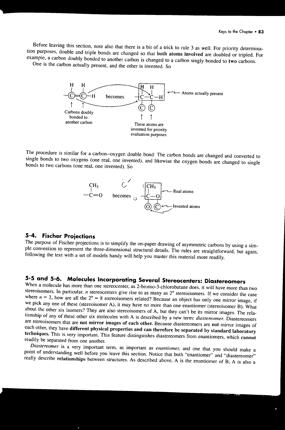 Keys to the Chapter 83 Before leaving this section, note also that there is a bit of a trick to rule 3 as well. For priority determina- tion purposes, double and triple bonds are changed so that both atoms involved are doubled or tripled. For example, a carbon doubly bonded to another carbon is changed to a carbon singly bonded to two carbons. One is the carbon actually present, and the other is invented. So H H H H Atoms actually present C C H becomes C C H C C Carbons doubly bonded to another carbon These atoms are invented for priority evaluation purposes The procedure is similar for a carbon-oxygen double bond: The carbon bonds are changed and converted to single bonds to two oxygens (one real, one invented), and likewise the oxygen bonds are changed to single bonds to two carbons (one real, one invented). So CH₃ ( CH₃ Real atoms C becomes C C Invented atoms 5-4. Fischer Projections The purpose of Fischer projections is to simplify the on-paper drawing of asymmetric carbons by using a sim- ple convention to represent the three-dimensional structural details. The rules are straightforward, but again, following the text with a set of models handy will help you master this material more readily. 5-5 and 5-6. Molecules Incorporating Several Stereocenters: Diastereomers When a molecule has more than one stereocenter, as does, it will have more than two stereoisomers. In particular, n stereocenters give rise to as many as 2" stereoisomers. If we consider the case where n = 3, how are all the 2" = 8 stereoisomers related? Because an object has only one mirror image, if we pick any one of these (stereoisomer A), it may have no more than one enantiomer (stereoisomer B). What about the other six isomers? They are also stereoisomers of A, but they can't be its mirror images. The rela- tionship of any of these other six molecules with A is described by a new term: diastereomer. Diastereomers are stereoisomers that are not mirror images of each other. Because diastereomers are not mirror images of each other, they have different physical properties and can therefore be separated by standard laboratory techniques. This is very important. This feature distinguishes diastereomers from enantiomers, which cannot readily be separated from one another. Diastereomer is a very important term. as important as enantiomer, and one that you should make a point of understanding well before you leave this section. Notice that both "enantiomer" and "diastereomer" really describe relationships between structures. As described above, A is the enantiomer of B; A is also a
