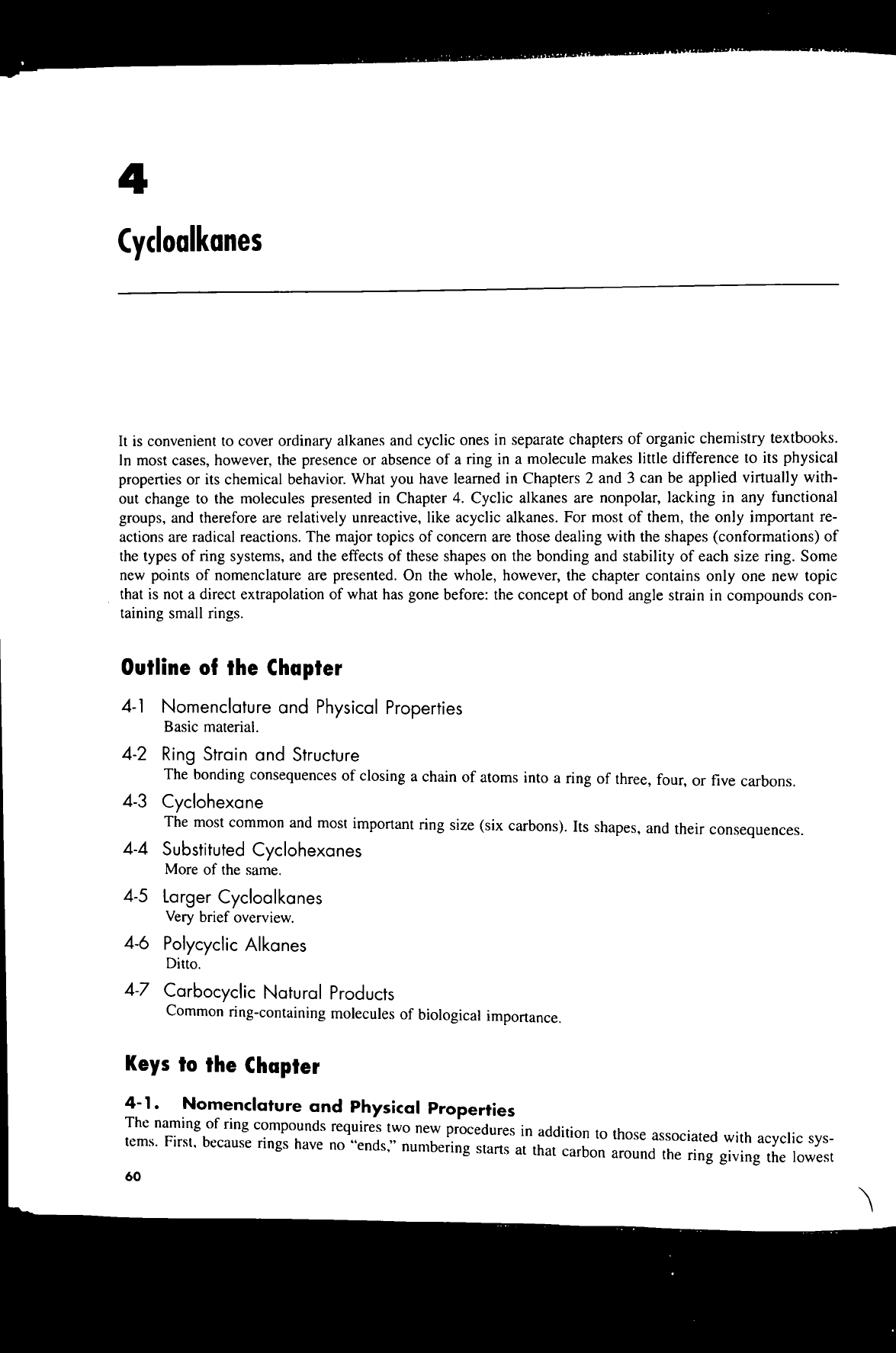4 Cycloalkanes It is convenient to cover ordinary alkanes and cyclic ones in separate chapters of organic chemistry textbooks. In most cases, however, the presence or absence of a ring in a molecule makes little difference to its physical properties or its chemical behavior. What you have learned in Chapters 2 and 3 can be applied virtually with- out change to the molecules presented in Chapter 4. Cyclic alkanes are nonpolar, lacking in any functional groups, and therefore are relatively unreactive, like acyclic alkanes. For most of them, the only important re- actions are radical reactions. The major topics of concern are those dealing with the shapes (conformations) of the types of ring systems, and the effects of these shapes on the bonding and stability of each size ring. Some new points of nomenclature are presented. On the whole, however, the chapter contains only one new topic that is not a direct extrapolation of what has gone before: the concept of bond angle strain in compounds con- taining small rings. Outline of the Chapter 4-1 Nomenclature and Physical Properties Basic material. 4-2 Ring Strain and Structure The bonding consequences of closing a chain of atoms into a ring of three, four, or five carbons. 4-3 Cyclohexane The most common and most important ring size (six carbons). Its shapes, and their consequences. 4-4 Substituted Cyclohexanes More of the same. 4-5 Larger Cycloalkanes Very brief overview. 4-6 Polycyclic Alkanes Ditto. 4-7 Carbocyclic Natural Products Common ring-containing molecules of biological importance. Keys to the Chapter 4-1. Nomenclature and Physical Properties The naming First, because of ring compounds requires two new procedures in addition to those associated with acyclic sys- tems. rings have no "ends," numbering starts at that carbon around the ring giving the lowest 60