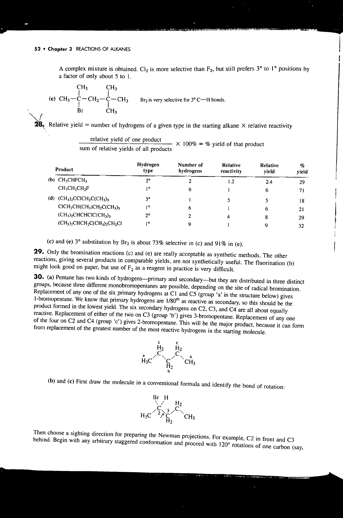 52 Chapter 3 REACTIONS OF ALKANES A complex mixture is obtained. Cl₂ is more selective than F₂, but still prefers 3° to 1° positions by a factor of only about 5 to 1. CH₃ CH₃ (e) CH₃ CH₂ CH₃ Br₂ is very selective for 3° C-H bonds. Br CH₃ 28 Relative yield = number of hydrogens of a given type in the starting alkane X relative reactivity relative yield of one product X 100% = % yield of that product sum of relative yields of all products Hydrogen Number of Relative Relative % Product type hydrogens reactivity yield yield (b) 2° 2 1.2 2.4 29 CH₃CH₂CH₂F 1° 6 1 6 71 (d) 3° 1 5 5 18 1° 6 1 6 21 2° 2 4 8 29 1° 9 1 9 32 (c) and (e) 3° substitution by Br₂ is about 73% selective in (c) and 91% in (e). 29. Only the bromination reactions (c) and (e) are really acceptable as synthetic methods. The other reactions, giving several products in comparable yields, are not synthetically useful. The fluorination (b) might look good on paper, but use of as a reagent in practice is very difficult. 30. (a) Pentane has two kinds of hydrogens-primary and secondary-but they are distributed in three distinct groups, because three different monobromopentanes are possible, depending on the site of radical bromination. Replacement of any one of the six primary hydrogens at and C5 (group 'a' in the structure below) gives 1-bromopentane. We know that primary hydrogens are 1/80th as reactive as secondary, so this should be the product formed in the lowest yield. The six secondary hydrogens on C2, C3, and C4 are all about equally reactive. Replacement of either of the two on C3 (group 'b') gives 3-bromopentane. Replacement of any one of the four on C2 and C4 (group 'c') gives 2-bromopentane. This will be the major product, because it can form from replacement of the greatest number of the most reactive hydrogens in the starting molecule. c H₂ H₂ C C a a H₃C C CH₃ H₂ b (b) and (c) First draw the molecule in a conventional formula and identify the bond of rotation: Br H H₂ C C 3 2 H₃C C CH₃ H₂ Then choose a sighting direction for preparing the Newman projections. For example, C2 in front and C3 behind. Begin with any arbitrary staggered conformation and proceed with 120° rotations of one carbon (say,