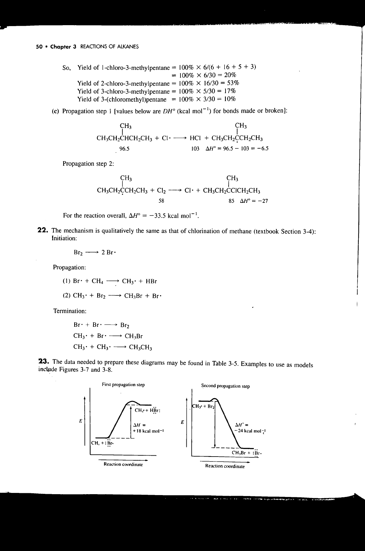 50 Chapter 3 REACTIONS OF ALKANES So, Yield of 1-chloro-3-methylpentane = 100% X 6/(6 + 16 + 5 + 3) = 100% X 6/30 = 20% Yield of = 100% X 16/30 = 53% Yield of 3-chloro-3-methylpentane = 100% X 5/30 = 17% Yield of 3-(chloromethyl)pentane = 100% X 3/30 = 10% (c) Propagation step 1 [values below are DH° (kcal for bonds made or broken]: CH₃ CH₃ + HCI + 96.5 103 = 96.5 - 103 = -6.5 Propagation step 2: CH₃ CH₃ + Cl₂ + 58 85 = -27 For the reaction overall, = 33.5 kcal mol⁻¹. 22. The mechanism is qualitatively the same as that of chlorination of methane (textbook Section 3-4): Initiation: Br₂ 2 Br. Propagation: (1) Br. + CH₄ CH₃· + HBr (2) CH₃· + Br₂ CH₃Br + Br. Termination: Br. + Br. Br₂ CH₃· + Br. CH₃Br CH₃· + CH₃CH₃ 23. The data needed to prepare these diagrams may be found in Table 3-5. Examples to use as models include Figures 3-7 and 3-8. First propagation step Second propagation step + Br₂ + HBr: E E = = + 18 kcal 24 kcal mol⁻¹ CH, + + :Br. Reaction coordinate Reaction coordinate