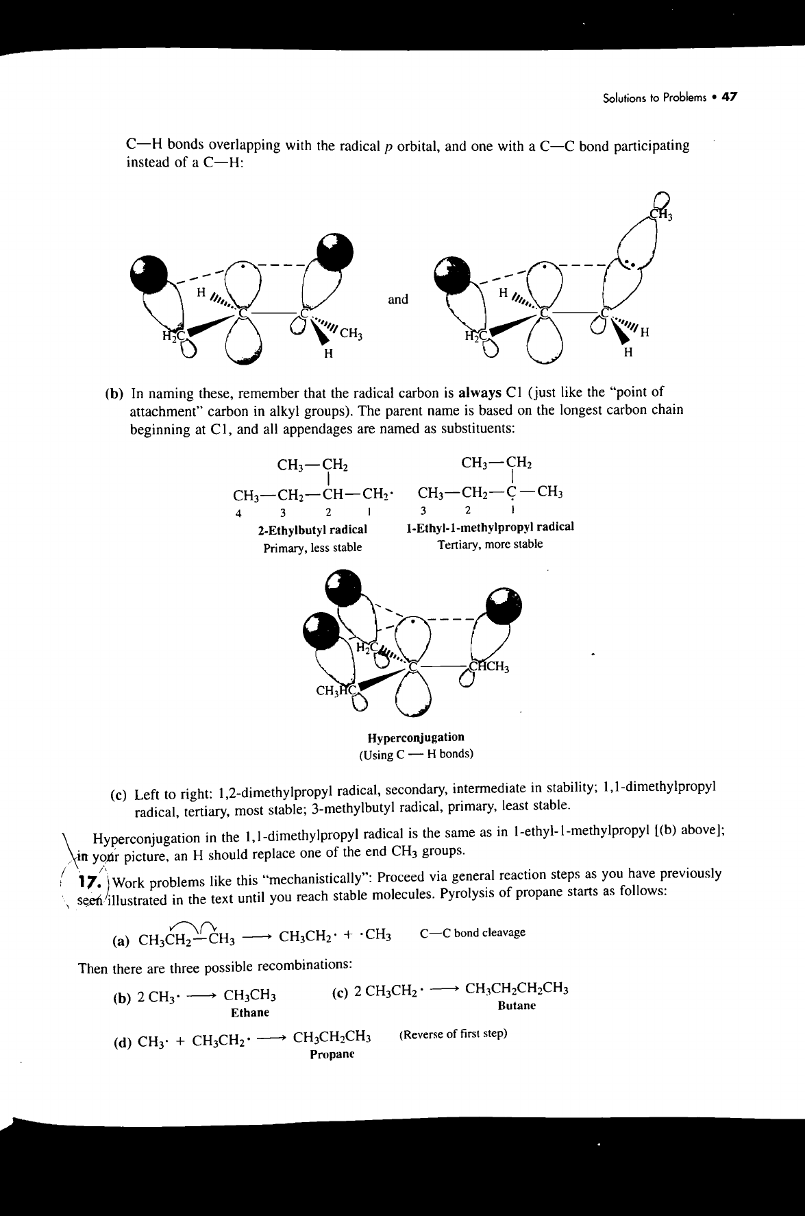 Solutions to Problems 47 C-H bonds overlapping with the radical p orbital, and one with a bond participating instead of a C-H: CH₃ H H and H2C CH₃ H H H (b) In naming these, remember that the radical carbon is always (just like the "point of attachment" carbon in alkyl groups). The parent name is based on the longest carbon chain beginning at C1, and all appendages are named as substituents: CH₃-CH₂ CH₃-CH₂ 4 3 2 3 2 2-Ethylbutyl radical radical Primary, less stable Tertiary, more stable HC C CHCH₃ CH₃HC Hyperconjugation (Using C H bonds) (c) Left to right: 1,2-dimethylpropyl radical, secondary, intermediate in stability; radical, tertiary, most stable; 3-methylbutyl radical, primary, least stable. Hyperconjugation in the radical is the same as in [(b) above]; in picture, an H should replace one of the end CH₃ groups. 17. Work problems like this "mechanistically": Proceed via general reaction steps as you have previously seen/illustrated in the text until you reach stable molecules. Pyrolysis of propane starts as follows: (a) CH₃CH₂-CH₃ CH₃CH₂· + CH₃ bond cleavage Then there are three possible recombinations: (b) 2 CH₃· CH₃CH₃ (c) 2 CH₃CH₂CH₂CH₃ Ethane Butane (d) + CH₃CH₂CH₃ (Reverse of first step) Propane