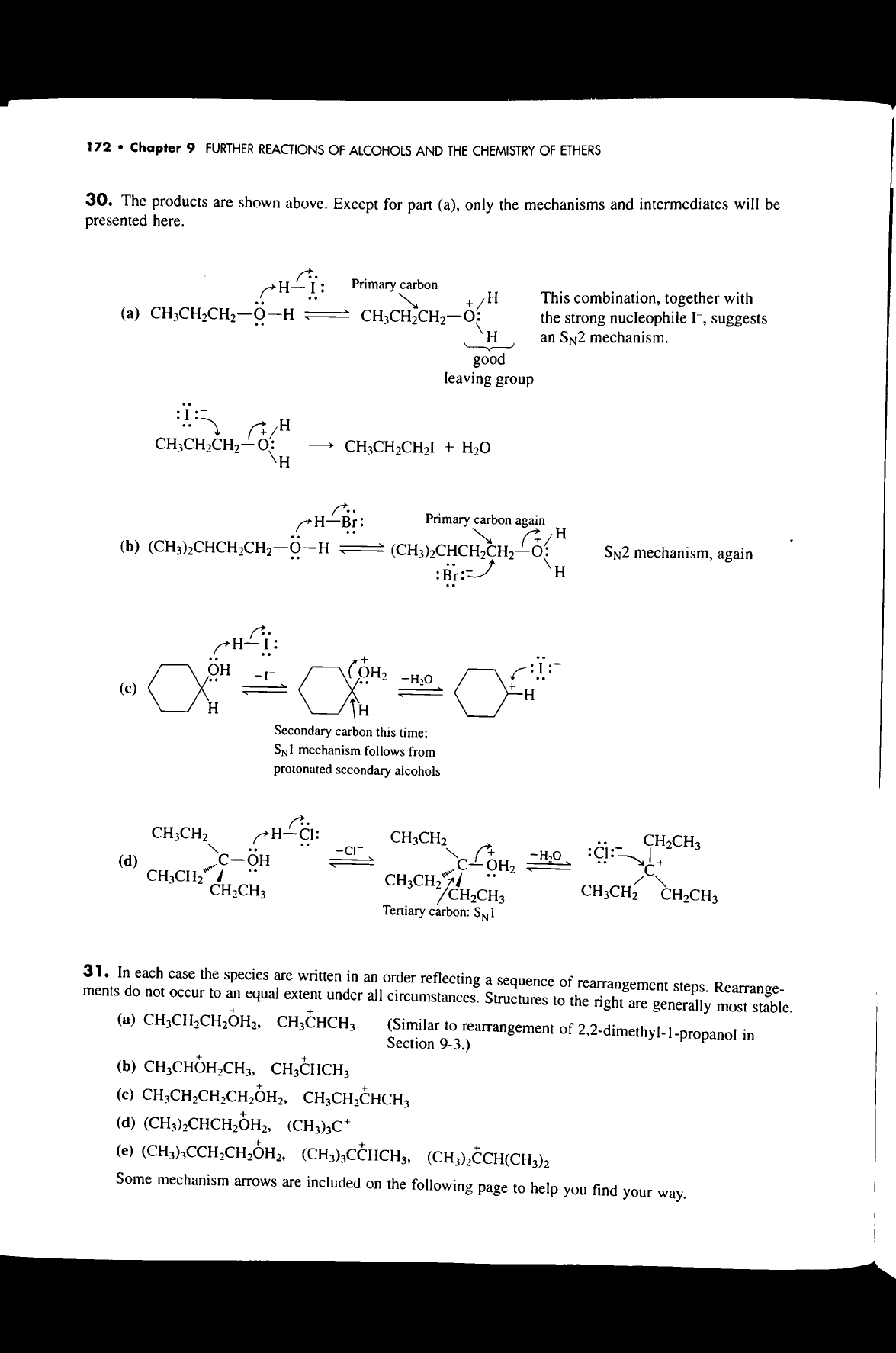 172 Chapter 9 FURTHER REACTIONS OF ALCOHOLS AND THE CHEMISTRY OF ETHERS 30. The products are shown above. Except for part (a), only the mechanisms and intermediates will be presented here. H Primary carbon H This combination, together with + (a) the strong nucleophile I⁻, suggests H an SN2 mechanism. good leaving group CH₃CH₂CH₂I + H₂O H-Br: Primary carbon again H (b) SN2 mechanism, again :Br: H H-1: + OH OH₂ + (c) H H H Secondary carbon this time; mechanism follows from protonated secondary alcohols CH₃CH₂ H Cl: CH₃CH₂ CH₂CH₃ + + (d) C OH C OH₂ C CH₃CH₂ CH₃CH₂ CH₂CH₃ CH₂CH₃ CH₃CH₂ CH₂CH₃ Tertiary carbon: 31. In each case the species are written in an order reflecting a sequence of rearrangement steps. Rearrange- ments do not occur to an equal extent under all circumstances. Structures to the right are generally most stable. (a) + CH₃CHCH₃ + (Similar to rearrangement of 2,2-dimethyl-1-propanol in Section 9-3.) (b) CH₃CHOH₂CH₃, CH₃CHCH₃ (c) CH₃CH₂CHCH₃ (d) (CH₃)₂CHCH₂OH₂, (CH₃)₃C⁺ (e) + (CH₃)₂CCH(CH₃)₂ Some mechanism arrows are included on the following page to help you find your way.