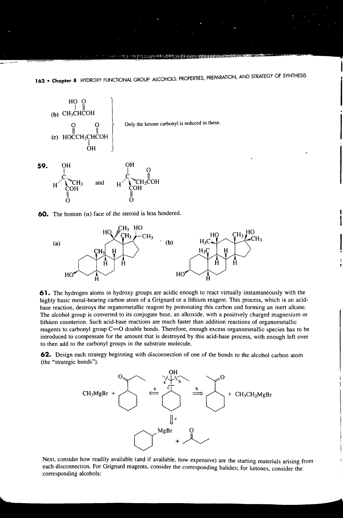 162 Chapter 8 HYDROXY FUNCTIONAL GROUP: ALCOHOLS: PROPERTIES, PREPARATION, AND STRATEGY OF SYNTHESIS HO (b) CH₃CHCOH O Only the ketone carbonyl is reduced in these. (c) OH 59. OH OH 0 C C H CH₃ and H CH₂COH COH COH O 60. The bottom (α) face of the steroid is less hindered. CH₃ HO HO CH₃ HO CH₃ CH₃ (a) (b) CH₃ CH₃ H H H H H H HO H H 61. The hydrogen atoms in hydroxy groups are acidic enough to react virtually instantaneously with the highly basic metal-bearing carbon atom of a Grignard or a lithium reagent. This process, which is an acid- base reaction, destroys the organometallic reagent by protonating this carbon and forming an inert alkane. The alcohol group is converted to its conjugate base, an alkoxide, with a positively charged magnesium or lithium counterion. Such acid-base reactions are much faster than addition reactions of organometallic reagents to carbonyl group double bonds. Therefore, enough excess organometallic species has to be introduced to compensate for the amount that is destroyed by this acid-base process, with enough left over to then add to the carbonyl groups in the substrate molecule. 62. Design each strategy beginning with disconnection of one of the bonds to the alcohol carbon atom (the "strategic bonds"). OH O a b a b CH₃MgBr + + CH₃CH₂MgBr c MgBr O + consider how readily available (and if available, how expensive) are the starting materials arising from each disconnection. For Grignard reagents, consider the corresponding halides; for ketones, consider the corresponding alcohols: