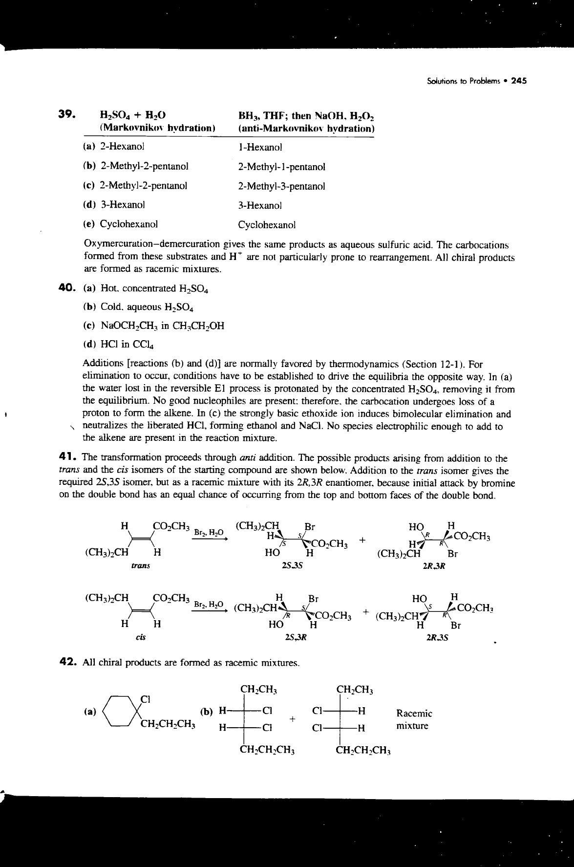 Solutions to Problems 245 39. + H₂O BH₃, THF; then NaOH, H₂O₂ (Markovnikov hydration) (anti-Markovnikov hydration) (a) 2-Hexanol 1-Hexanol (b) 2-Methyl-2-pentanol 2-Methyl-1-pentanol (c) 2-Methyl-2-pentanol 2-Methyl-3-pentanol (d) 3-Hexanol 3-Hexanol (e) Cyclohexanol Cyclohexanol Oxymercuration-demercuration gives the same products as aqueous sulfuric acid. The carbocations formed from these substrates and are not particularly prone to rearrangement. All chiral products are formed as racemic mixtures. 40. (a) Hot. concentrated H₂SO₄ (b) Cold. aqueous H₂SO₄ (c) NaOCH₂CH₃ in CH₃CH₂OH (d) HCI in Additions [reactions (b) and (d)] are normally favored by thermodynamics (Section 12-1). For elimination to occur, conditions have to be established to drive the equilibria the opposite way. In (a) the water lost in the reversible process is protonated by the concentrated H₂SO₄, removing it from the equilibrium. No good nucleophiles are present: therefore. the carbocation undergoes loss of a proton to form the alkene. In (c) the strongly basic ethoxide ion induces bimolecular elimination and neutralizes the liberated forming ethanol and NaCl. No species electrophilic enough to add to the alkene are present in the reaction mixture. 41. The transformation proceeds through anti addition. The possible products arising from addition to the trans and the cis isomers of the starting compound are shown below. Addition to the trans isomer gives the required isomer, but as a racemic mixture with its 2R,3R because initial attack by bromine on the double bond has an equal chance of occurring from the top and bottom faces of the double bond. H CO₂CH₃ (CH₃)₂CH Br HO H Br₂, H₂O 5 R + CO₂CH₃ CO₂CH₃ R (CH₃)₂CH H HO H (CH₃)₂CH Br trans 2S.3S 2R.3R (CH₃)₂CH H Br H (CH₃)₂CH + R H H HO H H Br cis 2S,3R 2R.3S 42. All chiral products are formed as racemic mixtures. CH₂CH₃ CH₂CH₃ (a) (b) H Cl H Racemic + CH₂CH₂CH₃ H CI H mixture CH₂CH₂CH₃ CH₂CH₂CH₃