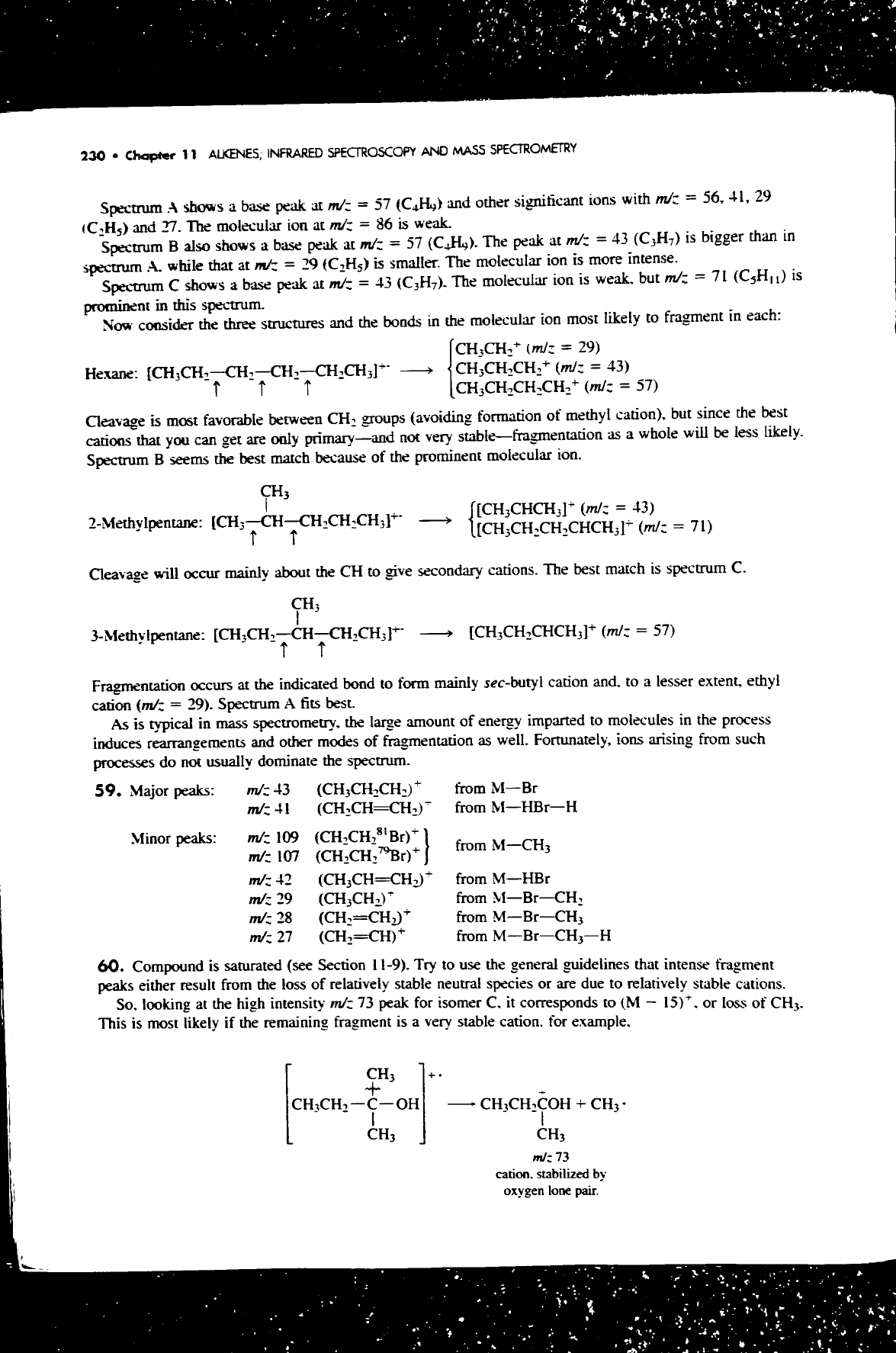 230 Chapter 11 ALKENES; INFRARED SPECTROSCOPY AND MASS SPECTROMETRY Spectrum A shows a base peak at = 57 and other significant ions with = 56, 41, 29 (C₂H₅) and 27. The molecular ion at = 86 is weak. Spectrum B also shows a base peak at = 57 The peak at m/z = 43 (C₃H₇) is bigger than in spectrum A. while that at = 29 (C₂H₅) is smaller. The molecular ion is more intense. Spectrum C shows a base peak at = 43 (C₃H₇). The molecular ion is weak. but = 71 (C₅H₁₁) is prominent in this spectrum. Now consider the three structures and the bonds in the molecular ion most likely to fragment in each: CH₃CH₂⁺ (m/z = 29) Hexane: CH₃CH₂CH₂⁺ (m/z = 43) = 57) Cleavage is most favorable between CH₂ groups (avoiding formation of methyl cation), but since the best cations that you can get are only primary-and not very stable-fragmentation as a whole will be less likely. Spectrum B seems the best match because of the prominent molecular ion. CH₃ (m/z = 43) 2-Methylpentane: = 71) Cleavage will occur mainly about the CH to give secondary cations. The best match is spectrum C. CH₃ 3-Methylpentane: = 57) Fragmentation occurs at the indicated bond to form mainly sec-butyl cation to a lesser extent, ethyl cation = 29). Spectrum A fits best. As is typical in mass spectrometry, the large amount of energy imparted to molecules in the process induces rearrangements and other modes of fragmentation as well. Fortunately, ions arising from such processes do not usually dominate the spectrum. 59. Major peaks: 43 (CH₃CH₂CH₂)⁺ from M-Br m/= 41 from M-HBr-H Minor peaks: 109 107 } from M-CH₃ 42 from M-HBr m/z 29 from 28 from 27 (CH₂=CH)⁺ from M-Br-CH₃-H 60. Compound is saturated (see Section 11-9). Try to use the general guidelines that intense fragment peaks either result from the loss of relatively stable neutral species or are due to relatively stable cations. So. looking at the high intensity 73 peak for isomer C. it corresponds to (M or loss of CH₃. This is most likely if the remaining fragment is a very stable cation. for example. CH₃ + + CH₃ CH₃ 73 cation. stabilized by oxygen lone pair.