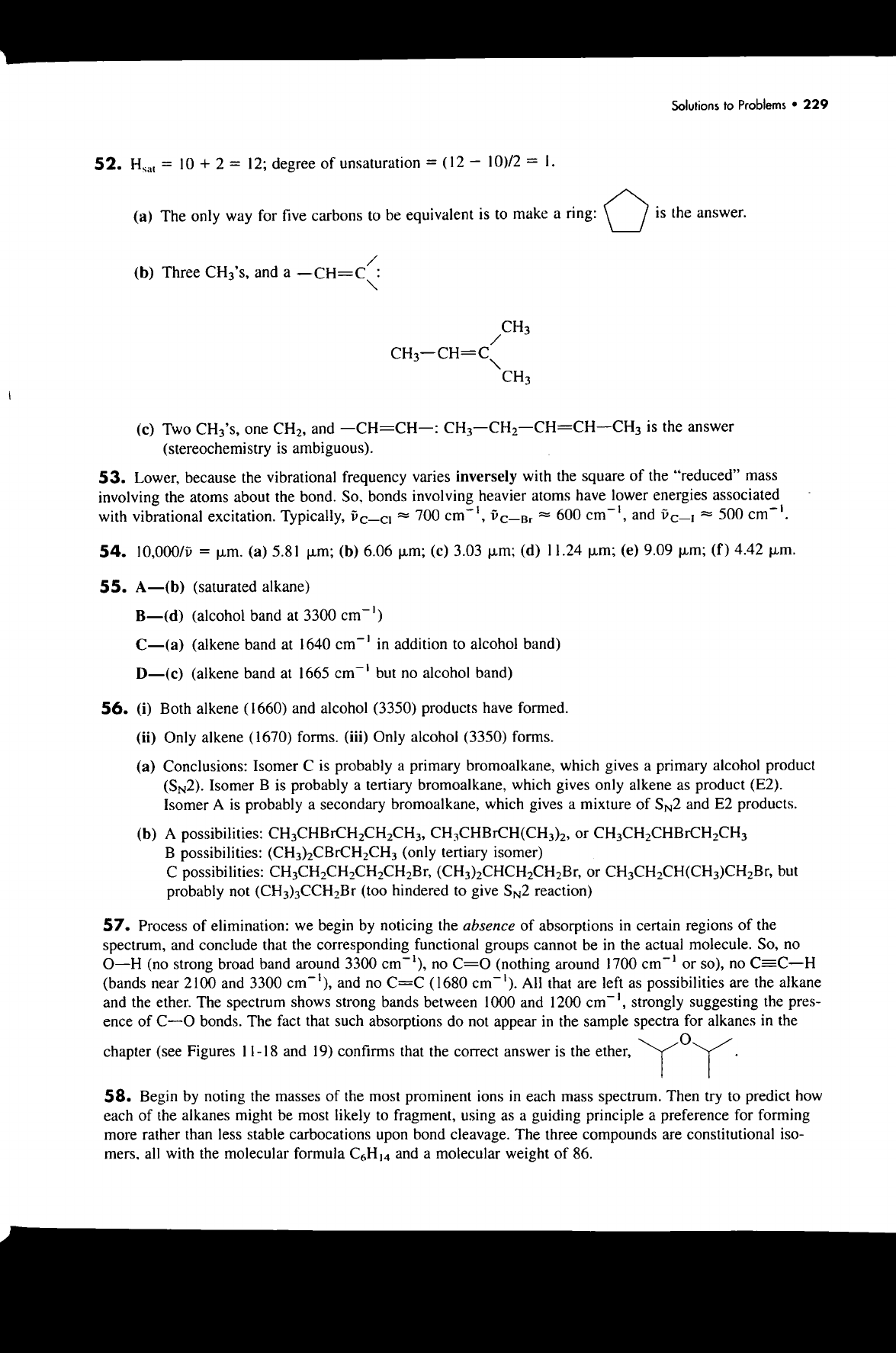 Solutions to Problems 229 52. = 10 + 2 = 12; degree of unsaturation = (12 10)/2 = (a) The only way for five carbons to be equivalent is to make a ring: is the answer. (b) Three CH₃'s, and a -CH=C CH₃ CH₃ (c) Two CH₃'s, one CH₂, and is the answer (stereochemistry is ambiguous). 53. Lower, because the vibrational frequency varies inversely with the square of the "reduced" mass involving the atoms about the bond. So, bonds involving heavier atoms have lower energies associated with vibrational excitation. Typically, ≈ 700 cm⁻¹, ≈ 600 cm⁻¹, and 500 cm⁻¹. 54. 10,000/v = µm. (a) 5.81 µm; (b) 6.06 µm; (c) 3.03 µm; (d) 11.24 µm; (e) 9.09 µm; (f) 4.42 µm. 55. A-(b) (saturated alkane) (alcohol band at 3300 cm⁻¹) C-(a) (alkene band at 1640 cm⁻¹ in addition to alcohol band) (alkene band at 1665 cm⁻¹ but no alcohol band) 56. (i) Both alkene (1660) and alcohol (3350) products have formed. (ii) Only alkene (1670) forms. (iii) Only alcohol (3350) forms. (a) Conclusions: Isomer C is probably a primary bromoalkane, which gives a primary alcohol product Isomer B is probably a tertiary bromoalkane, which gives only alkene as product (E2). Isomer A is probably a secondary bromoalkane, which gives a mixture of SN2 and E2 products. (b) A possibilities: CH₃CHBrCH(CH₃)₂, or CH₃CH₂CHBrCH₂CH₃ B possibilities: (CH₃)₂CBrCH₂CH₃ (only tertiary isomer) C possibilities: or but probably not (CH₃)₃CCH₂Br (too hindered to give SN2 reaction) 57. Process of elimination: we begin by noticing the absence of absorptions in certain regions of the spectrum, and conclude that the corresponding functional groups cannot be in the actual molecule. So, no (no strong broad band around 3300 cm⁻¹), no (nothing around 1700 cm⁻¹ or so), no C=C-H (bands near 2100 and 3300 cm⁻¹), and no C=C (1680 cm⁻¹). All that are left as possibilities are the alkane and the ether. The spectrum shows strong bands between 1000 and 1200 cm⁻¹, strongly suggesting the pres- ence of bonds. The fact that such absorptions do not appear in the sample spectra for alkanes in the O chapter (see Figures 11-18 and 19) confirms that the correct answer is the ether, 58. Begin by noting the masses of the most prominent ions in each mass spectrum. Then try to predict how each of the alkanes might be most likely to fragment, using as a guiding principle a preference for forming more rather than less stable carbocations upon bond cleavage. The three compounds are constitutional iso- mers, all with the molecular formula C₆H₁₄ and a molecular weight of 86.