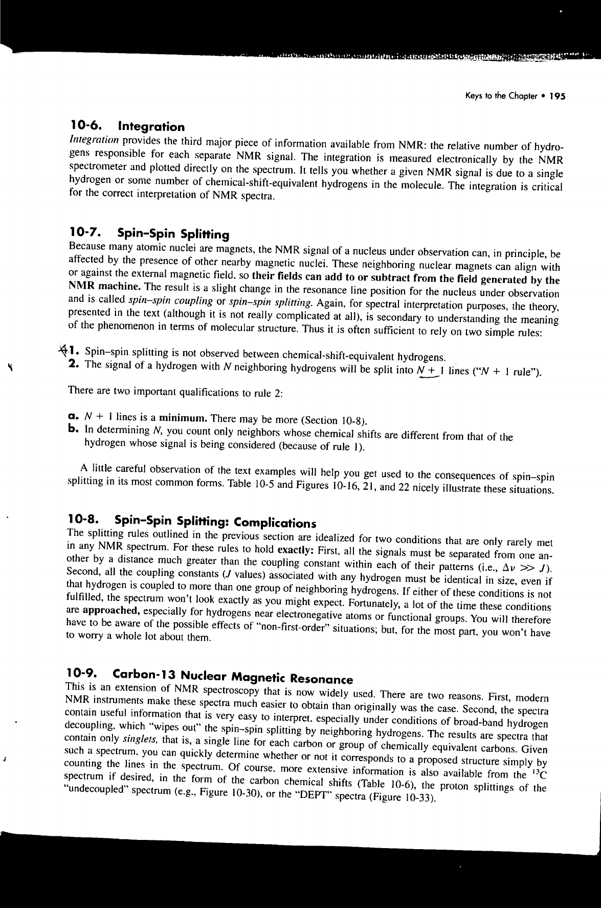 Keys to the Chapter 195 10-6. Integration Integration provides the third major piece of information available from NMR: the relative number of hydro- gens responsible for each separate NMR signal. The integration is measured electronically by the NMR spectrometer and plotted directly on the spectrum. It tells you whether a given NMR signal is due to a single hydrogen or some number of hydrogens in the molecule. The integration is critical for the correct interpretation of NMR spectra. 10-7. Spin-Spin Splitting Because many atomic nuclei are magnets, the NMR signal of a nucleus under observation can, in principle, be affected by the presence of other nearby magnetic nuclei. These neighboring nuclear magnets can align with or against the external magnetic field. so their fields can add to or subtract from the field generated by the NMR machine. The result is a slight change in the resonance line position for the nucleus under observation and is called spin-spin coupling or spin-spin splitting. Again, for spectral interpretation purposes, the theory, presented in the text (although it is not really complicated at all), is secondary to understanding the meaning of the phenomenon in terms of molecular structure. Thus it is often sufficient to rely on two simple rules: Spin-spin splitting is not observed between chemical-shift-equivalent hydrogens. 2. The signal of a hydrogen with N neighboring hydrogens will be split into N+ 1 lines ("N + 1 rule"). There are two important qualifications to rule 2: a. N + 1 lines is a minimum. There may be more (Section 10-8). b. In determining N, you count only neighbors whose chemical shifts are different from that of the hydrogen whose signal is being considered (because of rule 1). A little careful observation of the text examples will help you get used to the consequences of spin-spin splitting in its most common forms. Table 10-5 and Figures 10-16, 21, and 22 nicely illustrate these situations. 10-8. Spin-Spin Splitting: Complications The splitting rules outlined in the previous section are idealized for two conditions that are only rarely met in any NMR spectrum. For these rules to hold exactly: First, all the signals must be separated from one an- other by a distance much greater than the coupling constant within each of their patterns (i.e., » J). Second, all the coupling constants (J values) associated with any hydrogen must be identical in size, even if that hydrogen is coupled to more than one group of neighboring hydrogens. If either of these conditions is not fulfilled, the spectrum won't look exactly as you might expect. Fortunately, a lot of the time these conditions are approached, especially for hydrogens near electronegative atoms or functional groups. You will therefore have to be aware of the possible effects of "non-first-order" situations; but, for the most part, you won't have to worry a whole lot about them. 10-9. Carbon-13 Nuclear Magnetic Resonance This is an extension of NMR spectroscopy that is now widely used. There are two reasons. First, modern NMR instruments make these spectra much easier to obtain than originally was the case. Second, the spectra contain useful information that is very easy to especially under conditions of broad-band hydrogen decoupling, which "wipes out" the spin-spin splitting by neighboring hydrogens. The results are spectra that contain only singlets, that is, a single line for each carbon or group of chemically equivalent carbons. Given such a spectrum, you can quickly determine whether or not it corresponds to a proposed structure simply by counting the lines in the spectrum. Of course, more extensive information is also available from the spectrum if desired, in the form of the carbon chemical shifts (Table 10-6), the proton splittings of the "undecoupled" spectrum (e.g., Figure 10-30), or the "DEPT" spectra (Figure 10-33).