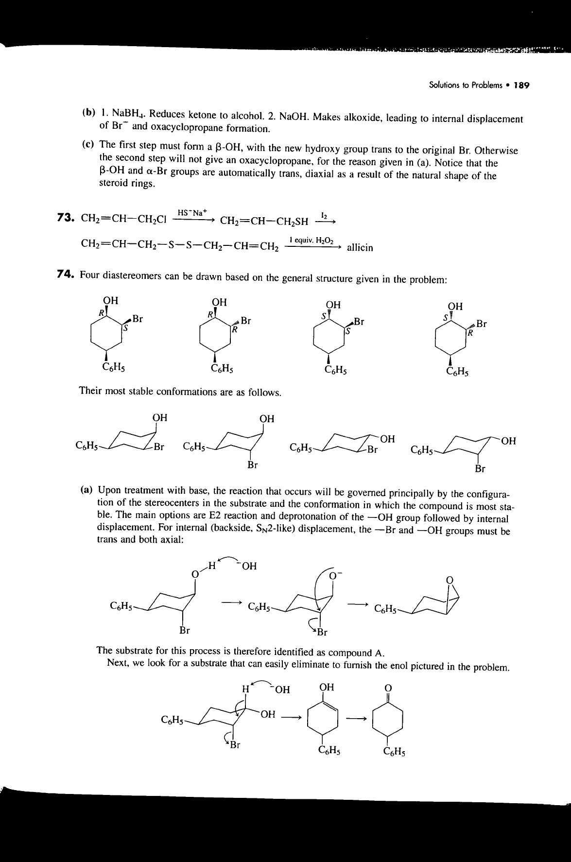 Solutions to Problems 189 (b) 1. NaBH₄. Reduces ketone to alcohol. 2. NaOH. Makes alkoxide, leading to internal displacement of Br⁻ and oxacyclopropane formation. (c) The first step must form a ß-OH, with the new hydroxy group trans to the original Br. Otherwise the second step will not give an oxacyclopropane, for the reason given in (a). Notice that the ß-OH and α-Br groups are automatically trans, diaxial as a result of the natural shape of the steroid rings. 73. I₂ I equiv. H₂O₂ allicin 74. Four diastereomers can be drawn based on the general structure given in the problem: OH OH OH OH R R Br S Br Br S Br S R S R C₆H₅ C₆H₅ C₆H₅ C₆H₅ Their most stable conformations are as follows. OH OH OH OH C₆H₅ Br C₆H₅ C₆H₅ Br C₆H₅ Br Br (a) Upon treatment with base, the reaction that occurs will be governed principally by the configura- tion of the stereocenters in the substrate and the conformation in which the compound is most sta- ble. The main options are E2 reaction and deprotonation of the -OH group followed by internal displacement. For internal (backside, displacement, the -Br and -OH groups must be trans and both axial: H OH O O C₆H₅ C₆H₅ C₆H₅ Br Br The substrate for this process is therefore identified as compound A. Next, we look for a substrate that can easily eliminate to furnish the enol pictured in the problem. H OH OH O OH C₆H₅ Br C₆H₅ C₆H₅