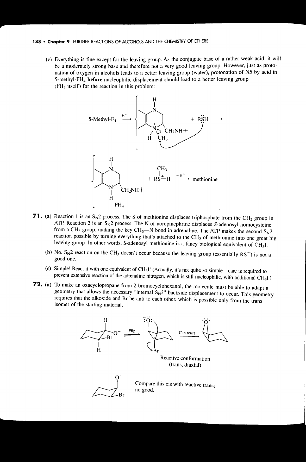188 Chapter 9 FURTHER REACTIONS OF ALCOHOLS AND THE CHEMISTRY OF ETHERS (c) Everything is fine except for the leaving group. As the conjugate base of a rather weak acid, it will be a moderately strong base and therefore not a very good leaving group. However, just as proto- nation of oxygen in alcohols leads to a better leaving group (water), protonation of N5 by acid in before nucleophilic displacement should lead to a better leaving group (FH₄ itself) for the reaction in this problem: H N + RSH + N H CH₃ H N CH₃ -H+ + methionine N H 71. (a) Reaction is an process. The S of methionine displaces triphosphate from the CH₂ group in ATP. Reaction 2 is an process. The N of norepinephrine displaces S-adenosyl homocysteine from a CH₃ making the key bond in adrenaline. The ATP makes the second reaction possible by turning everything that's attached to the CH₂ of methionine into one great big leaving group. In other words, S-adenosyl methionine is a fancy biological equivalent of (b) No. SN2 reaction on the CH₃ doesn't occur because the leaving group (essentially RS⁻) is not a good one. (c) Simple! React it with one equivalent of (Actually, it's not quite simple-care is required to prevent extensive reaction of the adrenaline which is still nucleophilic, with additional CH₃I.) 72. (a) To make an oxacyclopropane from 2-bromocyclohexanol, the molecule must be able to adapt a geometry that allows the necessary "internal SN2" backside displacement to occur. This geometry requires that the alkoxide and Br be anti to each other, which is possible only from the trans isomer of the starting material. H :0: Flip Can react Br H Br Reactive conformation (trans, diaxial) o- Compare this cis with reactive trans; no good. Br