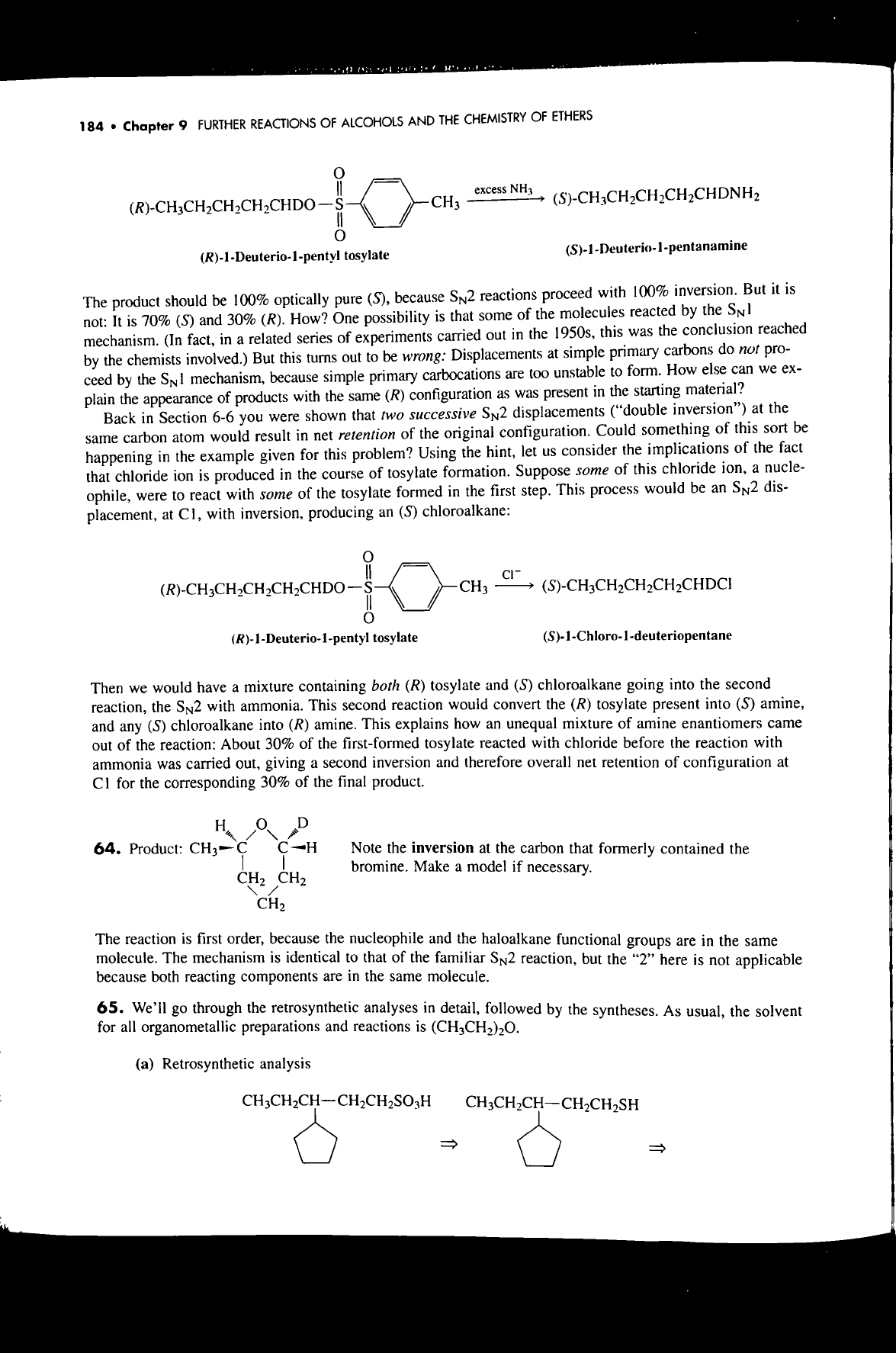 184 Chapter 9 FURTHER REACTIONS OF ALCOHOLS AND THE CHEMISTRY OF ETHERS O excess NH₃ S CH₃ O (R)-1-Deuterio-1-pentyl tosylate (S)-1-Deuterio-1-pentanamine The product should be 100% optically pure (S), because SN2 reactions proceed with 100% inversion. But it is not: It is 70% (S) and 30% (R). How? One possibility is that some of the molecules reacted by the mechanism. (In fact, in a related series of experiments carried out in the 1950s, this was the conclusion reached by the chemists involved.) But this turns out to be wrong: Displacements at simple primary carbons do not pro- ceed by the mechanism, because simple primary carbocations are too unstable to form. How else can we ex- plain the appearance of products with the same (R) configuration as was present in the starting material? Back in Section 6-6 you were shown that two successive displacements ("double inversion") at the same carbon atom would result in net retention of the original configuration. Could something of this sort be happening in the example given for this problem? Using the hint, let us consider the implications of the fact that chloride ion is produced in the course of tosylate formation. Suppose some of this chloride ion, a nucle- ophile, were to react with some of the tosylate formed in the first step. This process would be an dis- placement, at with inversion, producing an (S) chloroalkane: CH₃ (R)-1-Deuterio-1-pentyl tosylate (S)-1-Chloro-1-deuteriopentane Then we would have a mixture containing both (R) tosylate and (S) chloroalkane going into the second reaction, the SN2 with ammonia. This second reaction would convert the (R) tosylate present into (S) amine, and any (S) chloroalkane into (R) amine. This explains how an unequal mixture of amine enantiomers came out of the reaction: About 30% of the first-formed tosylate reacted with chloride before the reaction with ammonia was carried out, giving a second inversion and therefore overall net retention of configuration at for the corresponding 30% of the final product. H O D 64. Product: CH₃ C C H Note the inversion at the carbon that formerly contained the bromine. Make a model if necessary. CH₂ CH₂ CH₂ The reaction is first order, because the nucleophile and the haloalkane functional groups are in the same molecule. The mechanism is identical to that of the familiar SN2 reaction, but the "2" here is not applicable because both reacting components are in the same molecule. 65. We'll go through the retrosynthetic analyses in detail, followed by the syntheses. As usual, the solvent for all organometallic preparations and reactions is (CH₃CH₂)₂O. (a) Retrosynthetic analysis