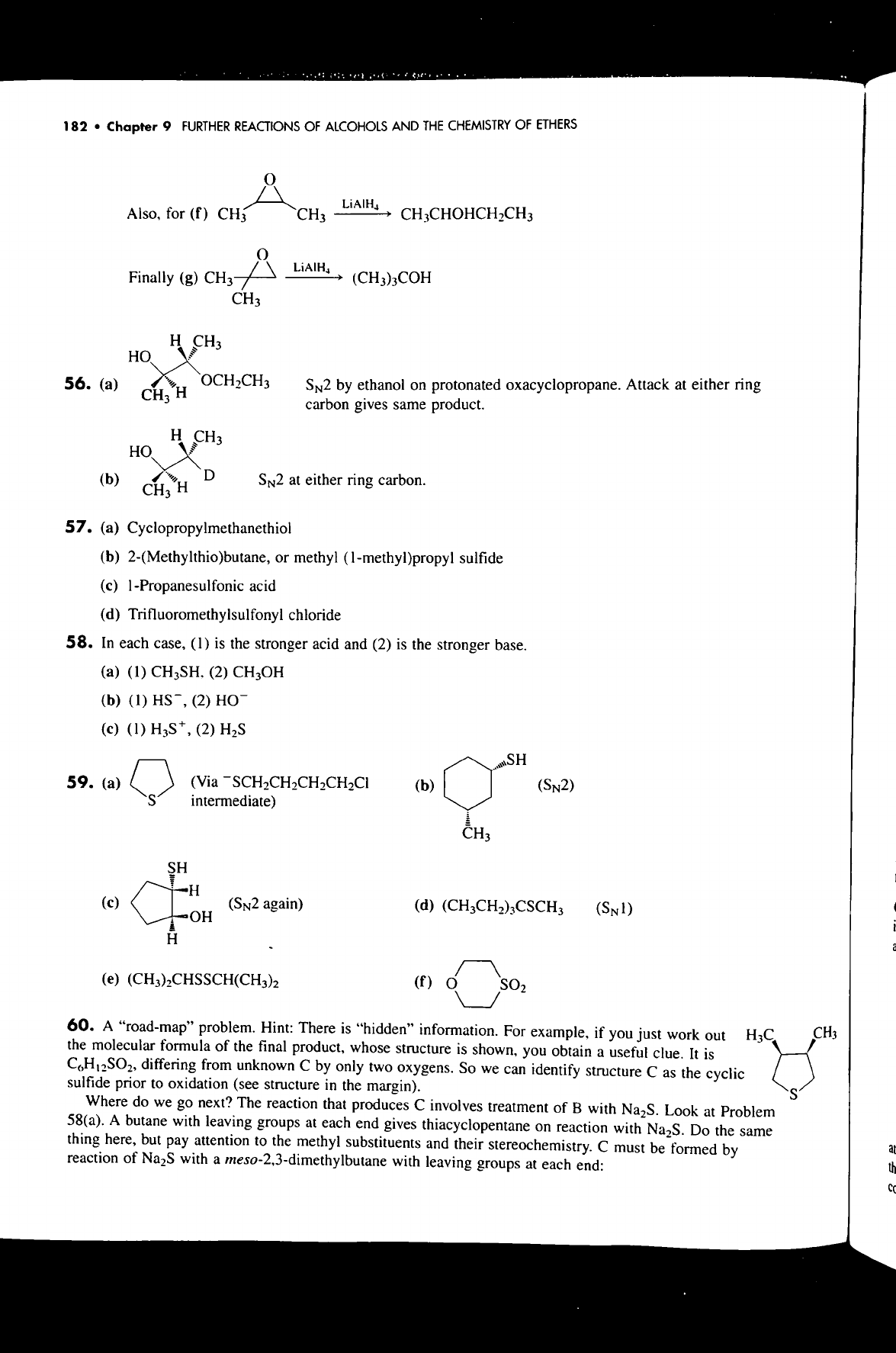 182 Chapter 9 FURTHER REACTIONS OF ALCOHOLS AND THE CHEMISTRY OF ETHERS Also, for (f) CH₃ CH₃ LiAIH, Finally (g) CH₃ (CH₃)₃COH CH₃ H CH₃ 56. (a) OCH₂CH₃ CH₃ H SN2 by ethanol on protonated oxacyclopropane. Attack at either ring carbon gives same product. H CH₃ HO (b) D H at either ring carbon. CH₃ 57. (a) Cyclopropylmethanethiol (b) 2-(Methylthio)butane, or methyl (1-methyl)propyl sulfide (c) 1-Propanesulfonic acid (d) Trifluoromethylsulfonyl chloride 58. In each case, (1) is the stronger acid and (2) is the stronger base. (a) (1) CH₃SH, (2) CH₃OH (b) (1) (2) (c) (1) H₃S⁺, (2) H₂S SH 59. (a) (b) (SN2) S intermediate) CH₃ SH H (c) (SN2 again) (d) (CH₃CH₂)₃CSCH₃ (SN1) OH H a (e) (f) SO₂ 60. A "road-map" problem. Hint: There is "hidden" information. For example, if you just work out CH₃ the molecular formula of the final product, whose structure is shown, you obtain a useful clue. It is C₆H₁₂SO₂, differing from unknown C by only two oxygens. So we can identify structure C as the cyclic sulfide prior to oxidation (see structure in the margin). S Where do we go next? The reaction that produces C involves treatment of B with Na₂S. Look at Problem 58(a). A butane with leaving groups at each end gives thiacyclopentane on reaction with Na₂S. Do the same thing here, but pay attention to the methyl substituents and their stereochemistry. C must be formed by reaction of Na₂S with a meso-2,3-dimethylbutane with leaving groups at each end: