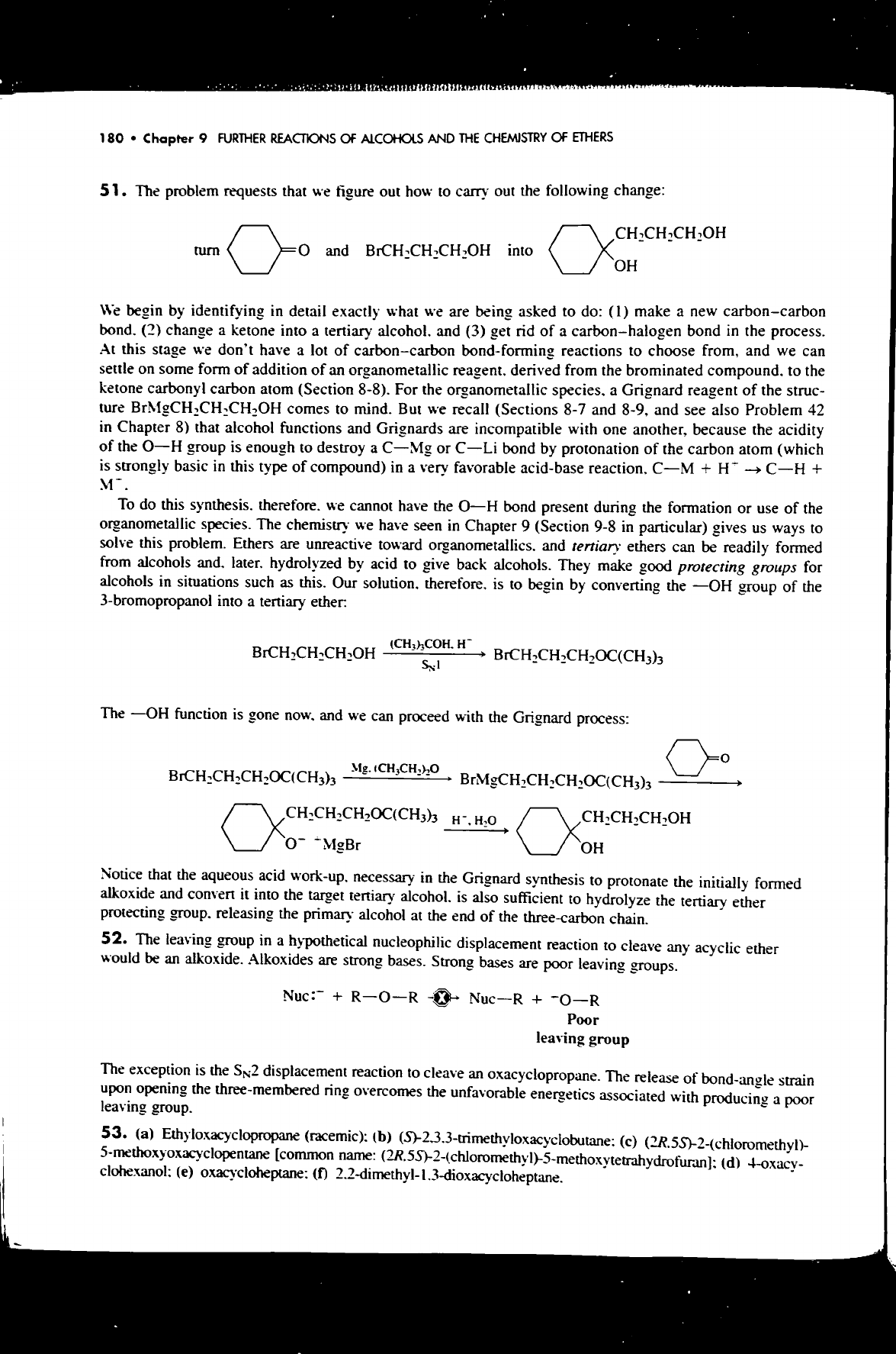 180 Chapter 9 FURTHER REACTIONS OF ALCOHOLS AND THE CHEMISTRY OF ETHERS 51. The problem requests that we figure out how to carry out the following change: CH₂CH₂CH₂OH turn and into OH We begin by identifying in detail exactly what we are being asked to do: (1) make a new carbon-carbon bond. (2) change a ketone into a tertiary alcohol. and (3) get rid of a carbon-halogen bond in the process. At this stage we don't have a lot of carbon-carbon bond-forming reactions to choose from, and we can settle on some form of addition of an organometallic reagent. derived from the brominated compound. to the ketone carbonyl carbon atom (Section 8-8). For the organometallic a Grignard reagent of the struc- ture comes to mind. But we recall (Sections 8-7 and 8-9, and see also Problem 42 in Chapter 8) that alcohol functions and Grignards are incompatible with one another, because the acidity of the 0-H group is enough to destroy a C-Mg or C-Li bond by protonation of the carbon atom (which is strongly basic in this type of compound) in a very favorable acid-base M⁻. To do this synthesis. therefore. we cannot have the bond present during the formation or use of the organometallic species. The chemistry we have seen in Chapter 9 (Section 9-8 in particular) gives us ways to solve this problem. Ethers are unreactive toward organometallics. and tertiary ethers can be readily formed from alcohols and. later. hydrolyzed by acid to give back alcohols. They make good protecting groups for alcohols in situations such as this. Our solution. therefore. is to begin by converting the -OH group of the 3-bromopropanol into a tertiary ether: The -OH function is gone and we can proceed with the Grignard process: CH₂CH₂CH₂OC(CH₃)₃ CH₂CH₂CH₂OH OH Notice that the aqueous acid necessary in the Grignard synthesis to protonate the initially formed alkoxide and convert it into the target tertiary alcohol. is also sufficient to hydrolyze the tertiary ether protecting group. releasing the primary alcohol at the end of the three-carbon chain. 52. The leaving group in a hypothetical nucleophilic displacement reaction to cleave any acyclic ether would be an alkoxide. Alkoxides are strong bases. Strong bases are poor leaving groups. Nuc:- Poor leaving group The exception is the SN2 displacement reaction to cleave an oxacyclopropane. The release of bond-angle strain upon opening the three-membered ring overcomes the unfavorable energetics associated with producing a poor leaving group. 53. (a) Ethyloxacyclopropane (racemic): (b) (c) (2R.5S)-2-(chloromethyl)- 5-methoxyoxacyclopentane [common name: (d) 4-oxacy- clohexanol: (e) oxacycloheptane: (f) 2.2-dimethyl-1.3-dioxacycloheptane.