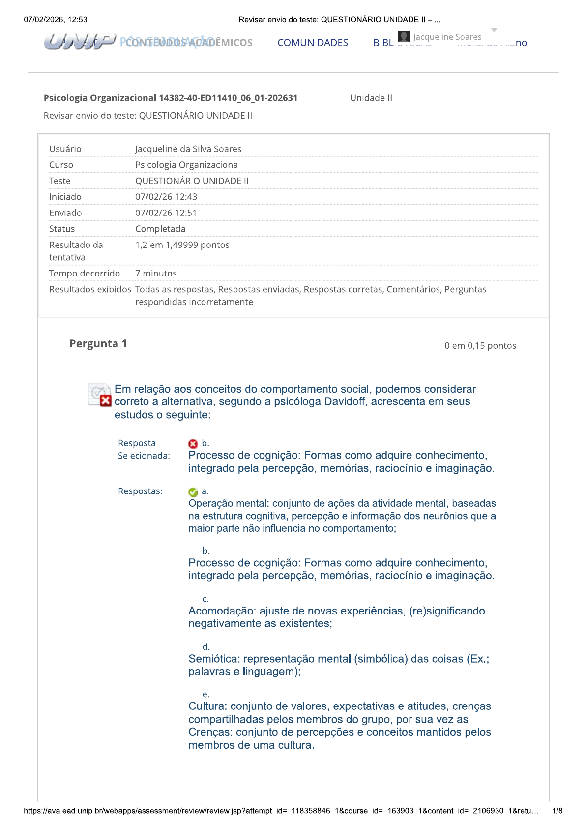 07/02/2026, 12:53 Revisar envio do teste: QUESTIONÁRIO UNIDADE UNIP Jacqueline Soares COMUNIDADES BIBL. no Psicologia Organizacional 14382-40-ED11410_06_01-202631 Unidade Revisar envio do teste: QUESTIONÁRIO UNIDADE Usuário Jacqueline da Silva Soares Curso Psicologia Organizacional Teste QUESTIONÁRIO UNIDADE Iniciado 07/02/26 12:43 Enviado 07/02/26 12:51 Status Completada Resultado da 1,2 em 1,49999 pontos tentativa Tempo decorrido 7 minutos Resultados exibidos Todas as respostas, Respostas enviadas, Respostas corretas, Comentários, Perguntas respondidas incorretamente Pergunta 1 0 em 0,15 pontos Em relação aos conceitos do comportamento social, podemos considerar correto a alternativa, segundo a psicóloga Davidoff, acrescenta em seus estudos seguinte: Resposta b. Selecionada: Processo de cognição: Formas como adquire conhecimento, integrado pela percepção, memórias, raciocínio e imaginação. Respostas: a. Operação mental: conjunto de ações da atividade mental, baseadas na estrutura cognitiva, percepção e informação dos neurônios que a maior parte não influencia no comportamento; b. Processo de cognição: Formas como adquire conhecimento, integrado pela percepção, memórias, raciocínio e imaginação. Acomodação: ajuste de novas experiências, (re)significando negativamente as existentes; d. Semiótica: representação mental (simbólica) das coisas (Ex.; palavras e linguagem); e. Cultura: conjunto de valores, expectativas e atitudes, crenças compartilhadas pelos membros do grupo, por sua vez as Crenças: conjunto de percepções e conceitos mantidos pelos membros de uma cultura. 1/807/02/2026, 12:53 Revisar envio do teste: QUESTIONÁRIO UNIDADE Pergunta 2 0,15 em 0,15 pontos Para psicólogo norte americano Willian Sheldon (1898-1977), as características são variadas, desde as emoções da pessoa sanguínea até ao seu comportamento no seu papel social, no trabalho e diversas profissões. Sendo assim é incorreto afirmar que Perfil Físico Fisionômico e Temperamento de uma pessoa, em qual alternativa? Resposta d. Selecionada: A classificação Mesomorfo são as pessoas com esse tipo corporal são geralmente mais pré dispostas a um maior acúmulo de gorduras. Conhecidas por terem um visual menos definido, é mais difícil para elas conseguirem um corpo em forma através de exercícios Respostas: a. A classificação Mesomorfo são aqueles mais bem dotados geneticamente e mais pré-dispostos a terem maiores ganhos musculares b. A classificação Ectomorfo são pessoas difícil de ganhar peso, pernas e braços compridos, pequena porcentagem de gordura corporal e poucos músculos. É tipo de corpo onde predominam os sobre tecido adiposo e os músculos A classificação Endomorfo são as pessoas com esse tipo corporal são geralmente mais pré dispostas a um maior acúmulo de gorduras. Conhecidas por terem um visual menos definido, é mais difícil para elas conseguirem um corpo em forma através de exercícios d. A classificação Mesomorfo são as pessoas com esse tipo corporal são geralmente mais pré dispostas a um maior acúmulo de gorduras. Conhecidas por terem um visual menos definido, é mais difícil para elas conseguirem um corpo em forma através de exercícios e. Cada pessoa tem determinadas características fisiológicas e morfológicas, que depende do predomínio do tecido adiposo, muscular ou de ossos Pergunta 3 0,15 em 0,15 pontos Nosso cérebro é formado por dois hemisférios, esquerdo responsável pela lógica e organização de nossas atitudes e, hemisfério direito, ligado a criatividade e emoções. Da mesma forma que empresário para manter ponto de equilíbrio entre o que gasta e o que ganha, ser humano também deve estabelecer ponto de 2/807/02/2026, 12:53 Revisar envio do teste: QUESTIONÁRIO UNIDADE equilíbrio entre a lógica e a emoção ou, a inteligência emocional., reproduzido. Qual a alternativa considerada incorreta? Resposta a. Selecionada: A fazer a correlação entre os hemisférios cerebrais e a produtividade estamos nos referindo apenas a atividade laboral. Respostas: a. A fazer a correlação entre os hemisférios cerebrais e a produtividade estamos nos referindo apenas a atividade laboral. b. Pensando na produtividade, quando tem na eficiência a lógica (Conhecimento, Experiência e a interpretação dos fatos através da percepção, sensação e cognição) e não basta produzir, tem que ter qualidade, ou eficácia (Vocação, Atitudes e Motivação). É complexo manter a produtividade se não estabelecer um ambiente de equilíbrio emocional, papel dos psicólogos organizacional. d. trabalho dos líderes na condução dos processos de transição e mudança, são essenciais nas questões que envolve inovação no cenário contemporâneo. e. Quando fazemos a correlação entre os hemisférios cerebrais e a produtividade estamos nos referindo performance e a atividade laboral. Comentário da resposta: pag. 34, mod. 02 Pergunta 4 0,15 em 0,15 pontos psicólogo alemão Hans Eysenck nas Teorias: Neuroticismo, Extroversão e Introversão, baseadas em genética e temperamento, tem como principal foco temperamento que ele viu como padrões de longo prazo de comportamento. Sua abordagem é enquadrada dentro da teoria do traço, que pressupõe que: Resposta a. Selecionada: comportamento é determinado por atributos relativamente estáveis, que são as unidades fundamentais da personalidade, porque predispõem a pessoa a agir de determinada maneira. Respostas: a. comportamento é determinado por atributos relativamente estáveis, que são as unidades fundamentais da personalidade, porque predispõem a pessoa a agir de determinada maneira. 3/807/02/2026, 12:53 Revisar envio do teste: QUESTIONÁRIO UNIDADE b. Os traços não devem ser consistentes em todas as situações e ao longo do tempo, todavia não variam entre os indivíduos. C. comportamento é determinado apenas pelos traços natos as unidades fundamentais da person