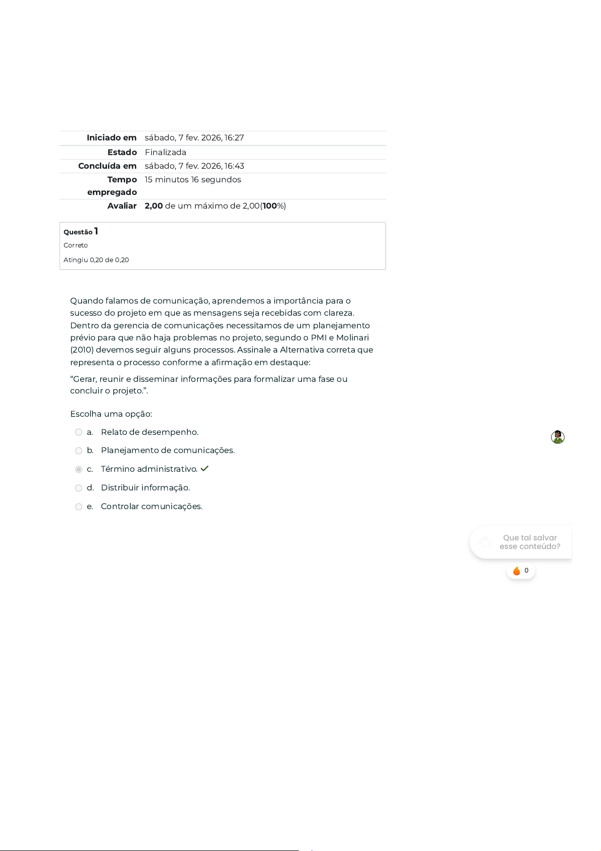 Iniciado em sábado, 7 fev. 2026, 16:27 Estado Finalizada Concluída em sábado, 7 fev. 2026, 16:43 Tempo empregado 15 minutos 16 segundos Avaliar 2,00 de um máximo de 2,00(100%) Questão 1 Correto Atingiu 0,20 de 0,20 Quando falamos de comunicação, aprendemos a importância para o sucesso do projeto em que as mensagens seja recebidas com clareza. Dentro da gerencia de comunicações necessitamos de um planejamento prévio para que não haja problemas no projeto, segundo o PMI e Molinari (2010) devemos seguir alguns processos. Assinale a Alternativa correta que representa o processo conforme a afirmação em destaque: “Gerar, reunir e disseminar informações para formalizar uma fase ou concluir o projeto.”. Escolha uma opção: a. Relato de desempenho. b. Planejamento de comunicações. c. Término administrativo. ✓ d. Distribuir informação. e. Controlar comunicações. Que tal salvar esse conteúdo? 0 Questão 2 Correto Atingiu 0,20 de 0,20 Questão 3 Correto Atingiu 0,20 de 0,20 Determinar o Taxa Interna de Retorno (TIR), para uma taxa efetiva de 10% ao ano no regime de juros composto. Assinale a alternativa aproximadamente. Ano Valor (RS) 0 (10.000,00) 1 2.000,00 2 1.000,00 3 5.000,00 4 4.000,00 5 2.000,00 Escolha uma opção: a. 9%. b. 13%. c. 15%. d. 7%. e. 11%. ✓ Suponha um projeto cujo o investimento inicial seja igual a R$ 350.000,00, com prazo de 5 anos. Assuma que o fluxo de receitas gerado ao final do primeiro, seguindo, terceiro, quarto e quinto ano seja igual a R$ 125 mil, R$ 225 mil, R$ 100 mil, R$ 50 mil, R$ 10 mil, respectivamente. Logo o payback simples é: Escolha uma opção: a. 4 anos. b. 1 ano. c. 3 anos. d. 2 anos. ✓ e. 5 anos. Que tal salvar esse conteúdo? Questão 4 Correto Atingiu 0,20 de 0,20 Questão 5 Correto Atingiu 0,20 de 0,20 Quando analisamos a viabilidade econômico-financeira de um projeto, estimamos a perspectiva de desenvolvimento e desempenho do produto e do serviço e os resultados das ações. Quando investem no projeto, esperam um retorno mínimo financeiro sobre o investimento. Qual é a taxa esperada pelos Investidores? Escolha uma opção: a. TIR. b. Payback. c. Nenhuma das alternativas anteriores. d. VPL. e. TMA. ✓ Sabendo que a Gerência Projeto é dividida em várias áreas assinale a alternativa correta conforme a frase em destaque: “São probabilidades de que ocorra algo que não foi desejado ou seja, que saia do planejamento.”. Escolha uma opção: a. Comunicação. b. Qualidade. c. Custos. d. RH. e. Riscos. ✓ Que tal salvar esse conteúdo? Questão 6 Correto Atingiu 0,20 de 0,20 Questão 7 Correto Atingiu 0,20 de 0,20 Suponha um projeto cujo o investimento inicial seja igual a R$ 50.000,00, com prazo de 5 anos. Assuma que o fluxo de receitas gerado ao final do primeiro, seguindo, terceiro, quarto e quinto ano seja igual a R$ 5 mil, R$ 10 mil, R$ 15 mil, R$ 20 mil, R$ 10 mil, respectivamente. Logo o payback simples é: Escolha uma opção: a. 5 anos. b. 2 anos. c. 1 ano. d. 3 anos. e. 4 anos. ✓ Suponha um projeto cujo o investimento inicial seja igual a R$ 100.000,00, com prazo de 5 anos. Assuma que o fluxo de receitas gerado ao final do primeiro, seguindo, terceiro, quarto e quinto ano seja igual a R$ 40 mil, R$ 35 mil, R$ 25 mil, R$ 15 mil, R$ 10 mil, respectivamente. Logo o payback simples é: Escolha uma opção: a. 1 ano. b. 4 anos. c. 3 anos. ✓ d. 2 anos. e. 5 anos. Que tal salvar esse conteúdo? Questão 8 Correto Atingiu 0,20 de 0,20 Questão 9 Correto Atingiu 0,20 de 0,20 “Em quanto tempo demora para o investidor reaver seu investimento no projeto.”. Estamos falando do: Escolha uma opção: a. Taxa mínima de atratividade. b. Taxa interna de retorno. c. Payback. ✓ d. Nenhuma das alternativas anteriores. e. Valor presente líquido. Determinada empresa está analisando a implantação de uma nova maquina no setor industrial, sabendo que o investidor espera uma Taxa mínima de atratividade de 5%, e um retorno em no máximo 4 anos do investimento, assinale a alternativa correta: Ano Valor (RS) 0 (1.000,00) 1 300,00 2 200,00 3 150,00 4 200,00 5 300,00 Escolha uma opção: a. A empresa deverá executar o projeto, pois o TIR está acima da TMA. b. A empresa não deverá executar o projeto, pois a TIR está acima da TMA. c. A empresa não deverá executar o projeto, pois o retorno do investimento não está dentro das condições estabelecidas pelo investidor. ✓ d. A empresa deverá executar o projeto, pois o payback descontado é de 3 anos. e. A empresa deverá executar o projeto, pois a VPL está negativa. Que tal salvar esse conteúdo? Questão 10 Correto Atingiu 0,20 de 0,20 Determinar o Fluxo de Caixa (VPL), para uma taxa efetiva de 10% ao ano no regime de juros composto. Ano Valor (RS) 0 (10.000,00) 1 2.000,00 2 1.000,00 3 5.000,00 4 4.000,00 5 2.000,00 Escolha uma opção: a. R$ 15.000,00. b. R$ 12.375,10. c. R$ 12.000,00. d. R$ 375,10. ✓ e. R$ 10.375,10. Que tal salvar esse conteúdo?