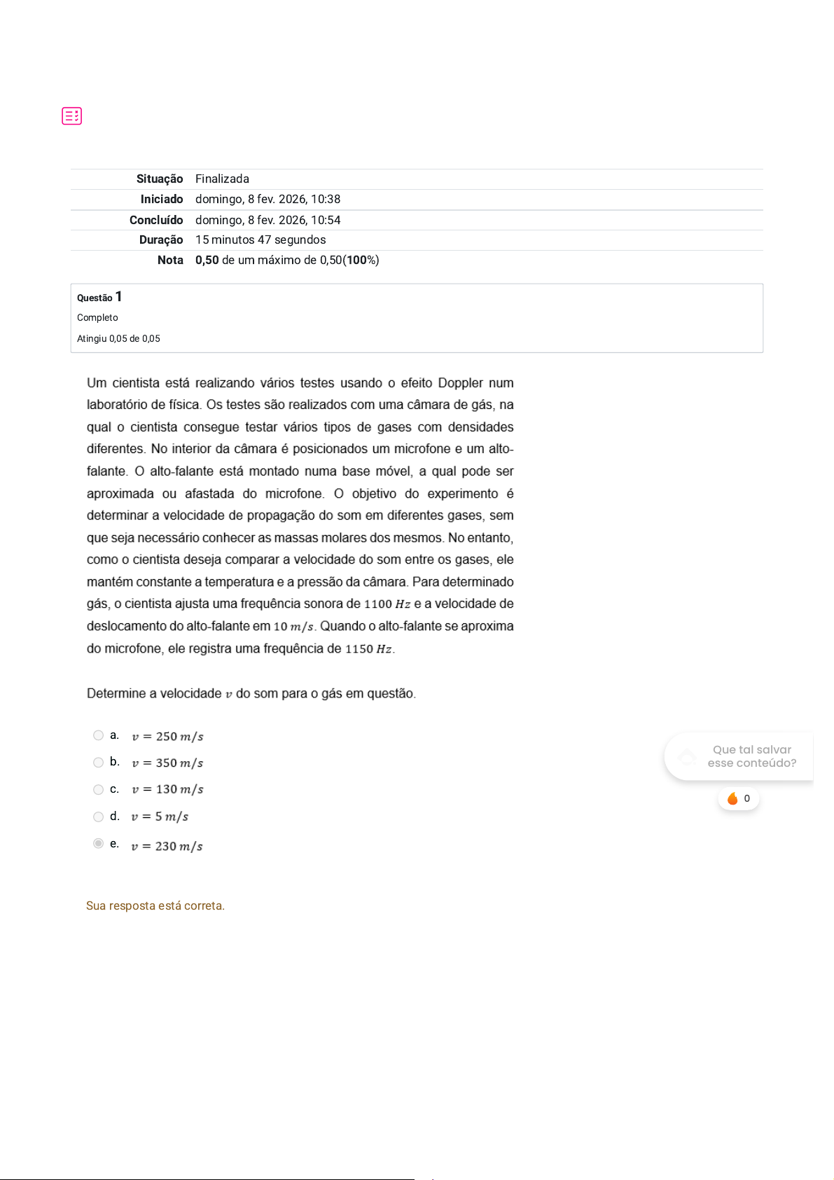 Situação Finalizada Iniciado domingo, 8 fev. 2026, 10:38 Concluído domingo, 8 fev. 2026, 10:54 Duração 15 minutos 47 segundos Nota 0,50 de um máximo de 0,50(100%) Questão 1 Completo Atingiu 0,05 de 0,05 a. b. c. d. e. Sua resposta está correta. Que tal salvar esse conteúdo? 0 Questão 2 Completo Atingiu 0,05 de 0,05 a. b. c. d. e. Sua resposta está correta. Que tal salvar esse conteúdo? Questão 3 Completo Atingiu 0,05 de 0,05 Questão 4 Completo Atingiu 0,05 de 0,05 a. b. c. d. e. Sua resposta está correta. a. b. c. d. e. Sua resposta está correta. Que tal salvar esse conteúdo? Questão 5 Completo Atingiu 0,05 de 0,05 a. b. c. d. e. Sua resposta está correta. Que tal salvar esse conteúdo? Questão 6 Completo Atingiu 0,05 de 0,05 a. b. c. d. e. Sua resposta está correta. Que tal salvar esse conteúdo? Questão 7 Completo Atingiu 0,05 de 0,05 Questão 8 Completo Atingiu 0,05 de 0,05 a. b. c. d. e. Sua resposta está correta. a. b. c. d. e. Sua resposta está correta. Que tal salvar esse conteúdo? Questão 9 Completo Atingiu 0,05 de 0,05 a. b. c. d. e. Sua resposta está correta. Que tal salvar esse conteúdo? Questão 10 Completo Atingiu 0,05 de 0,05 a. b. c. d. e. Sua resposta está correta. Que tal salvar esse conteúdo?