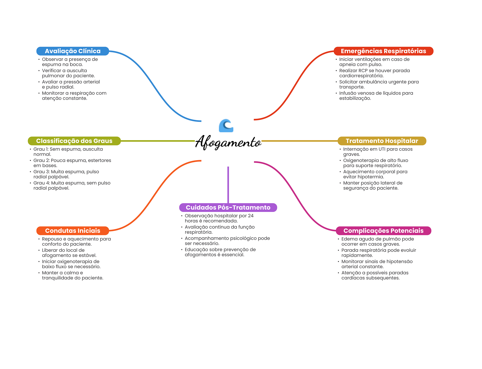 Avaliação Clínica Emergências Respiratórias Observar a presença de Iniciar ventilações em caso de espuma na boca. apneia com pulso. Verificar a ausculta Realizar RCP se houver parada pulmonar do paciente. cardiorrespiratória. Avaliar a pressão arterial Solicitar ambulância urgente para e pulso radial. transporte. Monitorar a respiração com Infusão venosa de líquidos para atenção constante. estabilização. Classificação dos Graus Afogamento Tratamento Hospitalar Grau 1: Sem espuma, ausculta Internação em UTI para casos normal. graves. Grau 2: Pouca espuma, estertores Oxigenoterapia de alto fluxo em bases. para suporte respiratório. Grau 3: Muita espuma, pulso Aquecimento corporal para radial palpável. evitar hipotermia. Grau 4: Muita espuma, sem pulso Manter posição lateral de radial palpável. segurança do paciente. Cuidados Pós-Tratamento Observação hospitalar por 24 horas é recomendada. Avaliação contínua da função Condutas Iniciais respiratória. Complicações Potenciais Repouso e aquecimento para Acompanhamento psicológico pode Edema agudo de pulmão pode conforto do paciente. ser necessário. ocorrer em casos graves. Liberar do local de Educação sobre prevenção de Parada respiratória pode evoluir afogamento se estável. afogamentos é essencial. rapidamente. Iniciar oxigenoterapia de Monitorar sinais de hipotensão baixo fluxo se necessário. arterial constante. Manter a calma e Atenção a possíveis paradas tranquilidade do paciente. cardíacas subsequentes.