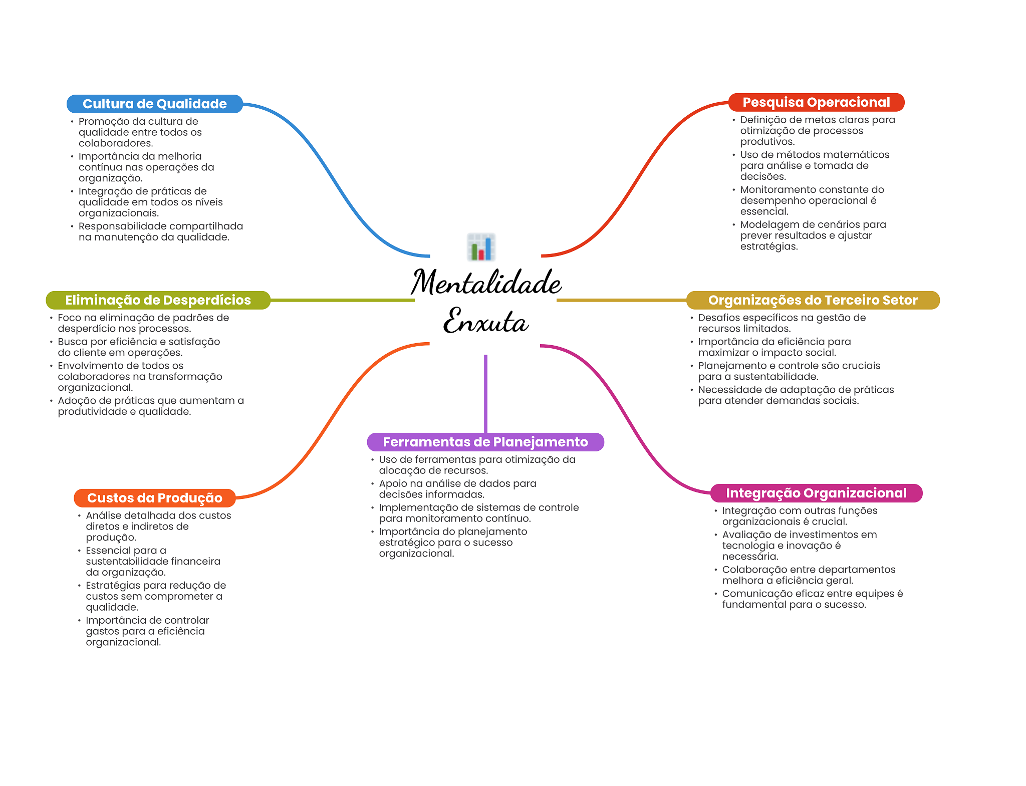 Cultura de Qualidade Pesquisa Operacional Promoção da cultura de Definição de metas claras para qualidade entre todos otimização de processos colaboradores. produtivos. Importância da melhoria Uso de métodos matemáticos contínua nas operações da para análise e tomada de organização. decisões. Integração de práticas de Monitoramento constante do qualidade em todos níveis desempenho operacional é organizacionais. essencial. Responsabilidade compartilhada Modelagem de cenários para na manutenção da qualidade. prever resultados e ajustar estratégias. Mentalidade Eliminação de Desperdícios Organizações do Terceiro Setor Foco na eliminação de padrões de Enxuta Desafios específicos na gestão de desperdício nos processos. recursos limitados. Busca por eficiência e satisfação Importância da eficiência para do cliente em operações. maximizar O impacto social. Envolvimento de todos Planejamento e controle são cruciais colaboradores na transformação para a sustentabilidade. organizacional. Necessidade de adaptação de práticas Adoção de práticas que aumentam a para atender demandas sociais. produtividade e qualidade. Ferramentas de Planejamento Uso de ferramentas para otimização da alocação de recursos. Apoio na análise de dados para Custos da Produção decisões informadas. Integração Organizacional Implementação de sistemas de controle Análise detalhada dos custos Integração com outras funções para monitoramento contínuo. diretos e indiretos de organizacionais é crucial. Importância do planejamento produção. Avaliação de investimentos em estratégico para sucesso Essencial para a tecnologia e inovação é organizacional. sustentabilidade financeira necessária. da organização. Colaboração entre departamentos Estratégias para redução de melhora a eficiência geral. custos sem comprometer a Comunicação eficaz entre equipes é qualidade. fundamental para O sucesso. Importância de controlar gastos para a eficiência organizacional.
