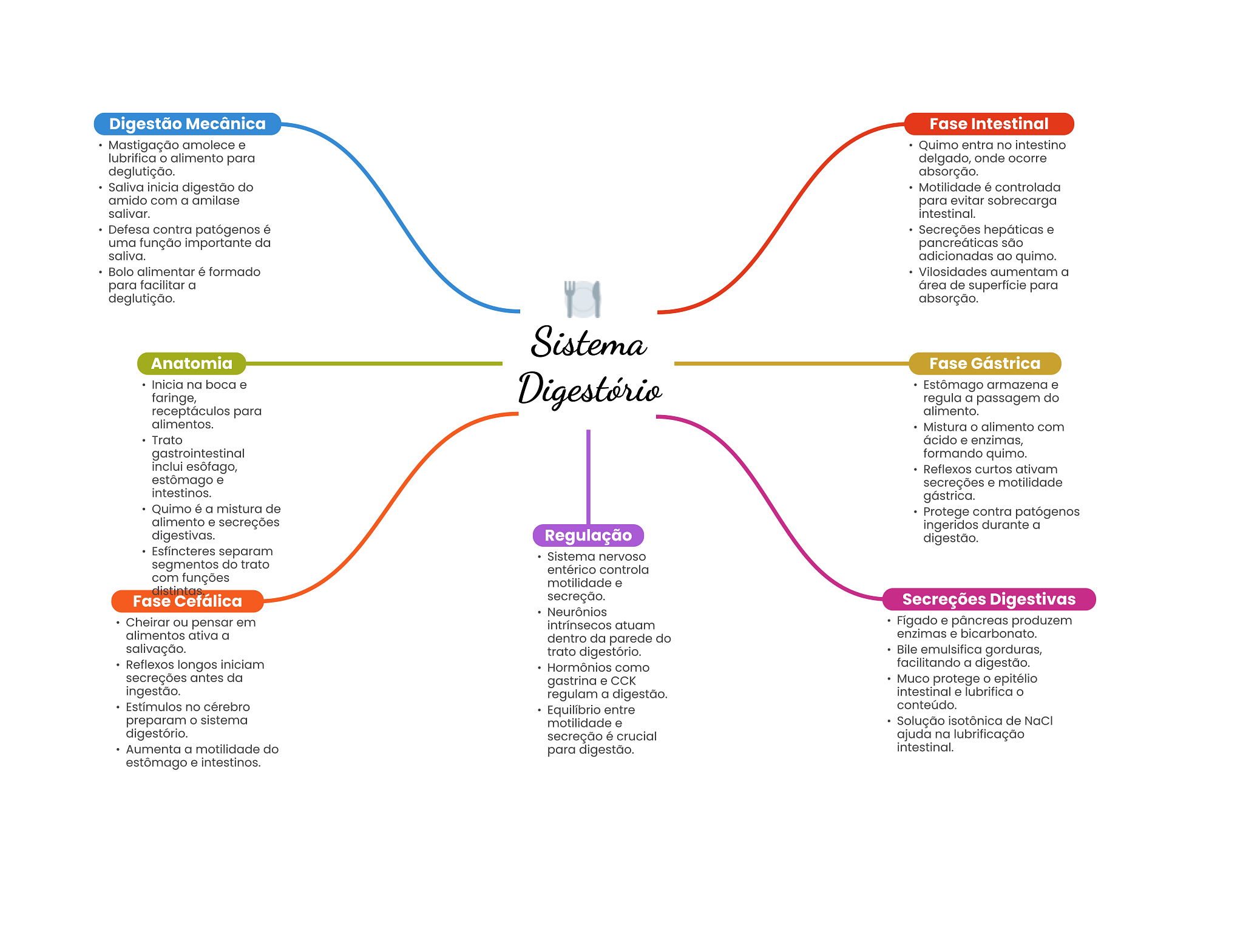 Digestão Mecânica Fase Intestinal Mastigação amolece e Quimo entra no intestino lubrifica alimento para delgado, onde ocorre deglutição. absorção. Saliva inicia digestão do Motilidade é controlada amido com a amilase para evitar sobrecarga salivar. intestinal. Defesa contra patógenos é Secreções hepáticas e uma função importante da pancreáticas são saliva. adicionadas ao quimo. Bolo alimentar é formado Vilosidades aumentam a para facilitar a área de superfície para deglutição. absorção. Sistema Anatomia Fase Gástrica Inicia na boca e faringe, Digestório Estômago armazena e regula a passagem do receptáculos para alimento. alimentos. Mistura alimento com Trato ácido e enzimas, gastrointestinal formando quimo. inclui esôfago, Reflexos curtos ativam estômago e secreções e motilidade intestinos. gástrica. Quimo é a mistura de Protege contra patógenos alimento e secreções ingeridos durante a digestivas. Regulação digestão. Esfíncteres separam Sistema nervoso segmentos do trato entérico controla com funções motilidade e distintas Fase Cefálica secreção. Secreções Digestivas Neurônios Cheirar ou pensar em intrínsecos atuam Fígado e pâncreas produzem alimentos ativa a dentro da parede do enzimas e bicarbonato. salivação. trato digestório. Bile emulsifica gorduras, Reflexos longos iniciam Hormônios como facilitando a digestão. secreções antes da gastrina e Muco protege epitélio ingestão. regulam a digestão. intestinal e lubrifica Estímulos no cérebro Equilíbrio entre conteúdo. preparam sistema motilidade e Solução isotônica de NaCl digestório. secreção é crucial ajuda na lubrificação Aumenta a motilidade do para digestão. intestinal. estômago e intestinos.