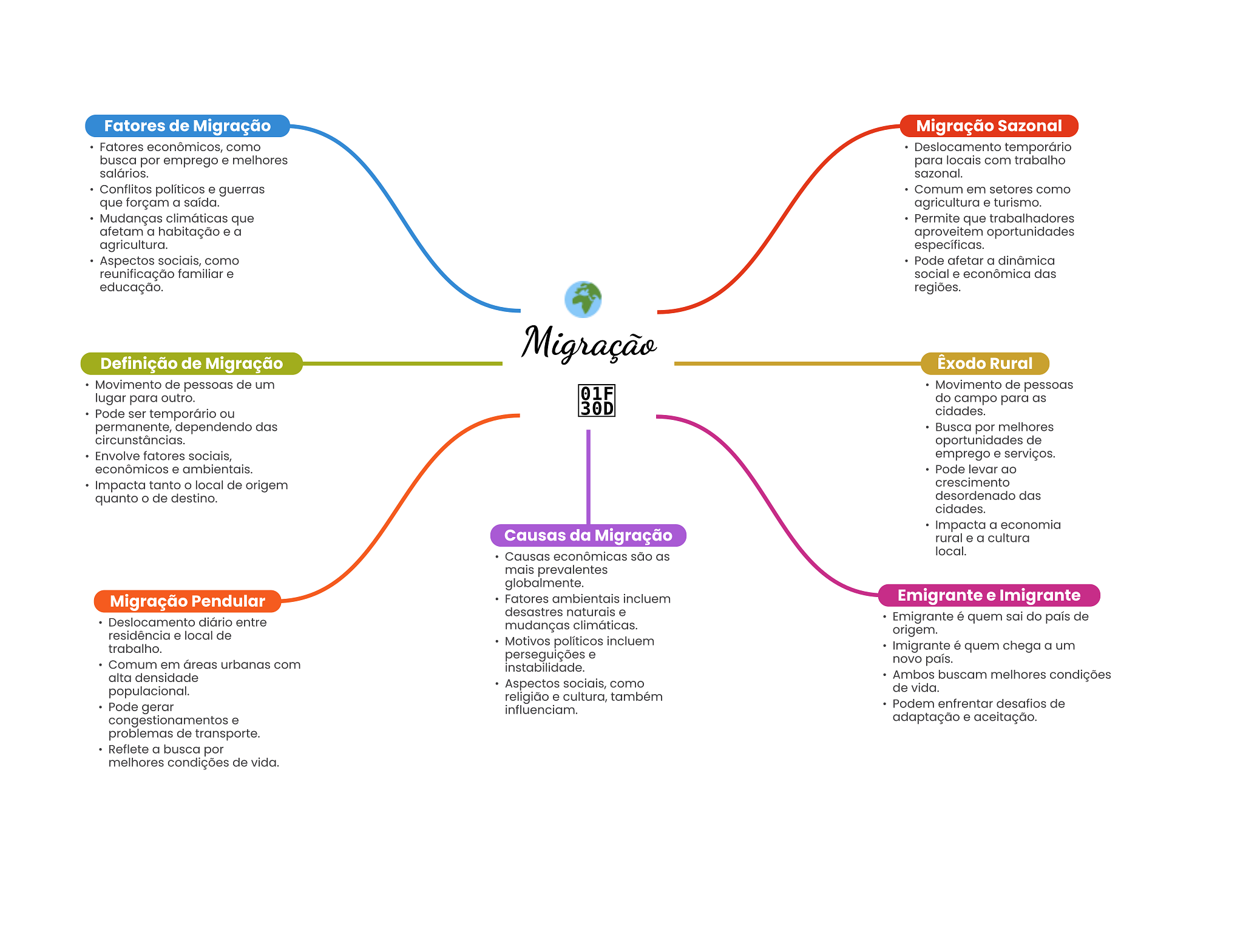 Fatores de Migração Migração Sazonal Fatores econômicos, como Deslocamento temporário busca por emprego e melhores para locais com trabalho salários. sazonal. Conflitos políticos e guerras Comum em setores como que forçam a saída. agricultura e turismo. Mudanças climáticas que Permite que trabalhadores afetam a habitação e a aproveitem oportunidades agricultura. específicas. Aspectos sociais, como Pode afetar a dinâmica reunificação familiar e social e econômica das educação. regiões. Migração Definição de Migração Êxodo Rural Movimento de pessoas de um Movimento de pessoas lugar para outro. 01F do campo para as Pode ser temporário ou 30D cidades. permanente, dependendo das Busca por melhores circunstâncias. oportunidades de Envolve fatores sociais, emprego e serviços. econômicos e ambientais. Pode levar ao Impacta tanto local de origem crescimento quanto de destino. desordenado das cidades. Impacta a economia Causas da Migração rural e a cultura Causas econômicas são as local. mais prevalentes globalmente. Migração Pendular Fatores ambientais incluem Emigrante e Imigrante desastres naturais e Deslocamento diário entre Emigrante é quem sai do país de mudanças climáticas. residência e local de origem. trabalho. Motivos políticos incluem Imigrante é quem chega a um perseguições e Comum em áreas urbanas com novo país. instabilidade. alta densidade Ambos buscam melhores condições Aspectos sociais, como populacional. de vida. religião e cultura, também Pode gerar Podem enfrentar desafios de influenciam. congestionamentos e adaptação e aceitação. problemas de transporte. Reflete a busca por melhores condições de vida.