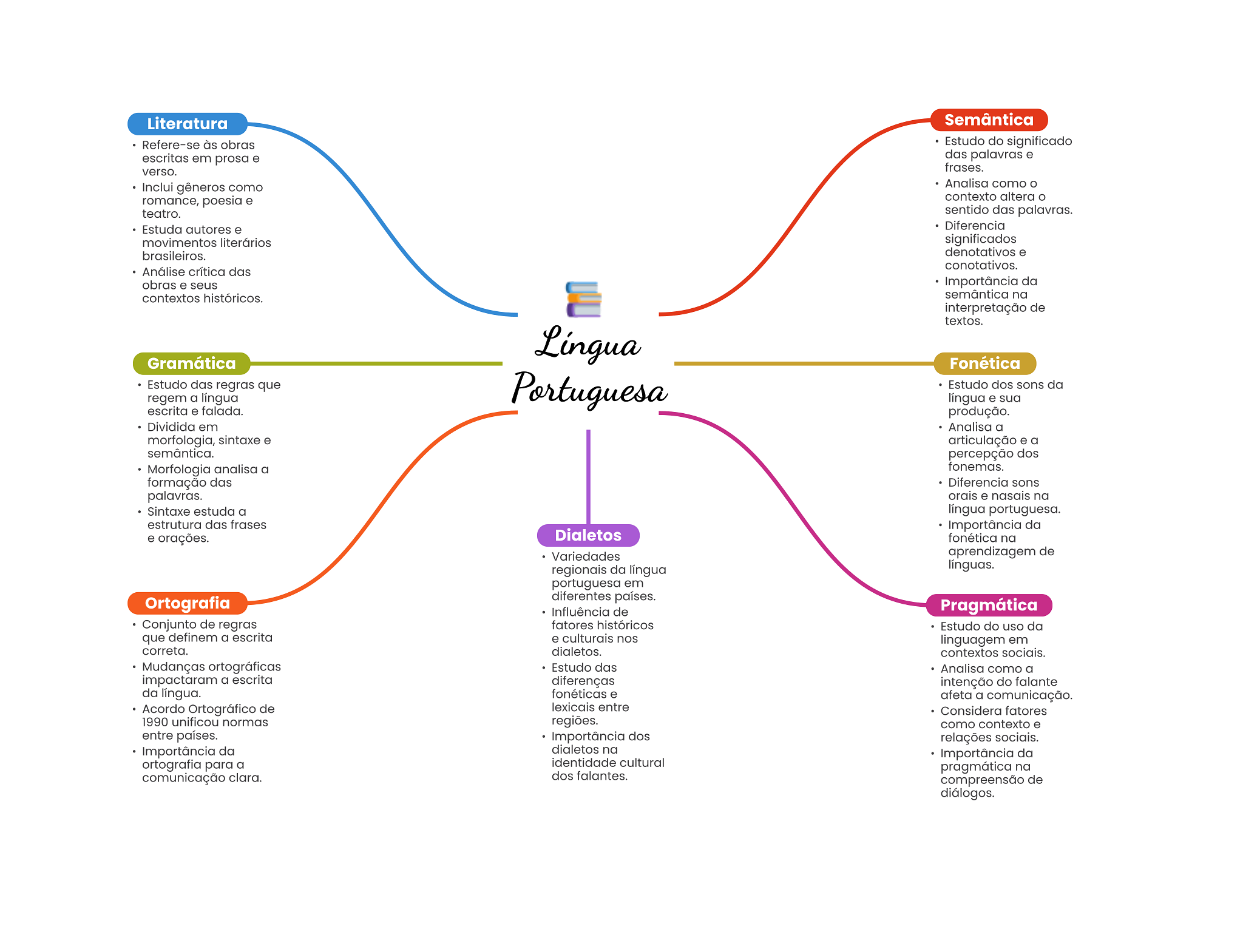 Literatura Semântica Refere-se às obras Estudo do significado escritas em prosa e das palavras e verso. frases. Inclui gêneros como Analisa como romance, poesia e contexto altera teatro. sentido das palavras. Estuda autores e Diferencia movimentos literários significados brasileiros. denotativos e Análise crítica das conotativos. obras e seus Importância da contextos históricos. semântica na interpretação de textos. Língua Gramática Fonética Estudo das regras que regem a língua Portuguesa Estudo dos sons da língua e sua escrita e falada. produção. Dividida em Analisa a morfologia, sintaxe e articulação e a semântica. percepção dos Morfologia analisa a fonemas. formação das Diferencia sons palavras. orais e nasais na Sintaxe estuda a língua portuguesa. estrutura das frases Importância da e orações. Dialetos fonética na Variedades aprendizagem de regionais da língua línguas. portuguesa em Ortografia diferentes países. Influência de Pragmática Conjunto de regras fatores históricos Estudo do uso da que definem a escrita e culturais nos linguagem em correta. dialetos. contextos sociais. Mudanças ortográficas Estudo das Analisa como a impactaram a escrita diferenças intenção do falante da língua. fonéticas e afeta a comunicação. Acordo Ortográfico de lexicais entre Considera fatores 1990 unificou normas regiões. como contexto e entre países. Importância dos relações sociais. Importância da dialetos na Importância da ortografia para a identidade cultural pragmática na comunicação clara. dos falantes. compreensão de diálogos.