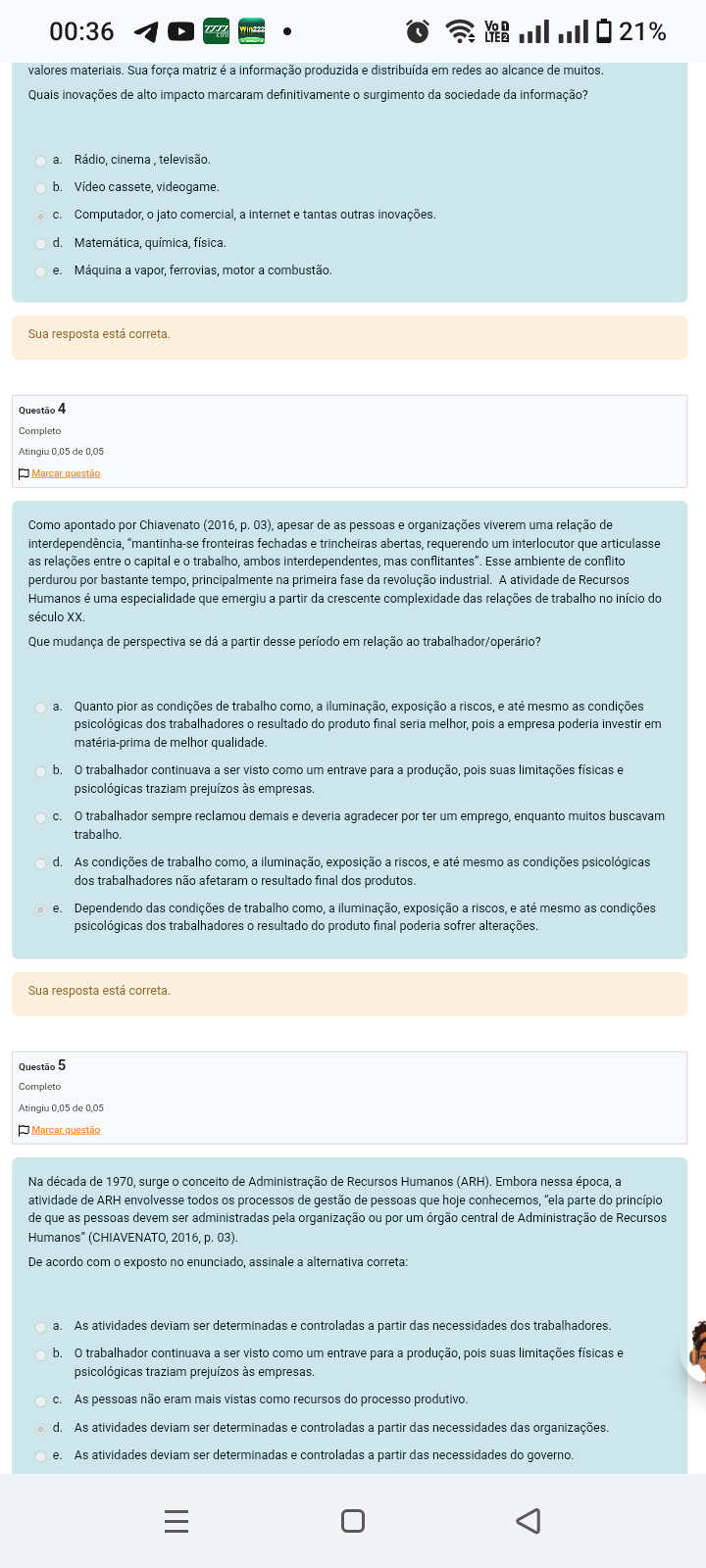 00:36 21% valores materiais. Sua força matriz é a informação produzida e distribuída em redes ao alcance de muitos. Quais inovações de alto impacto marcaram definitivamente 0 surgimento da sociedade da informação? a. Rádio, cinema televisão. b. cassete, videogame. Computador, 0 jato comercial, a internet e tantas outras inovações. d. Matemática, química, física. e. Máquina a vapor, ferrovias, motor a Sua resposta está correta. Questão 4 Completo Atingiu 0,05 de 0,05 Marcar questão Como apontado por Chiavenato (2016, p. 03), apesar de as pessoas e organizações viverem uma relação de interdependência, "mantinha-se fronteiras fechadas e trincheiras abertas, requerendo um interlocutor que articulasse as relações entre capital e 0 trabalho, ambos interdependentes, mas Esse ambiente de conflito perdurou por bastante tempo, principalmente na primeira fase da revolução industrial. A atividade de Recursos Humanos é uma especialidade que emergiu a partir da crescente complexidade das relações de trabalho no do século XX. Que mudança de perspectiva se dá a partir desse em relação ao trabalhador/operário? a. Quanto pior as condições de trabalho como, a iluminação, exposição a riscos, e até mesmo as condições psicológicas dos trabalhadores 0 resultado do produto final seria melhor, pois a empresa poderia investir em matéria-prima de melhor qualidade. b. 0 trabalhador continuava a ser visto como um entrave para a produção, pois suas limitações e psicológicas traziam prejuízos às empresas. C. 0 trabalhador sempre reclamou demais e deveria agradecer por ter um emprego, enquanto muitos buscavam trabalho. d. As condições de trabalho como, a iluminação, exposição a riscos, e mesmo as condições psicológicas dos trabalhadores não afetaram resultado final dos produtos. e. Dependendo das condições de trabalho como, a iluminação, exposição a riscos, e até mesmo as condições psicológicas dos trabalhadores 0 resultado do produto final poderia sofrer alterações. Sua resposta está correta. Questão 5 Completo Atingiu 0,05 de 0.05 Marcar questão Na de 1970, surge conceito de Administração de Recursos Humanos (ARH). Embora nessa época, a atividade de ARH envolvesse todos processos de gestão de pessoas que hoje conhecemos, "ela parte do de que as pessoas devem ser administradas pela organização ou por um órgão central de Administração de Recursos Humanos" (CHIAVENATO, 2016, p. 03). De acordo com exposto no enunciado, assinale a alternativa correta: a. As atividades deviam ser determinadas e controladas a partir das necessidades dos b. 0 trabalhador continuava a ser visto como um entrave para a produção, pois suas limitações físicas e psicológicas traziam às empresas. C. As pessoas não eram mais vistas como recursos do processo produtivo. d. As atividades deviam ser determinadas e controladas a partir das necessidades das organizações. e. As atividades deviam ser determinadas e controladas a partir das necessidades do governo.