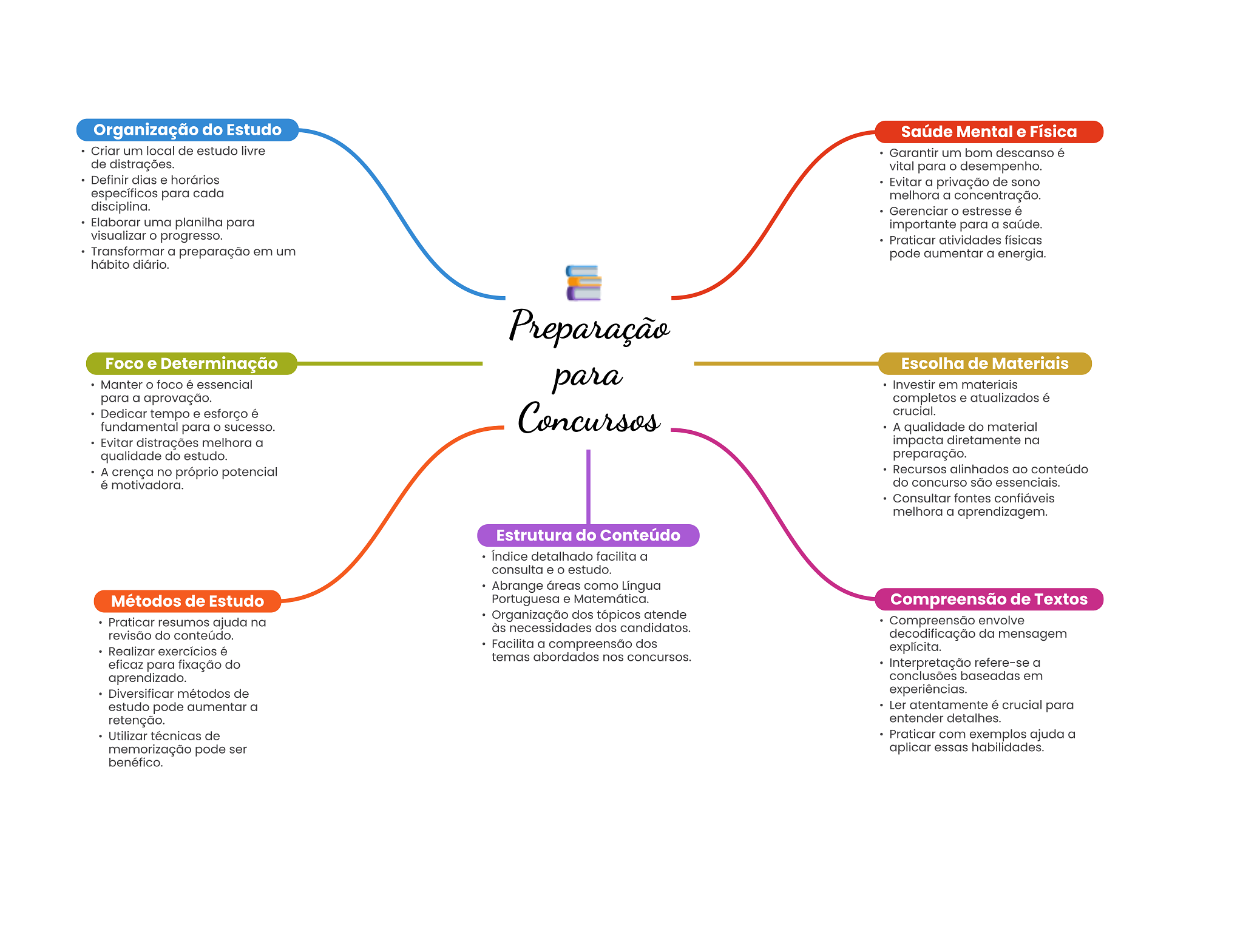 Organização do Estudo Saúde Mental e Física Criar um local de estudo livre Garantir um bom descanso é de distrações. vital para desempenho. Definir dias e horários Evitar a privação de sono específicos para cada melhora a concentração. disciplina. Gerenciar estresse é Elaborar uma planilha para importante para a saúde. visualizar progresso. Praticar atividades físicas Transformar a preparação em um pode aumentar a energia. hábito diário. Preparação Foco e Determinação Escolha de Materiais Manter foco é essencial para Investir em materiais para a aprovação. completos e atualizados é Dedicar tempo e esforço é Concursos crucial. fundamental para sucesso. A qualidade do material Evitar distrações melhora a impacta diretamente na qualidade do estudo. preparação. A crença no próprio potencial Recursos alinhados ao conteúdo é motivadora. do concurso são essenciais. Consultar fontes confiáveis melhora a aprendizagem. Estrutura do Conteúdo Indice detalhado facilita a consulta e estudo. Abrange áreas como Língua Métodos de Estudo Portuguesa e Matemática. Compreensão de Textos Organização dos tópicos atende Praticar resumos ajuda na Compreensão envolve às necessidades dos candidatos. revisão do conteúdo. decodificação da mensagem Facilita a compreensão dos Realizar exercícios é explícita. temas abordados nos concursos. eficaz para fixação do Interpretação refere-se a aprendizado. conclusões baseadas em Diversificar métodos de experiências. estudo pode aumentar a Ler atentamente é crucial para retenção. entender detalhes. Utilizar técnicas de Praticar com exemplos ajuda a memorização pode ser aplicar essas habilidades. benéfico.