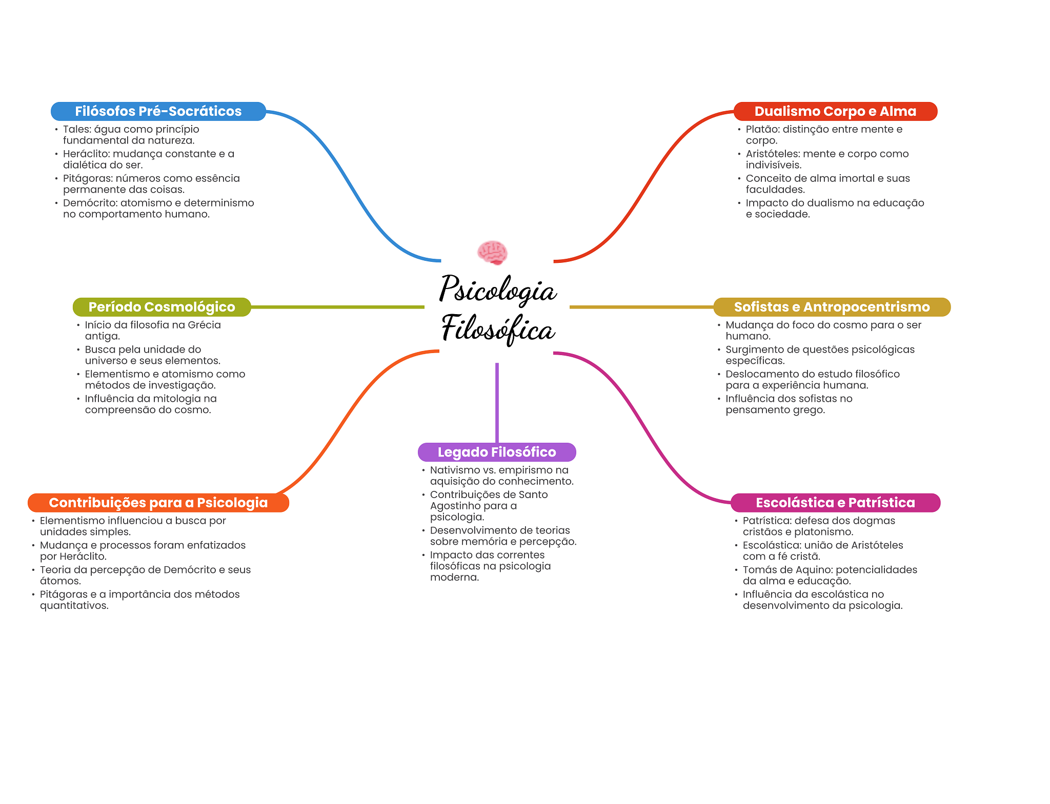 Filósofos Pré-Socráticos Dualismo Corpo e Alma Tales: água como princípio Platão: distinção entre mente e fundamental da natureza. corpo. Heráclito: mudança constante e a Aristóteles: mente e corpo como dialética do ser. indivisíveis. Pitágoras: números como essência Conceito de alma imortal e suas permanente das coisas. faculdades. Demócrito: atomismo e determinismo Impacto do dualismo na educação no comportamento humano. e sociedade. Psicologia Período Cosmológico Sofistas e Antropocentrismo Início da filosofia na Grécia antiga. Filosófica Mudança do foco do cosmo para O ser humano. Busca pela unidade do Surgimento de questões psicológicas universo e seus elementos. específicas. Elementismo e atomismo como Deslocamento do estudo filosófico métodos de investigação. para a experiência humana. Influência da mitologia na Influência dos sofistas no compreensão do cosmo. pensamento grego. Legado Filosófico Nativismo empirismo na aquisição do conhecimento. Contribuições de Santo Contribuições para a Psicologia Agostinho para a Escolástica e Patrística Elementismo influenciou a busca por psicologia. Patrística: defesa dos dogmas unidades simples. Desenvolvimento de teorias cristãos e platonismo. Mudança e processos foram enfatizados sobre memória e percepção. Escolástica: união de Aristóteles por Heráclito. Impacto das correntes com a fé cristã. Teoria da percepção de Demócrito e seus filosóficas na psicologia Tomás de Aquino: potencialidades átomos. moderna. da alma e educação. Pitágoras e a importância dos métodos Influência da escolástica no quantitativos. desenvolvimento da psicologia.