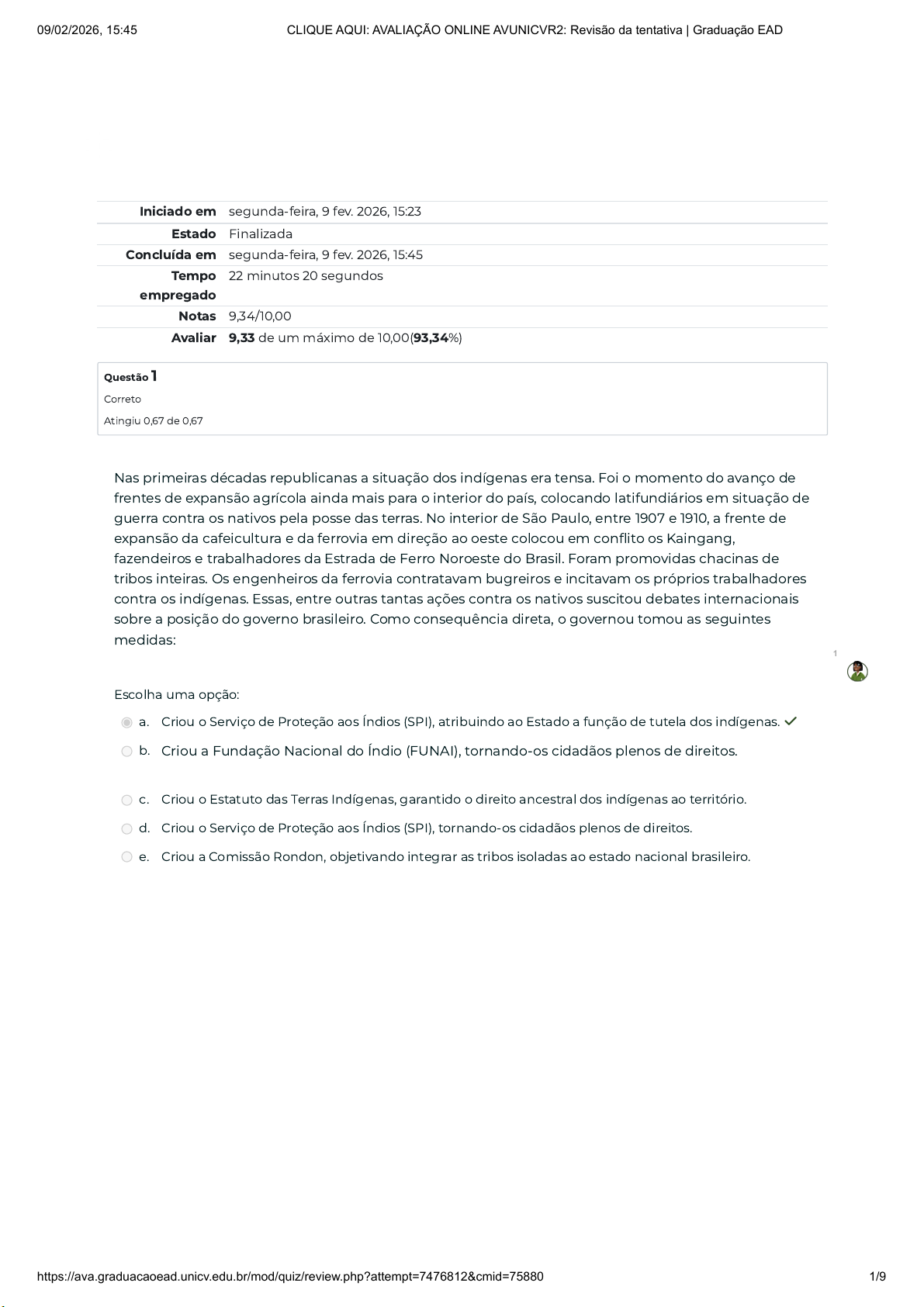 Iniciado em segunda-feira, 9 fev. 2026, 15:23 Estado Finalizada Concluída em segunda-feira, 9 fev. 2026, 15:45 Tempo empregado 22 minutos 20 segundos Notas 9,34/10,00 Avaliar 9,33 de um máximo de 10,00(93,34%) Questão 1 Correto Atingiu 0,67 de 0,67 Nas primeiras décadas republicanas a situação dos indígenas era tensa. Foi o momento do avanço de frentes de expansão agrícola ainda mais para o interior do país, colocando latifundiários em situação de guerra contra os nativos pela posse das terras. No interior de São Paulo, entre 1907 e 1910, a frente de expansão da cafeicultura e da ferrovia em direção ao oeste colocou em conflito os Kaingang, fazendeiros e trabalhadores da Estrada de Ferro Noroeste do Brasil. Foram promovidas chacinas de tribos inteiras. Os engenheiros da ferrovia contratavam bugreiros e incitavam os próprios trabalhadores contra os indígenas. Essas, entre outras tantas ações contra os nativos suscitou debates internacionais sobre a posição do governo brasileiro. Como consequência direta, o governou tomou as seguintes medidas: Escolha uma opção: a. Criou o Serviço de Proteção aos Índios (SPI), atribuindo ao Estado a função de tutela dos indígenas. ✓ b. Criou a Fundação Nacional do Índio (FUNAI), tornando-os cidadãos plenos de direitos. c. Criou o Estatuto das Terras Indígenas, garantido o direito ancestral dos indígenas ao território. d. Criou o Serviço de Proteção aos Índios (SPI), tornando-os cidadãos plenos de direitos. e. Criou a Comissão Rondon, objetivando integrar as tribos isoladas ao estado nacional brasileiro. 1 09/02/2026, 15:45 CLIQUE AQUI: AVALIAÇÃO ONLINE AVUNICVR2: Revisão da tentativa | Graduação EAD https://ava.graduacaoead.unicv.edu.br/mod/quiz/review.php?attempt=7476812&cmid=75880 1/9 Questão 2 Correto Atingiu 0,67 de 0,67 Questão 3 Correto Atingiu 0,67 de 0,67 Foi no governo do paulista Campos Sales (1898-1902) que se estabeleceu um mecanismo de gestão dos interesses políticos das oligarquias regionais para facilitar a administração e superar as possibilidades de aprofundamento das crises econômica e social. A conhecida “política dos governadores” por ele desenvolvida, pode ser descrita da seguinte forma: Escolha uma opção: a. Foi uma estratégia que criou um equilíbrio fiscal entre os estados da federação e, por meio de subsídios, auxiliou os estados e governos locais mais carentes, mantendo-os, assim, fiéis ao governo federal. b. Serviu para desmobilizar o poder dos coronéis que, desde o período imperial, controlavam um amplo eleitorado por meio de práticas clientelistas e de fraude nas eleições. c. Em termos práticos, significou o enfraquecimento do governo federal que, agora, encontrava-se refém do jogo político das oligarquias regionais. d. Em termos práticos, significava um acordo entre o governo federal e os grupos que estivessem no poder nos estados, garantindo apoio no Congresso para as iniciativas do presidente. ✓ e. Foi utilizada para fortalecer a centralização política do período, afastando as forças políticas regionais do presidente da república. A abertura democrática em 1945, com a retomada dos partidos políticos e a realização de eleições diretas, marcou o fim do Estado Novo como regime ditatorial e inseriu Getúlio Vargas como um nome incontornável. A disputa política iniciada naquele momento apresentava características próprias, onde destacamos: Escolha uma opção: a. O predomínio de partidos de esquerda, que, pela primeira vez foram permitidos disputar eleições. b. O predomínio de um partido único que congregava, praticamente, os principais interesses das elites industriais e agrárias do país c. O predomínio do bipartidarismo, representados por Liberais e Conservadores. d. O predomínio de partidos regionais, dominados pelo coronelismo e pelo clientelismo. e. O predomínio de partidos de massa, que, pela primeira vez no Brasil, ganhavam dimensão nacional. ✓ 1 09/02/2026, 15:45 CLIQUE AQUI: AVALIAÇÃO ONLINE AVUNICVR2: Revisão da tentativa | Graduação EAD https://ava.graduacaoead.unicv.edu.br/mod/quiz/review.php?attempt=7476812&cmid=75880 2/9 Questão 4 Correto Atingiu 0,67 de 0,67 Questão 5 Correto Atingiu 0,67 de 0,67 A ruptura da ordem institucional, produzida pelas ações da Aliança Liberal, deram forma a um movimento revolucionário que se colocava como portador das mudanças desejadas por tantos. Ao assumir o poder, ainda de maneira provisória, a liderança desse movimento deu início a um trabalho de artesão, aparando arestas e remodelando o estado de acordo com suas concepções, afastando-se de ações mais radicais. Constitucionalmente eleito, continuou o sistemático processo de burocratização, atraindo para si um poder de decisão dificilmente igualado. Esses acontecimentos se referem: Escolha uma opção: a. Ao movimento tenentista b. A política dos Governadores c. A Ação Integralistas Brasileira d. A revolta Constitucionalista de São Paulo e. A revolução de 1930 ✓ O golpe que deu origem ao Estado Novo foi o momento de consolidação do processo de centralização política e burocrática em curso desde 1930. O objetivo central dessa centralização, além de evitar que os velhos antagonismos políticos entre as oligarquias regionais causassem novas instabilidades políticas e sociais, era o de: Escolha uma opção: a. Atender as reivindicações históricas dos trabalhadores rurais, por meio de um conjunto de leis que regulamentavam o trabalho e os protegia do controle e mandonismo dos latifundiários. b. Retirar o Brasil da área de influência europeia e consolidar as relações econômicas, políticas e culturais com os Estados Unidos. c. Manter o Brasil dependente do setor agroexportador, pilar da economia do país. d. Conduzir um processo de modernização econômica sem ameaçar a ordem social. ✓ e. Conduzir o processo de flexibilização das leis trabalhistas para ajustar as demandas