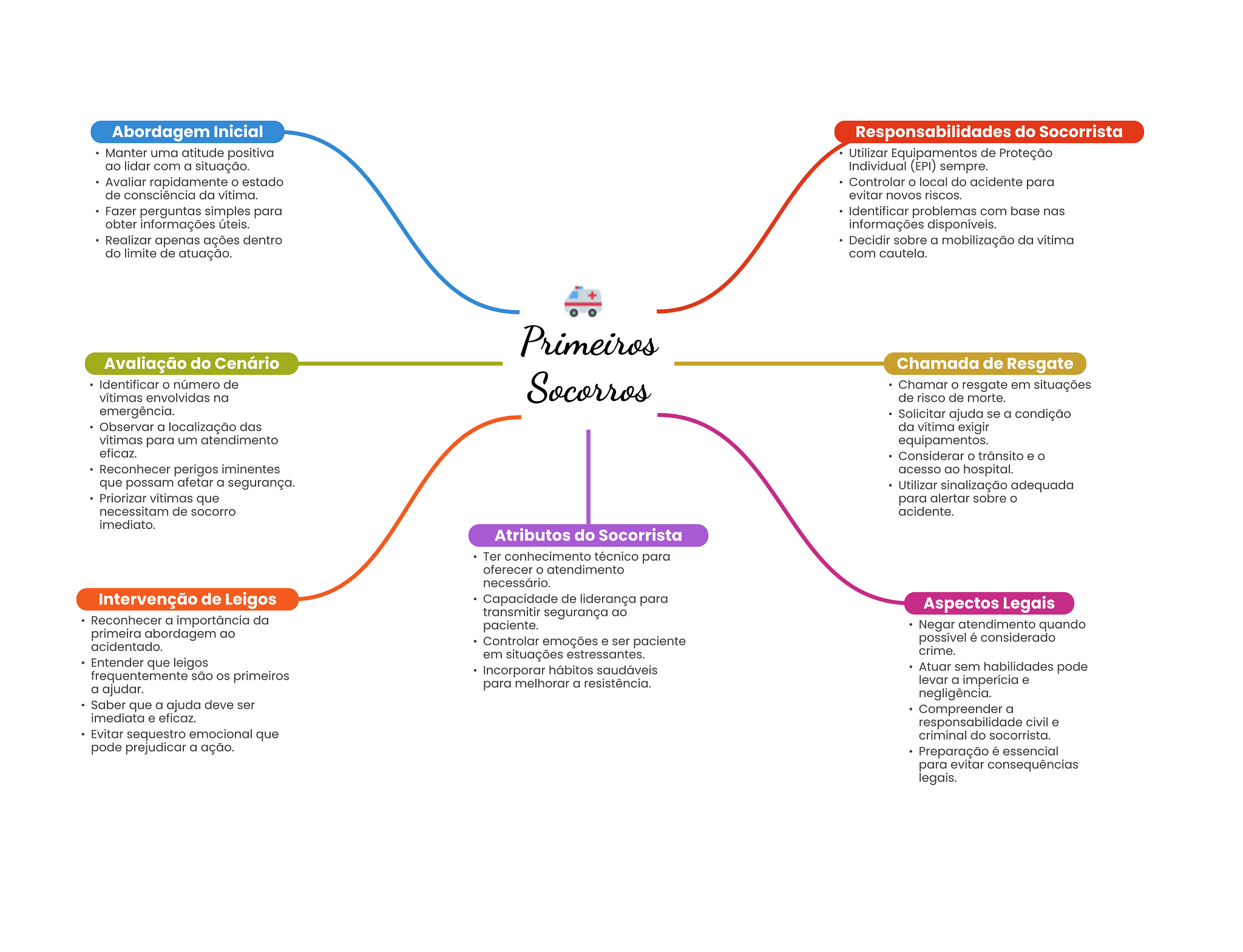 Abordagem Inicial Responsabilidades do Socorrista Manter uma atitude positiva Utilizar Equipamentos de Proteção ao lidar com a situação. Individual sempre. Avaliar rapidamente estado Controlar local do acidente para de consciência da vítima. evitar novos riscos. Fazer perguntas simples para Identificar problemas com base nas obter informações úteis. informações disponíveis. Realizar apenas ações dentro Decidir sobre a mobilização da vítima do limite de atuação. com cautela. Primeiros Avaliação do Cenário Chamada de Resgate Identificar número de Socorros Chamar resgate em situações vítimas envolvidas na de risco de morte. emergência. Solicitar ajuda se a condição Observar a localização das da vítima exigir vítimas para um atendimento equipamentos. eficaz. Considerar trânsito e Reconhecer perigos iminentes acesso ao hospital. que possam afetar a segurança. Utilizar sinalização adequada Priorizar vítimas que para alertar sobre necessitam de socorro acidente. imediato. Atributos do Socorrista Ter conhecimento técnico para oferecer atendimento necessário. Intervenção de Leigos Capacidade de liderança para Aspectos Legais transmitir segurança ao Reconhecer a importância da paciente. Negar atendimento quando primeira abordagem ao acidentado. Controlar emoções e ser paciente possível é considerado em situações estressantes. crime. Entender que leigos Incorporar hábitos saudáveis Atuar sem habilidades pode frequentemente são primeiros para melhorar a resistência. levar a imperícia e a ajudar. negligência. Saber que a ajuda deve ser Compreender a imediata e eficaz. responsabilidade civil e Evitar sequestro emocional que criminal do socorrista. pode prejudicar a ação. Preparação é essencial para evitar consequências legais.