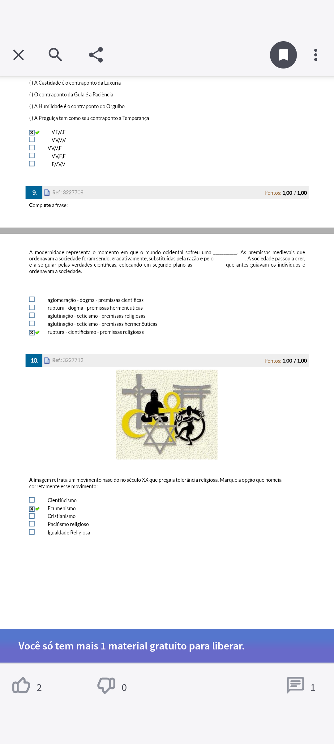 X () A Castidade é contraponto da Luxuria () contraponto da Gula é a Paciência ()A Humildade é contraponto do Orgulho () A Preguiça tem como seu contraponto a Temperança V.F.V.F 9. Ref.: 3227709 Pontos: 1,00 / 1,00 Complete a frase: A modernidade representa O momento em que O mundo ocidental sofreu uma As premissas medievais que ordenavam a sociedade foram sendo, gradativamente, substituídas pela razão e pelo A sociedade passou a crer, e a se guiar pelas verdades científicas, colocando em segundo plano as que antes guiavam indivíduos e ordenavam a sociedade. aglomeração - dogma premissas cientificas ruptura dogma premissas hermenêuticas aglutinação ceticismo premissas religiosas. aglutinação ceticismo premissas hermenêuticas ruptura cientificismo premissas religiosas 10. Ref.: 3227712 Pontos: 1,00 / 1,00 A Imagem retrata um movimento nascido no século XX que prega a tolerância religiosa. Marque a opção que nomeia corretamente esse movimento: Cientificismo Ecumenismo Cristianismo Pacifismo religioso Igualdade Religiosa Você só tem mais 1 material gratuito para liberar. 2 0 1